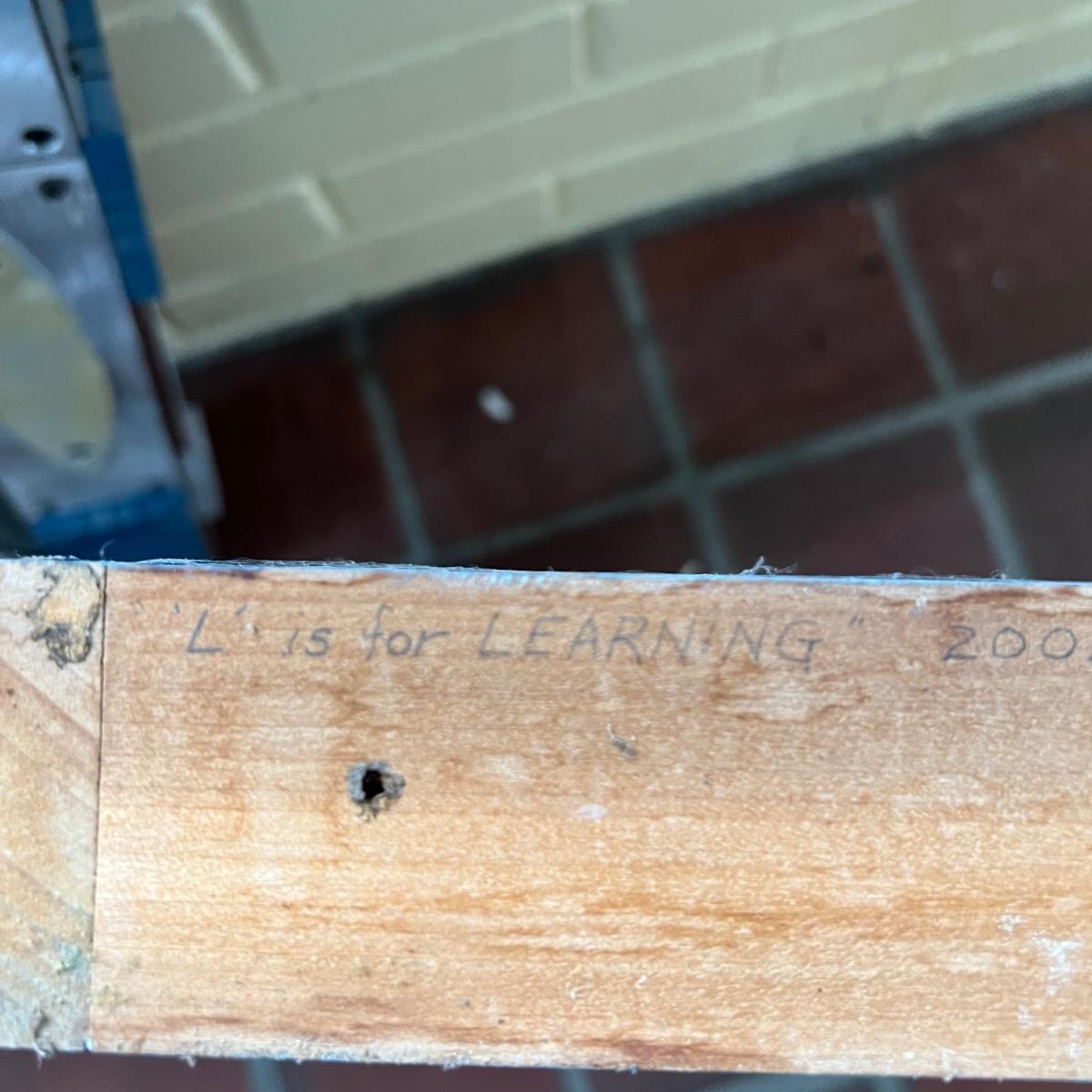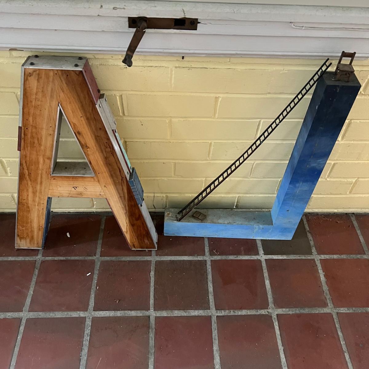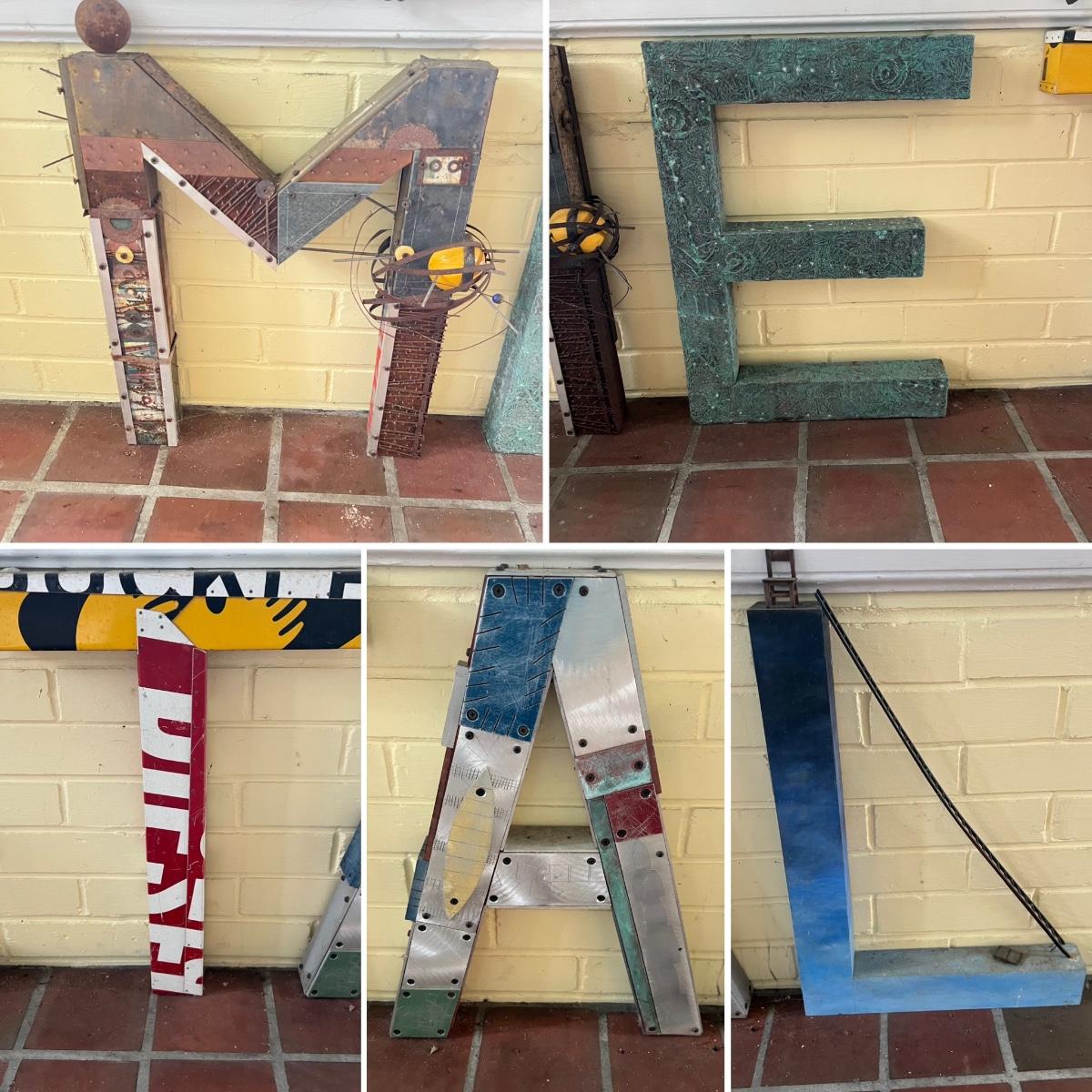 Five large letters made from wood, the M and L letters also have iron embellishments. One letter is titled “L is for Learning” and has three names - Marilyn Da Silva, Jack Da Silver & Tony Esnia.