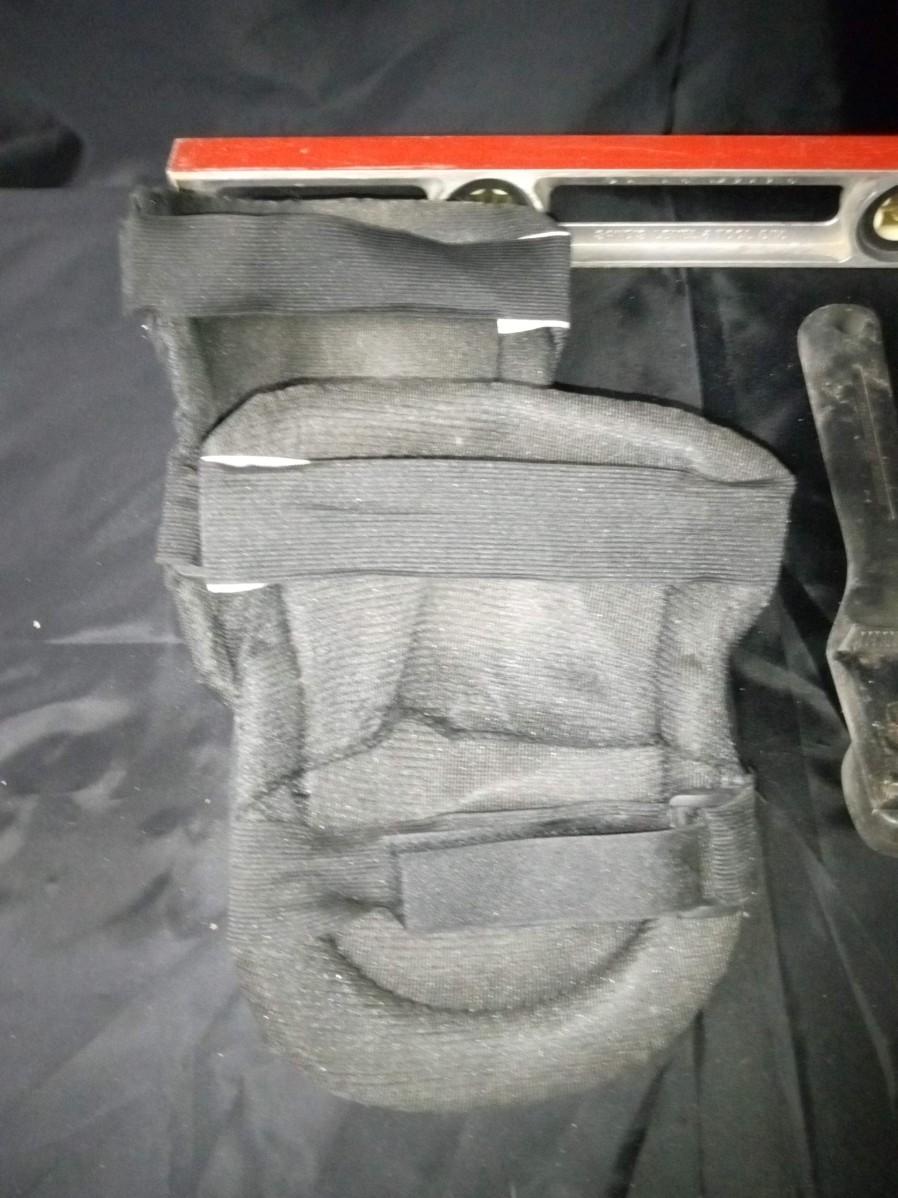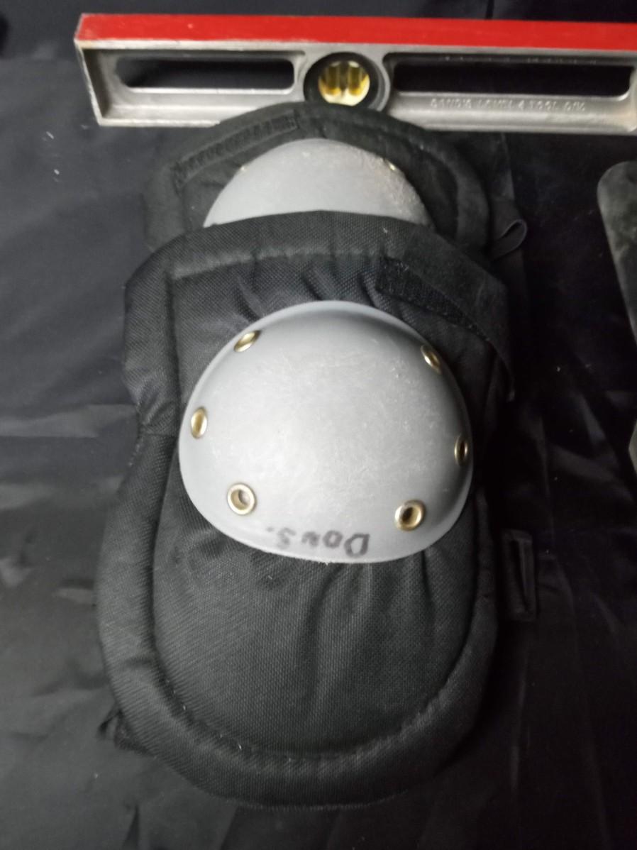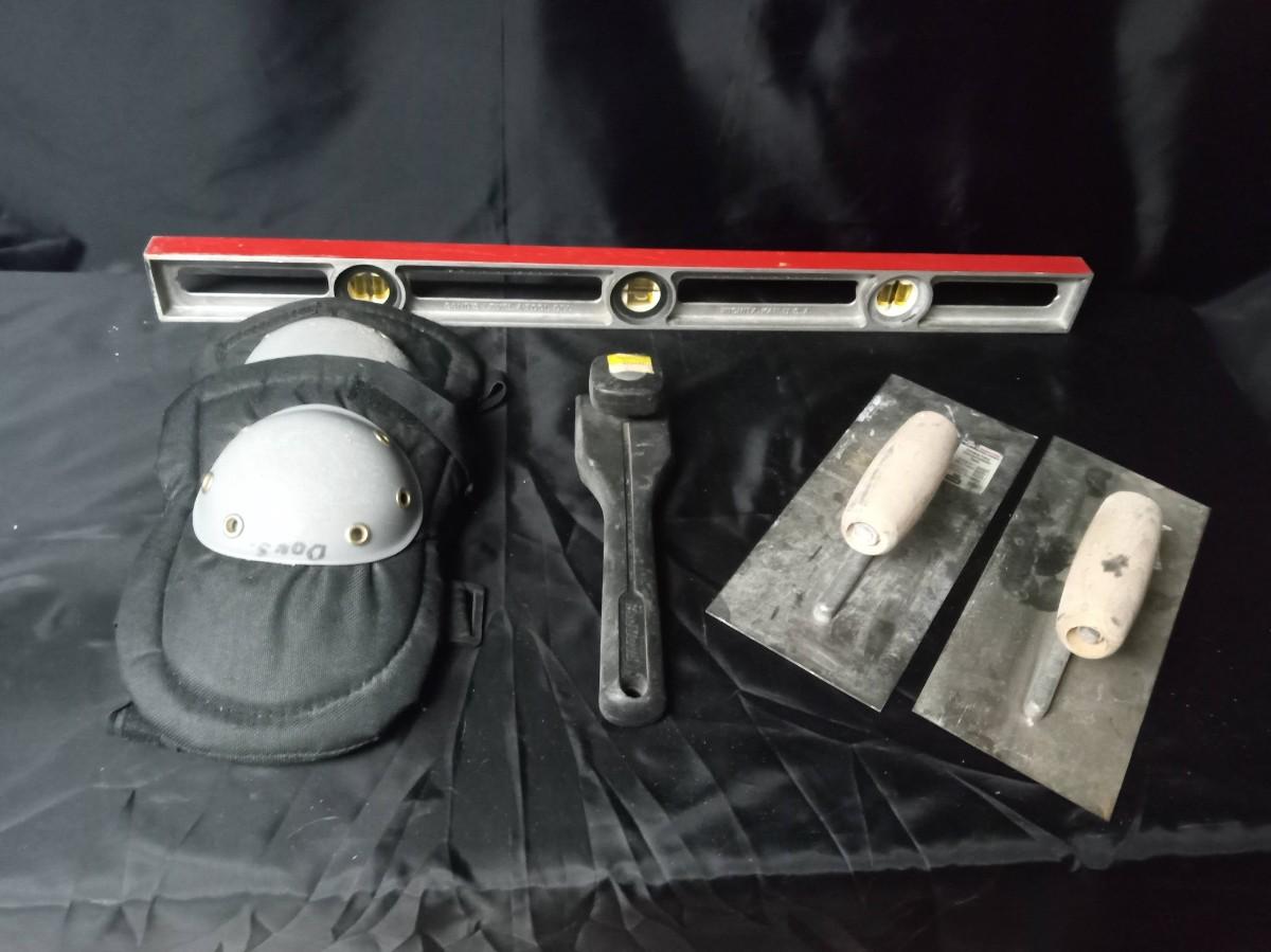 METAL LEVEL, KNEE PADS, SCRAPER AND 2 TROWELS