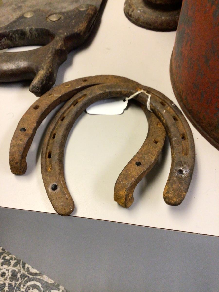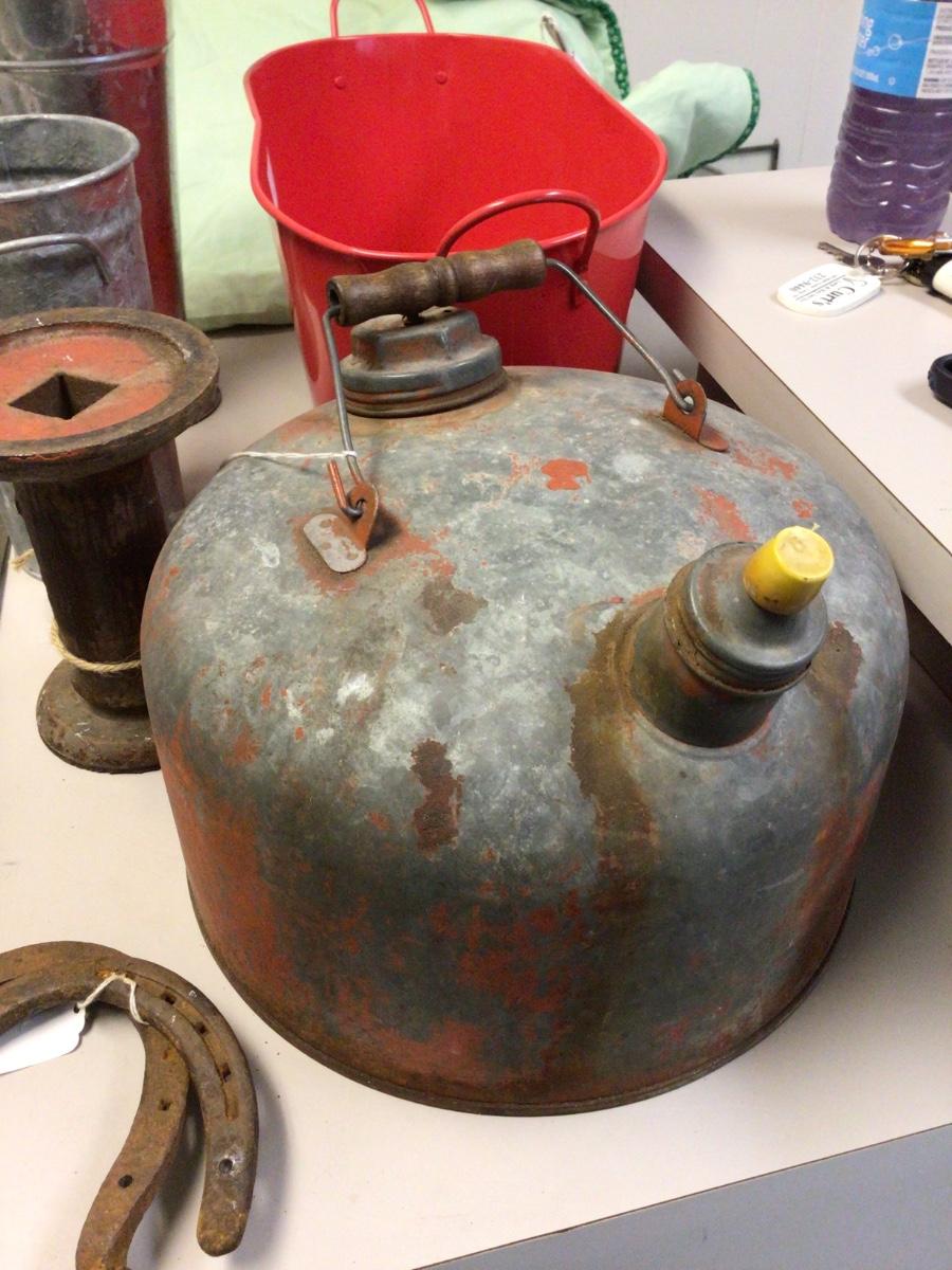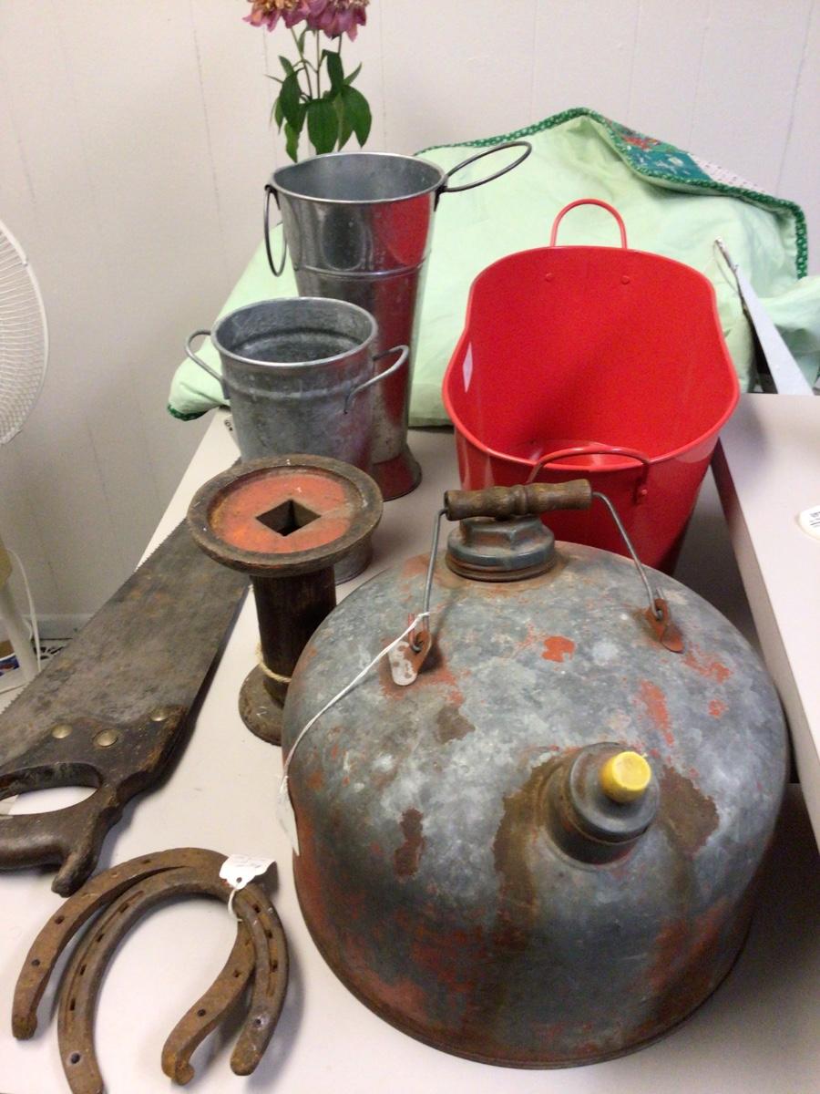 Yo7 get vintage gas can two flower holders,saw, two horse shoes, oval tube metal stand.