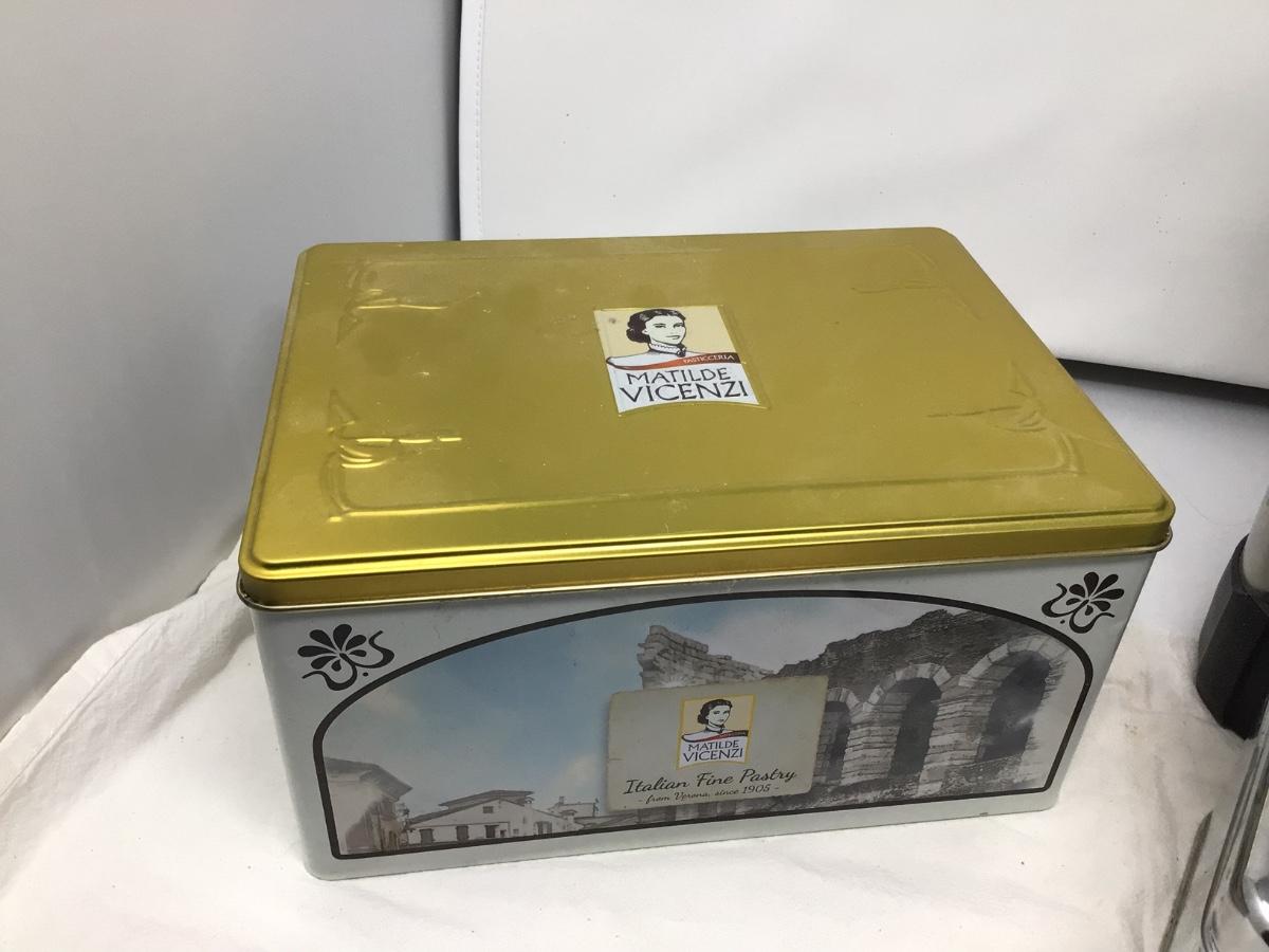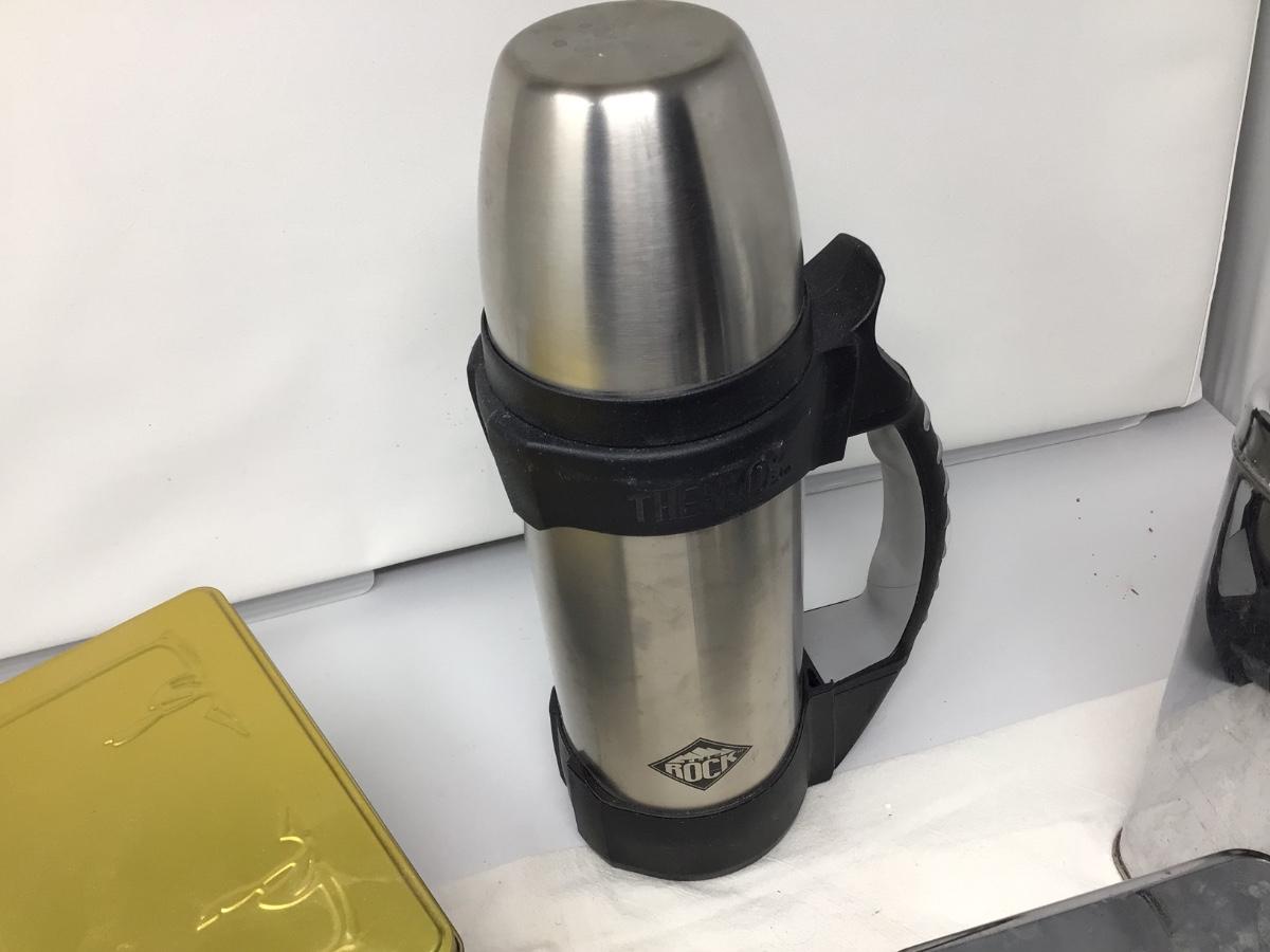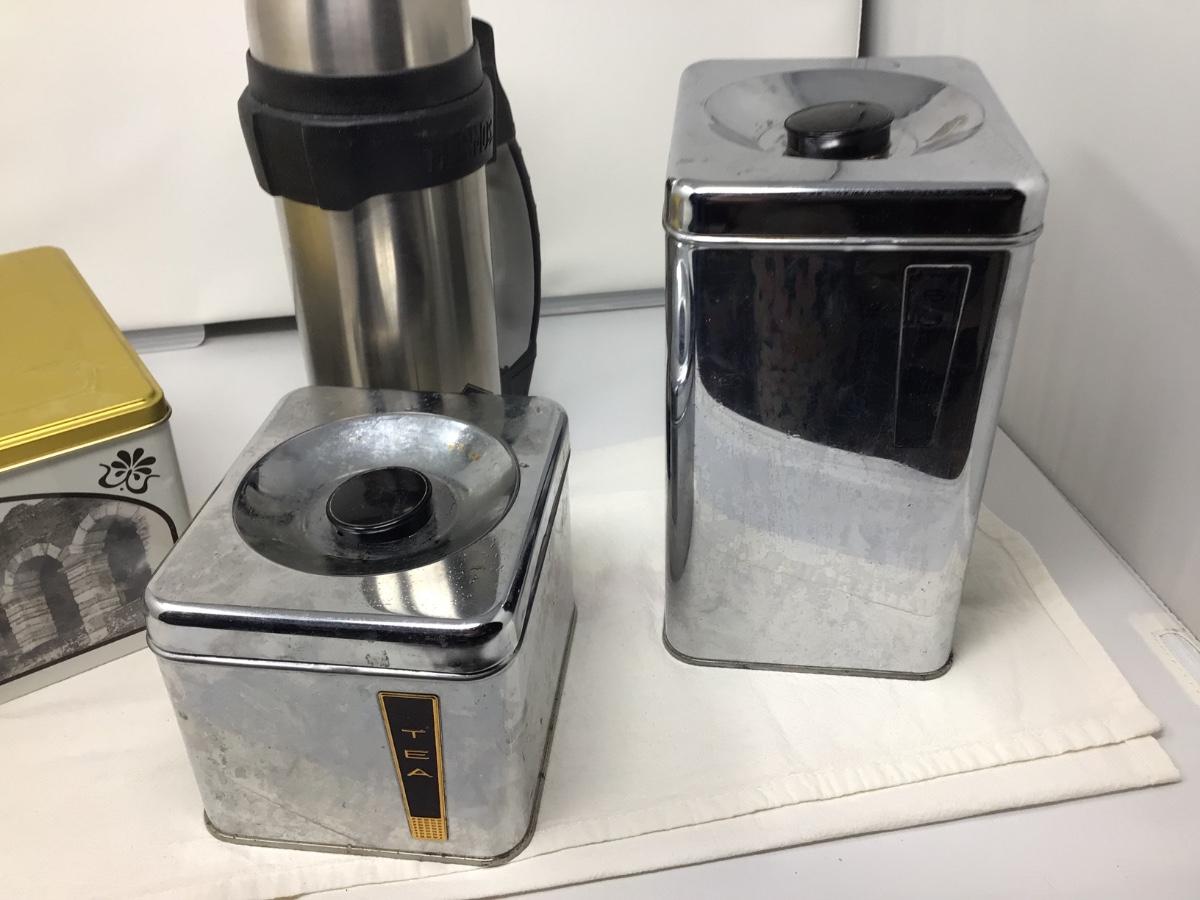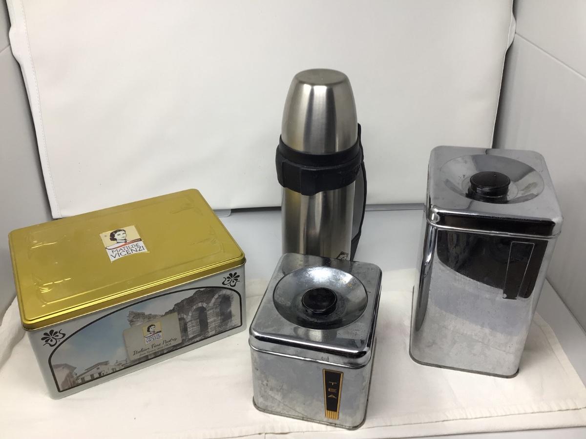 You get a Thermos thermos new, two stainless steel canisters, large decorative tin.