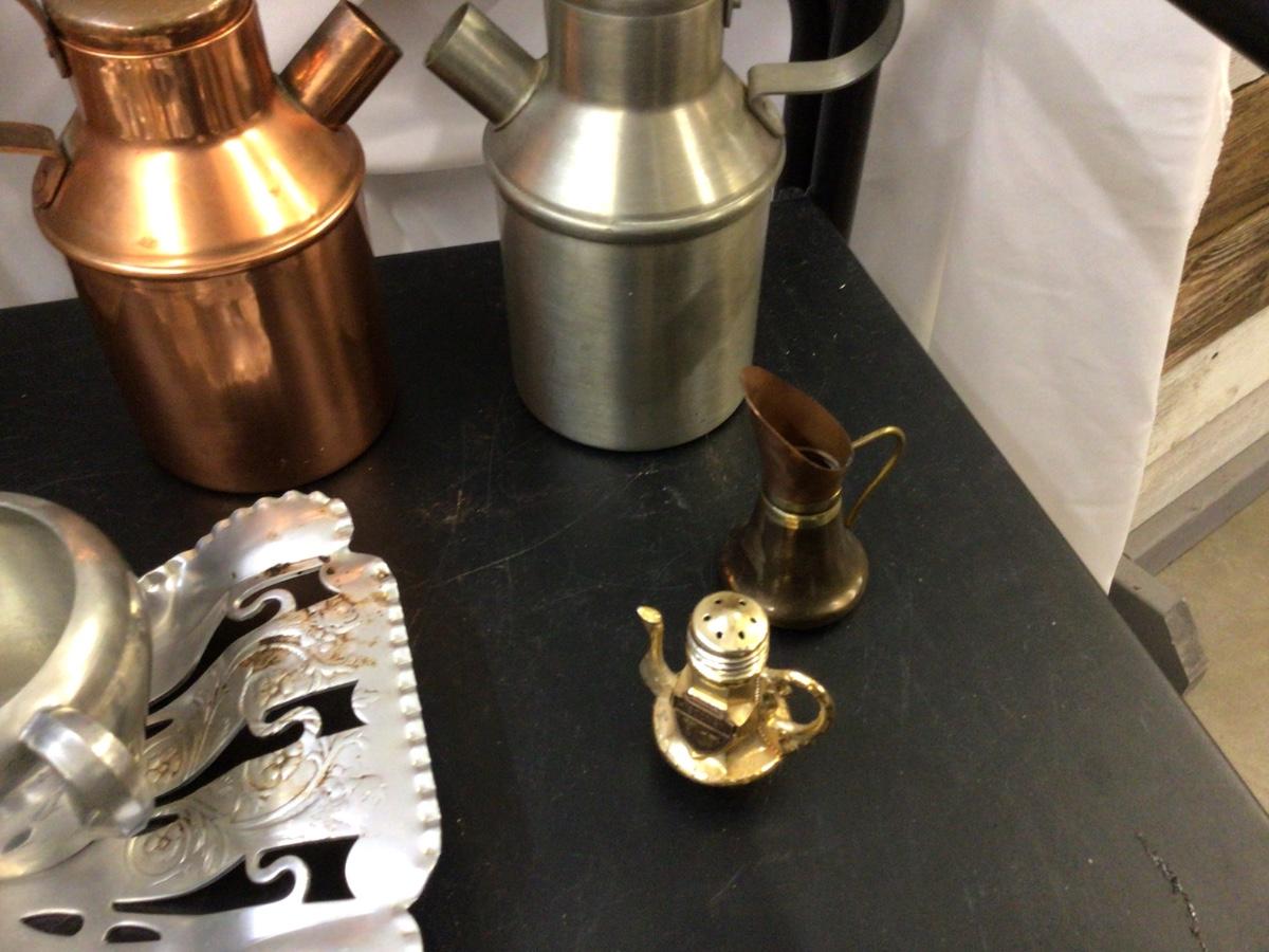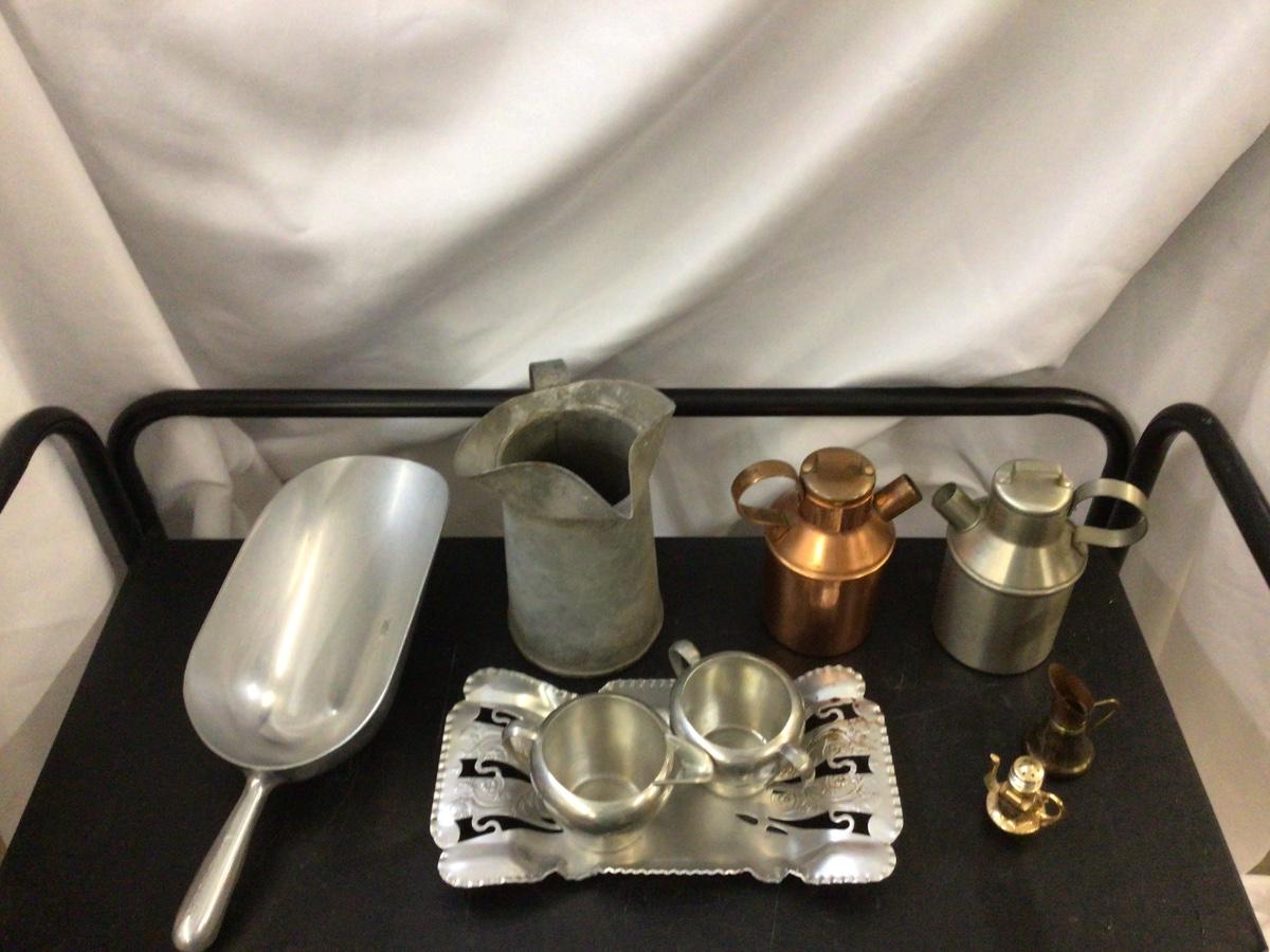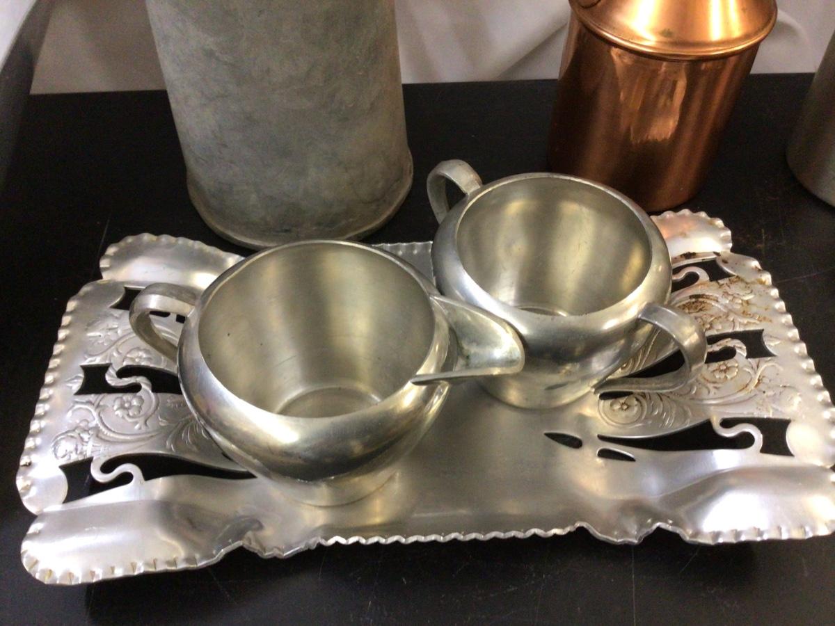 You get metal scoop, metal pitcher, metal cream and sugar with tray, two metal milk can pitchers, small metal pitcher and metal candle holder.