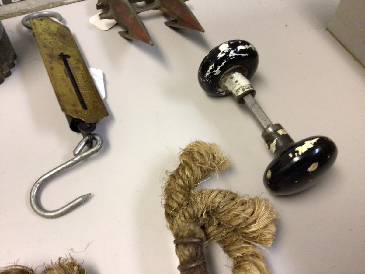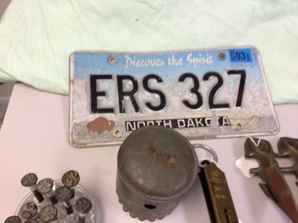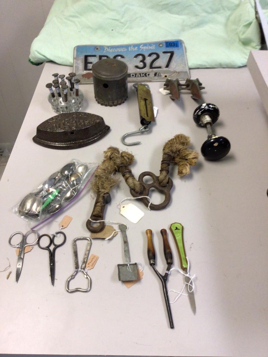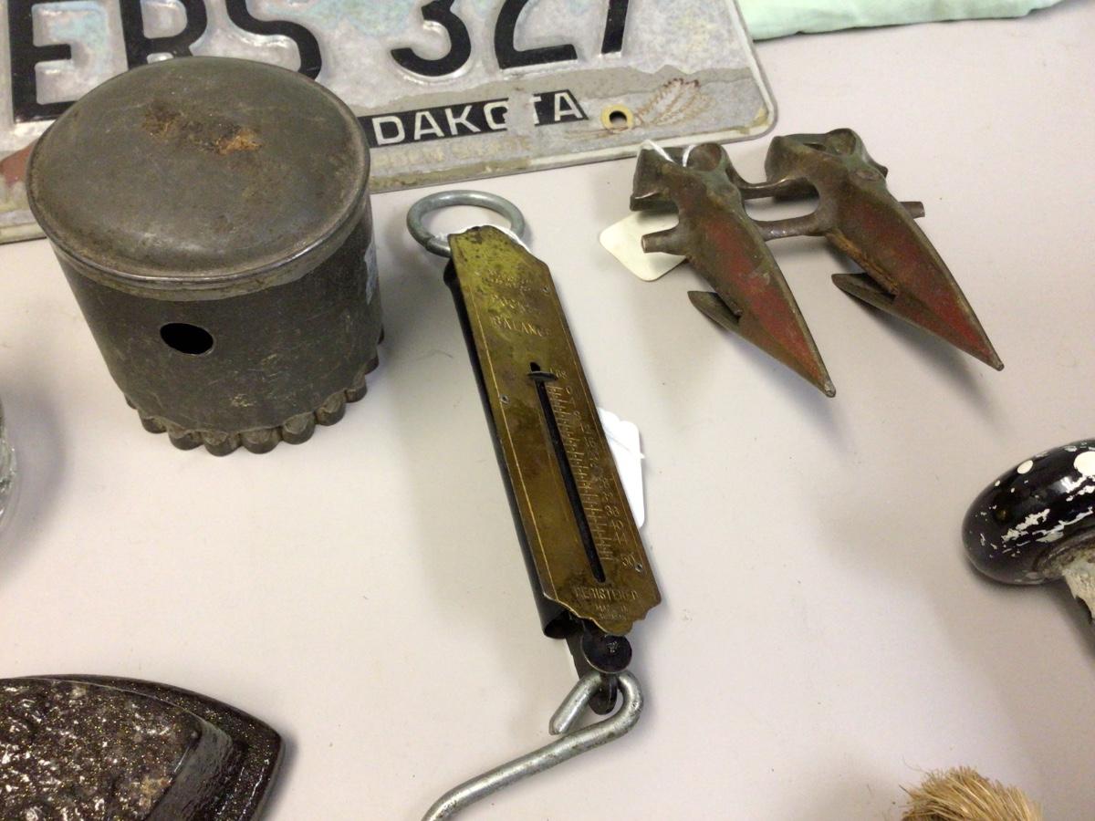 You get ND lic plate, fish scale, vintage iron base, door handle, bag of collectible spoons, scissors, bottle opener, mini shovel, mini curling iron, finger nail file, farm machinery parts, and large lot of rr ties dating nails.
