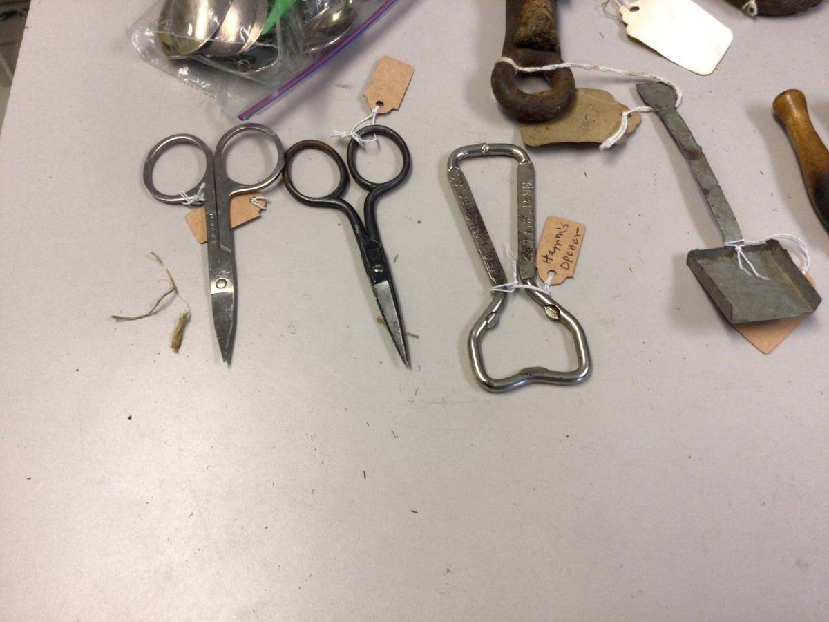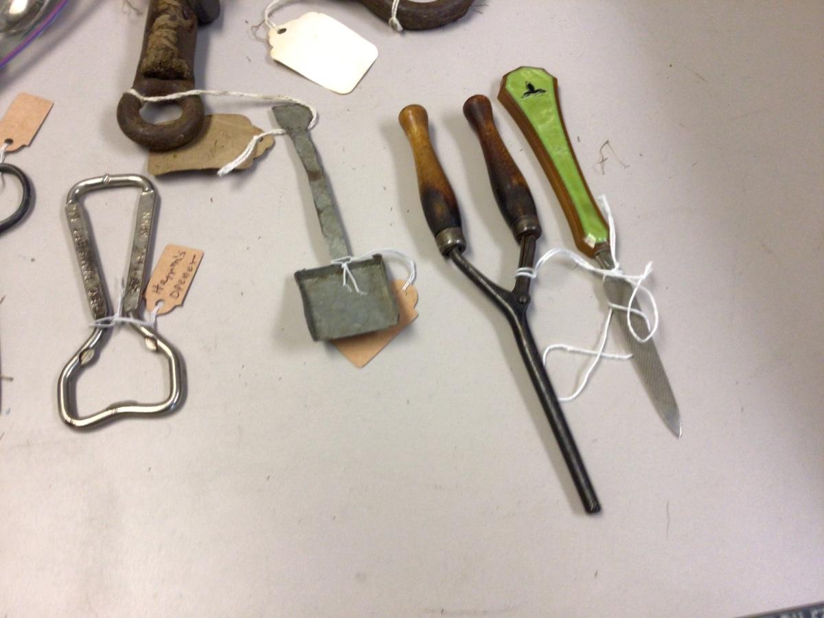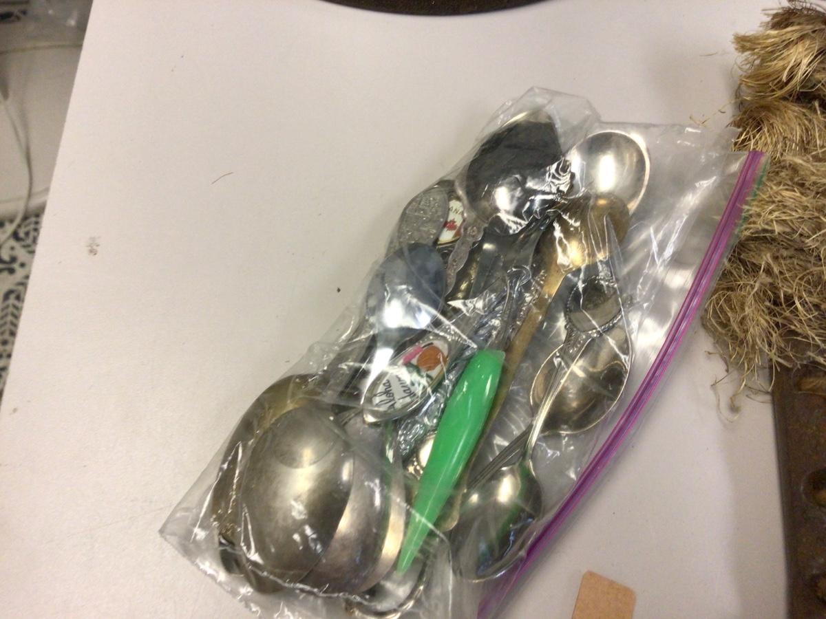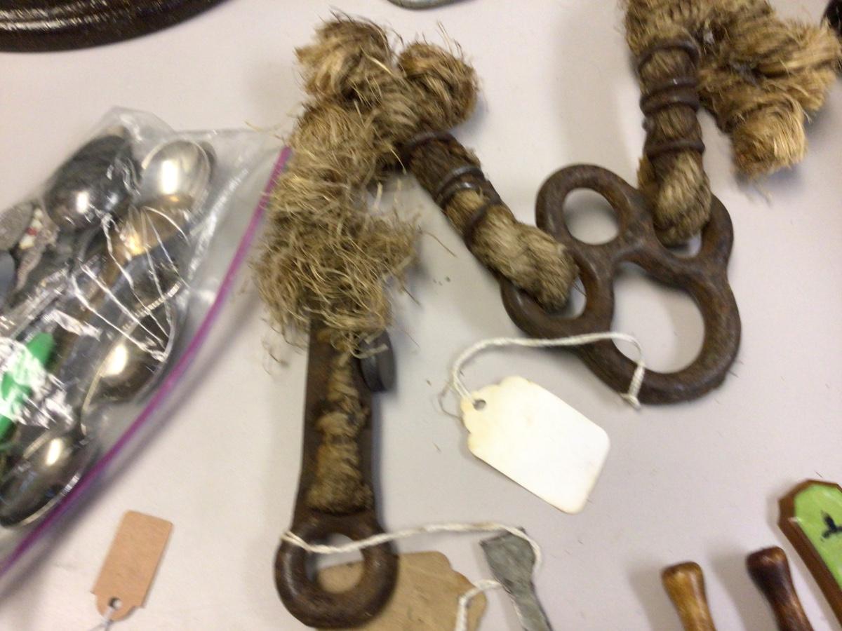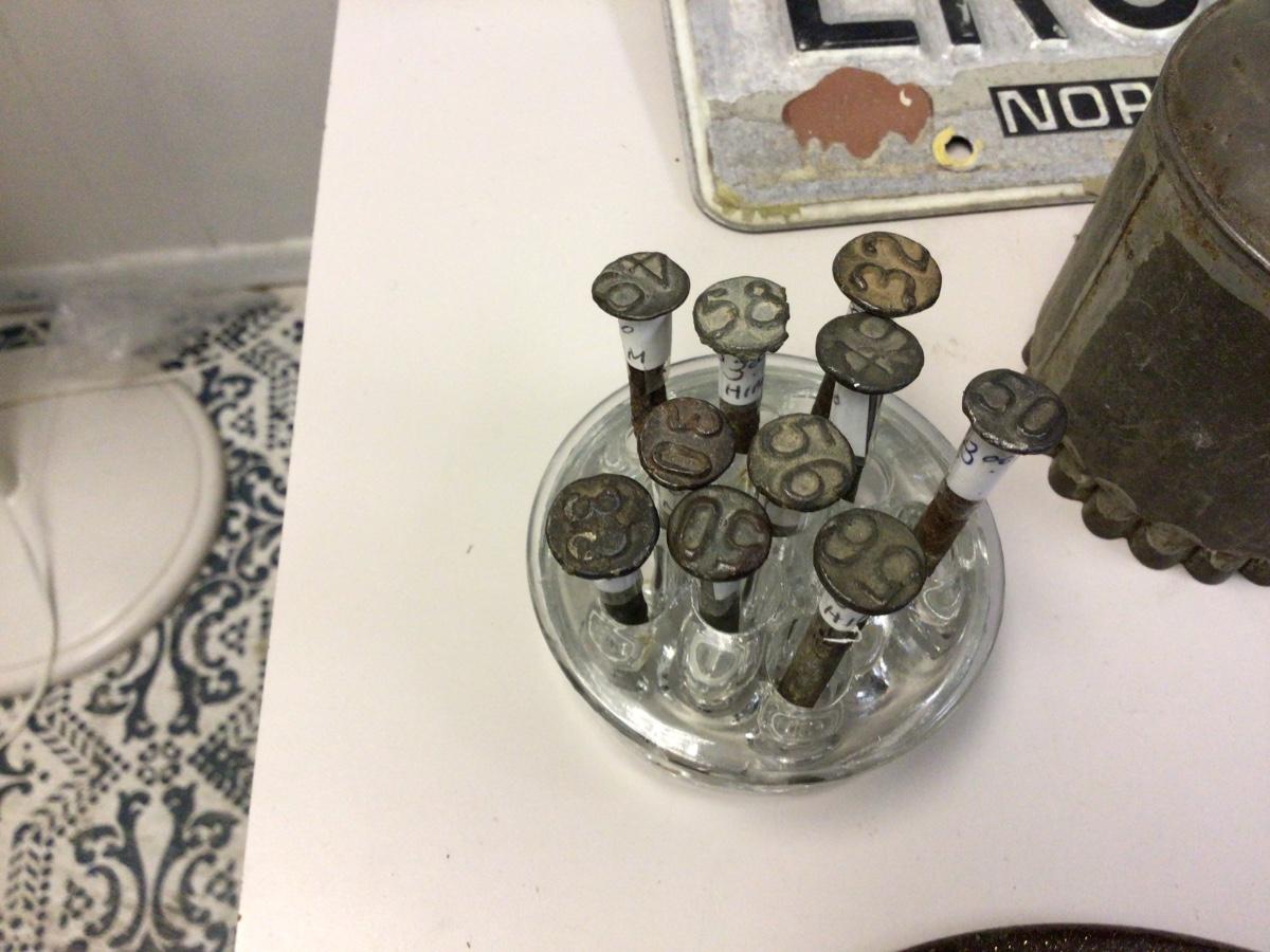 You get ND lic plate, fish scale, vintage iron base, door handle, bag of collectible spoons, scissors, bottle opener, mini shovel, mini curling iron, finger nail file, farm machinery parts, and large lot of rr ties dating nails.