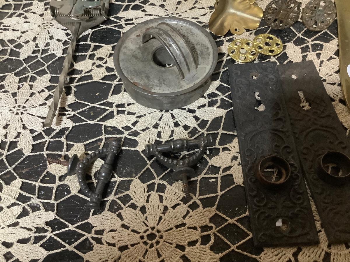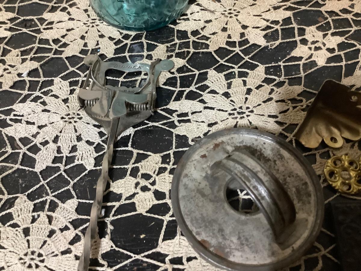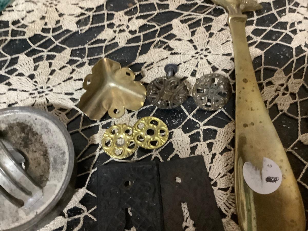 You get metal serving piece, metal shoe horn, two metal door handle plates, cookie cutter, mics metal items and blue glass canning jar.