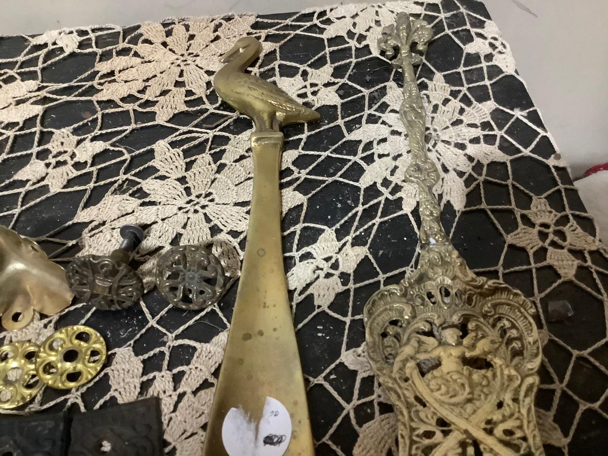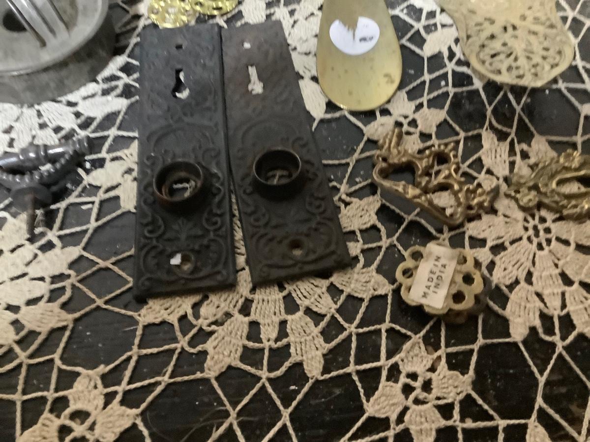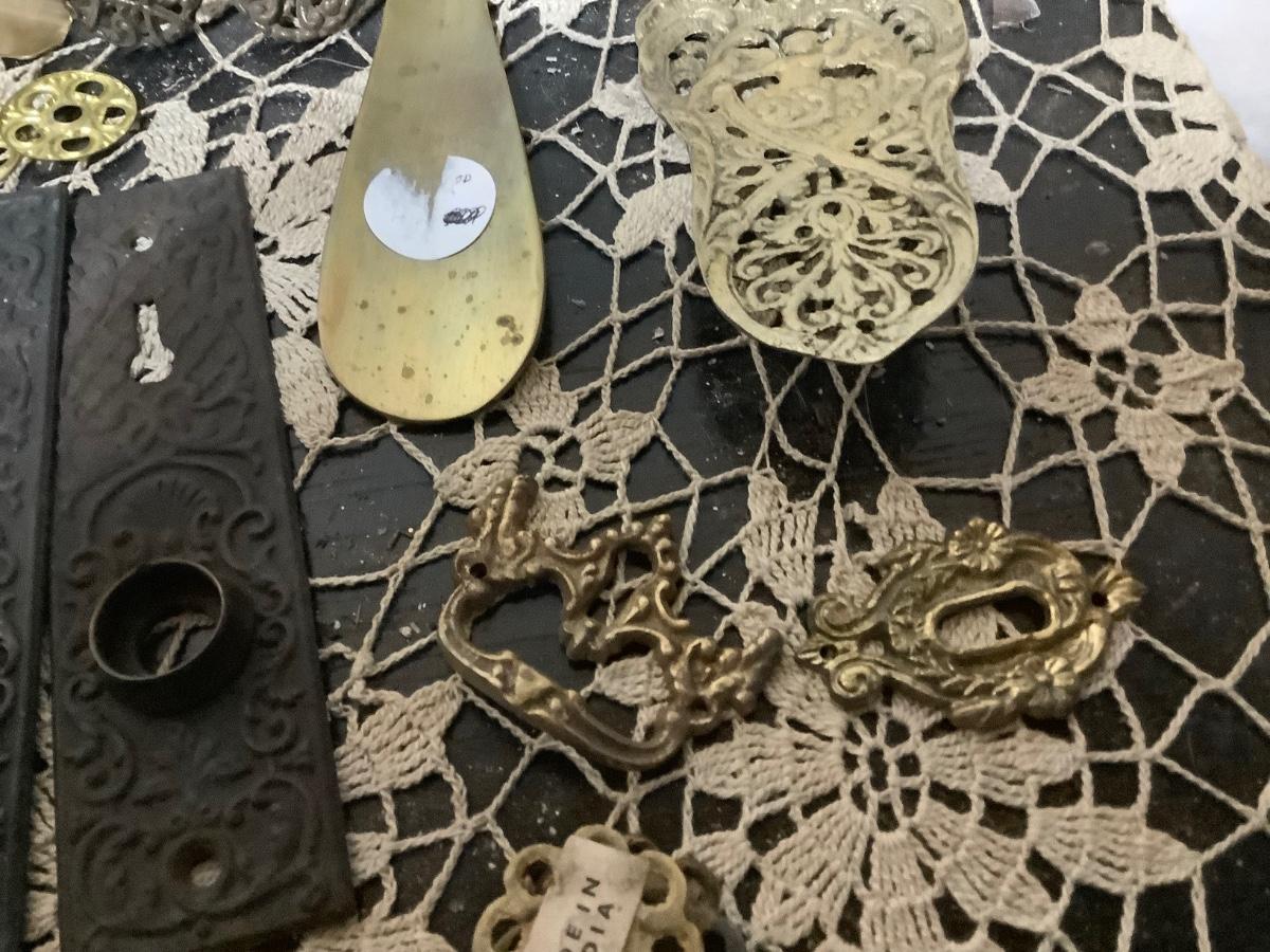 You get metal serving piece, metal shoe horn, two metal door handle plates, cookie cutter, mics metal items and blue glass canning jar.