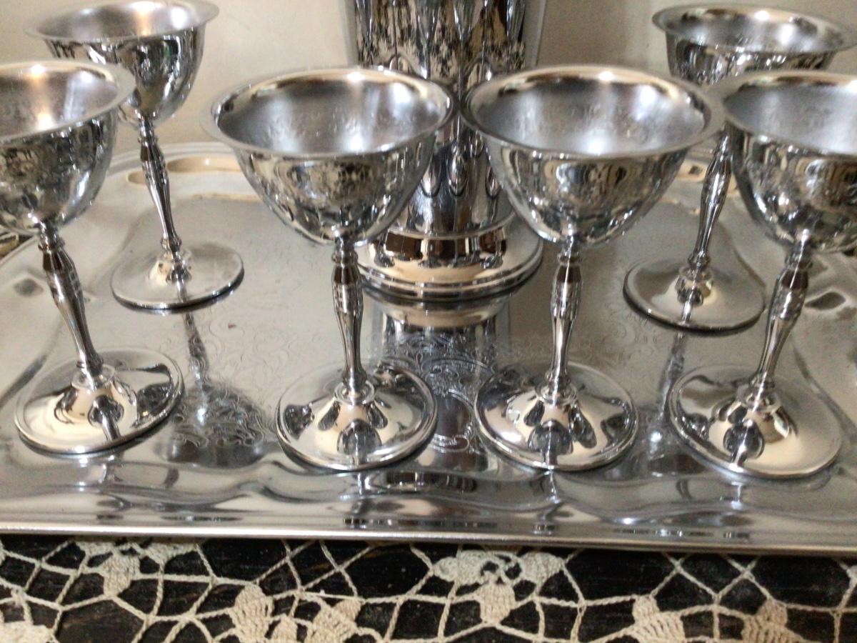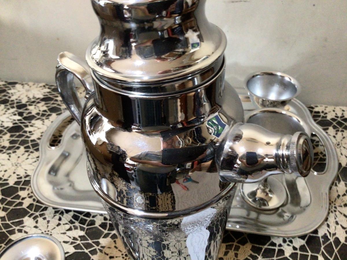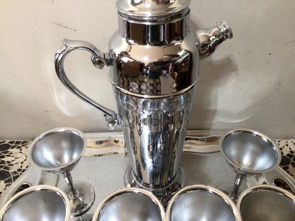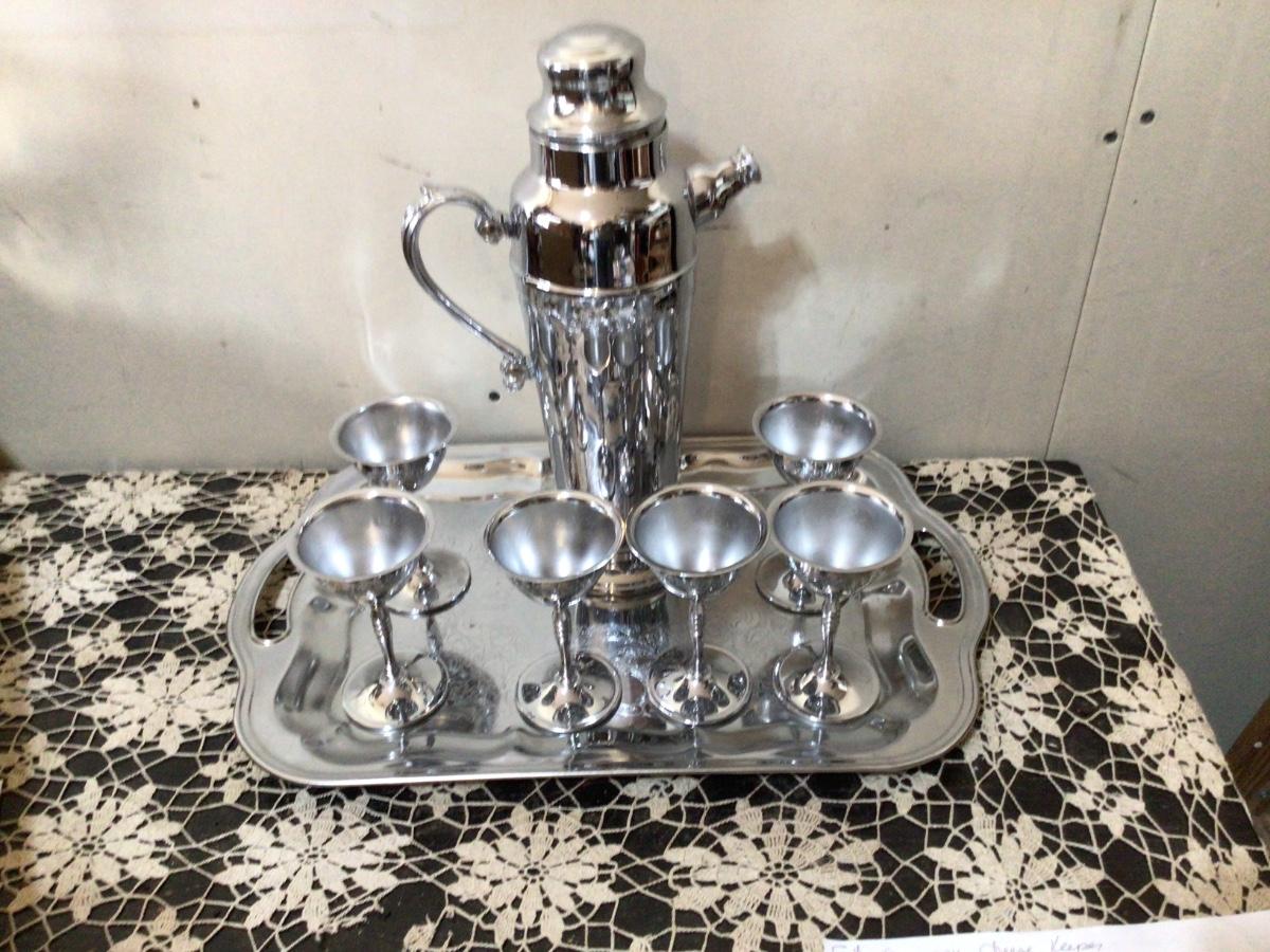 This is a great metal Martini shaker 6 metal glasses and a metal tray. Everything is in great condition. Very sharp looking item.