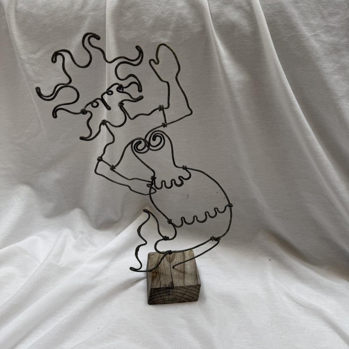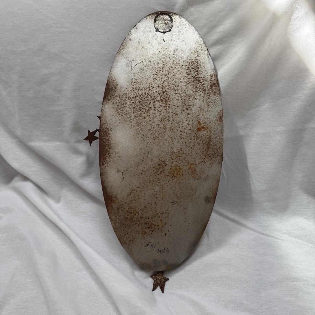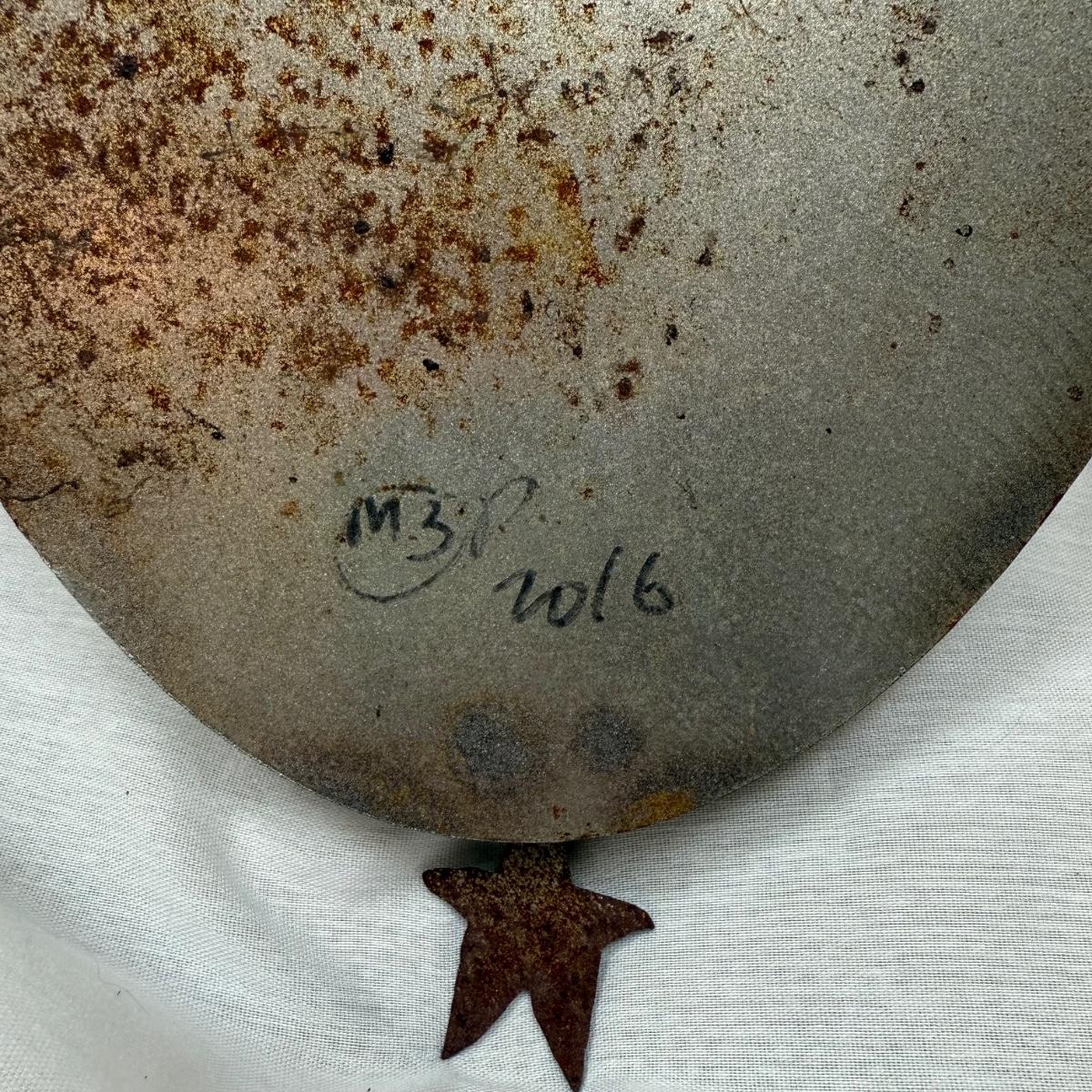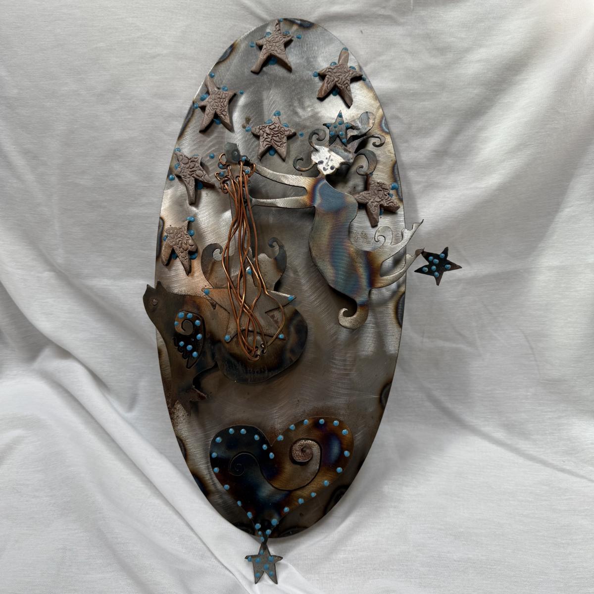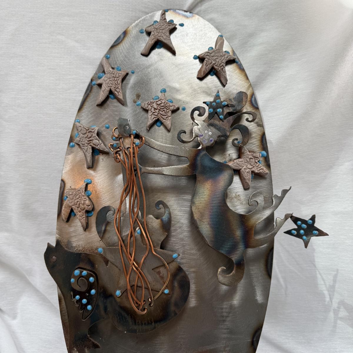 This lot contains two piece of metal mermaid art. One is a metal wrap of a mermaid that has a wooden base stand. This one measures approximately 8” x 17”H and the base measures 3.25” x 3.25”. The next piece is a super cool mixed media of a mermaid playing a guitar. The base is metal and the piece features clay, copper and paint. This piece has a signature and hardware to be hung, it measures 10” x 19.5”. Shipping available. Shipping can be costly. We suggest contacting our preferred local shipping provider, Postage Express, with dimensions and getting an estimate before bidding: (828) 255-9250 or shipping@postageexpressnc.com.