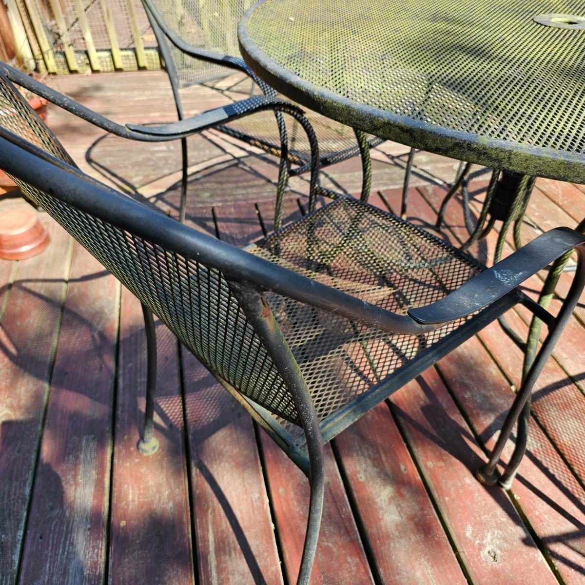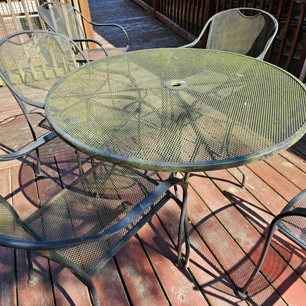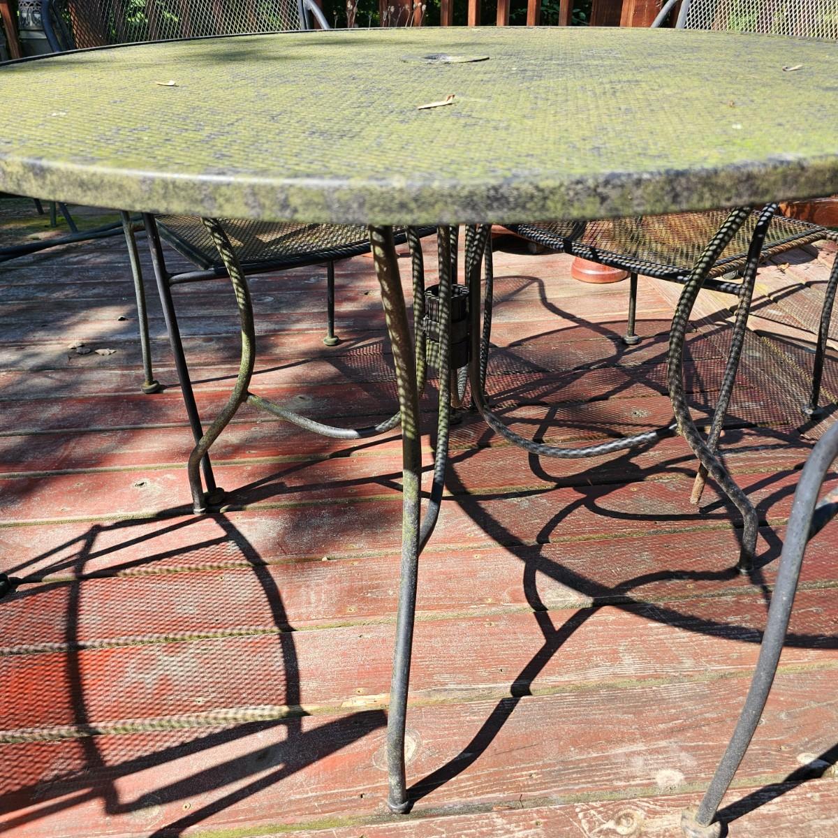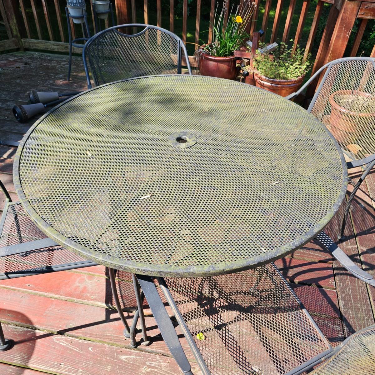 Round metal patio table with mesh top. Table measures 44"D x 28"H, has opening for patio umbrella, not included. Includes five wire mesh back and seat armchairs, each 22.4" x 26" x 28"H with 16" seat height. Items all have green mildew and some small areas of light rust and need TLC cleaning. One chair is missing its foot, see image. See photos for details. Local pickup only.