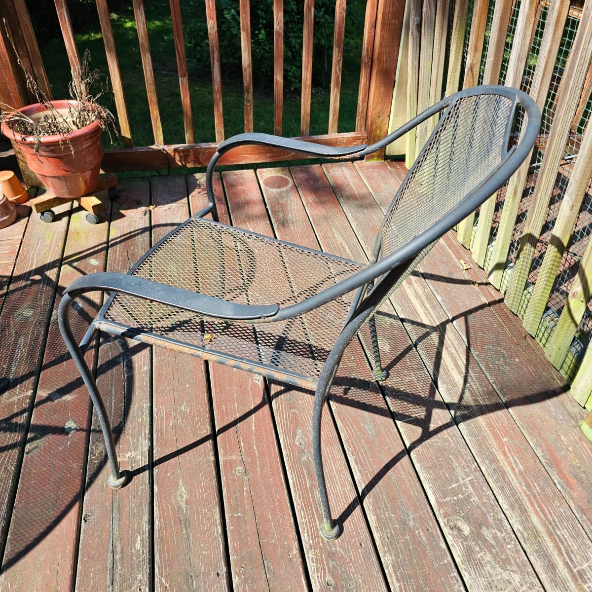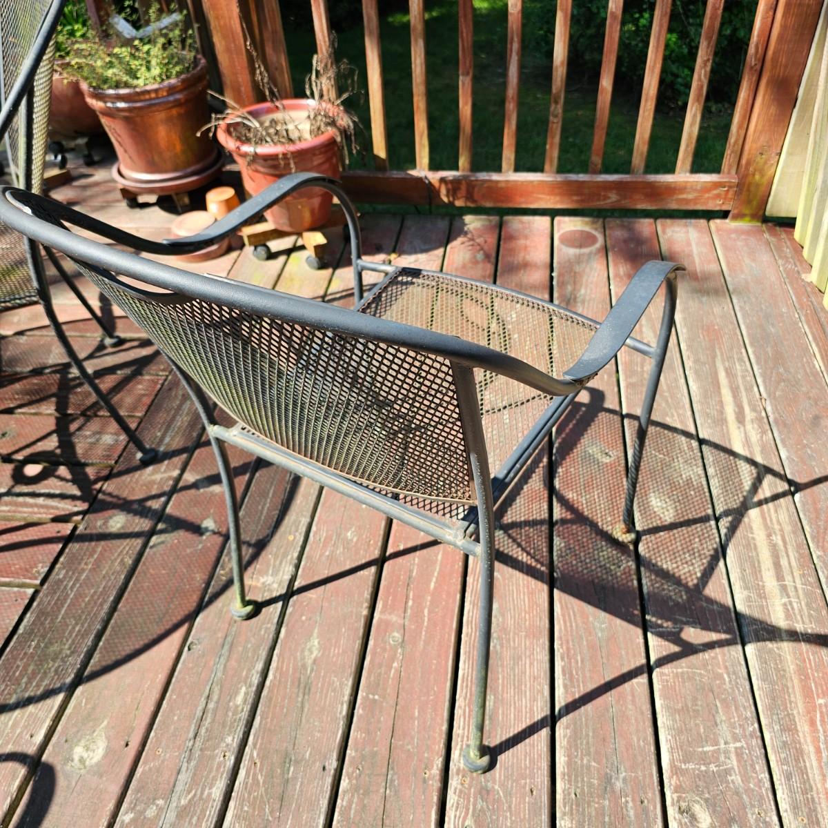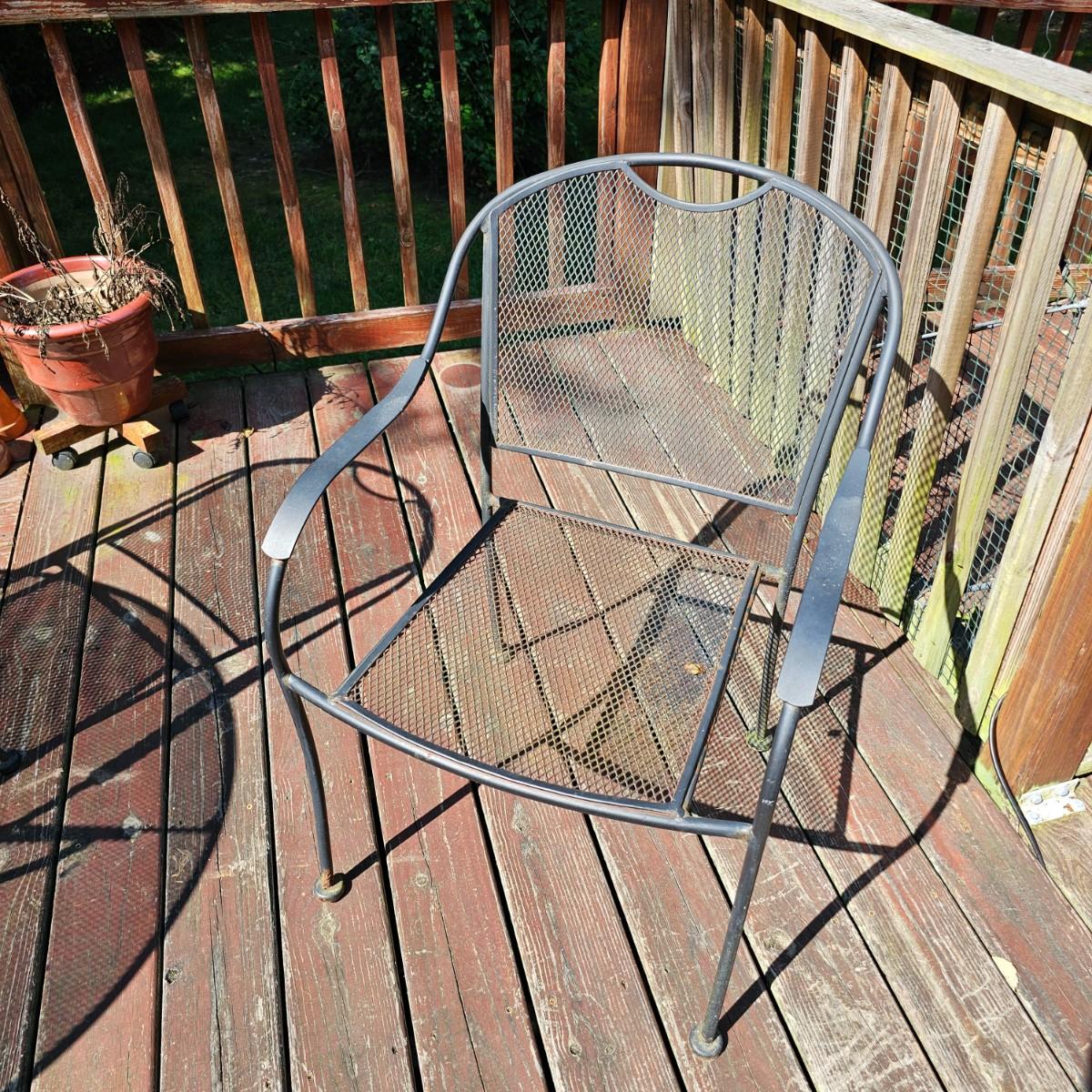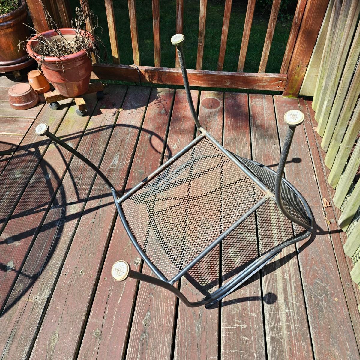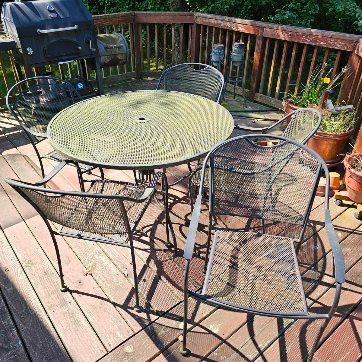 Round metal patio table with mesh top. Table measures 44"D x 28"H, has opening for patio umbrella, not included. Includes five wire mesh back and seat armchairs, each 22.4" x 26" x 28"H with 16" seat height. Items all have green mildew and some small areas of light rust and need TLC cleaning. One chair is missing its foot, see image. See photos for details. Local pickup only.