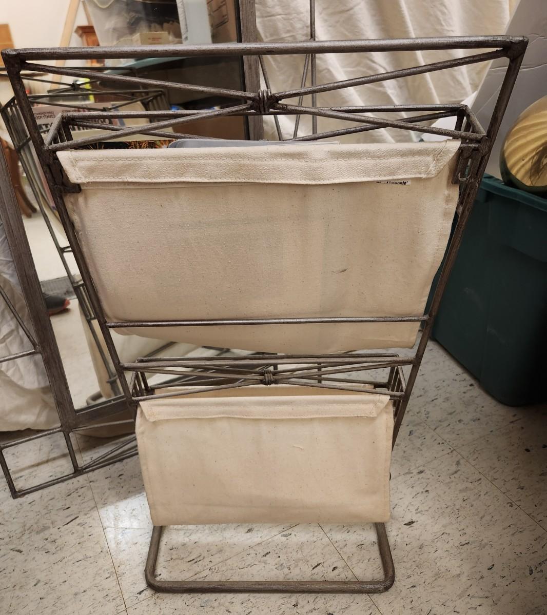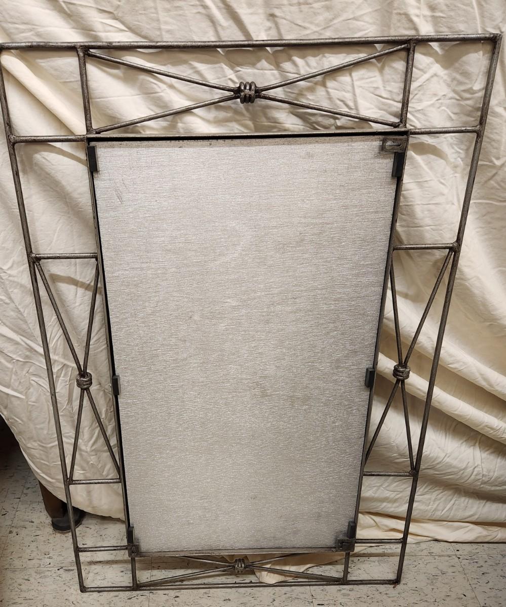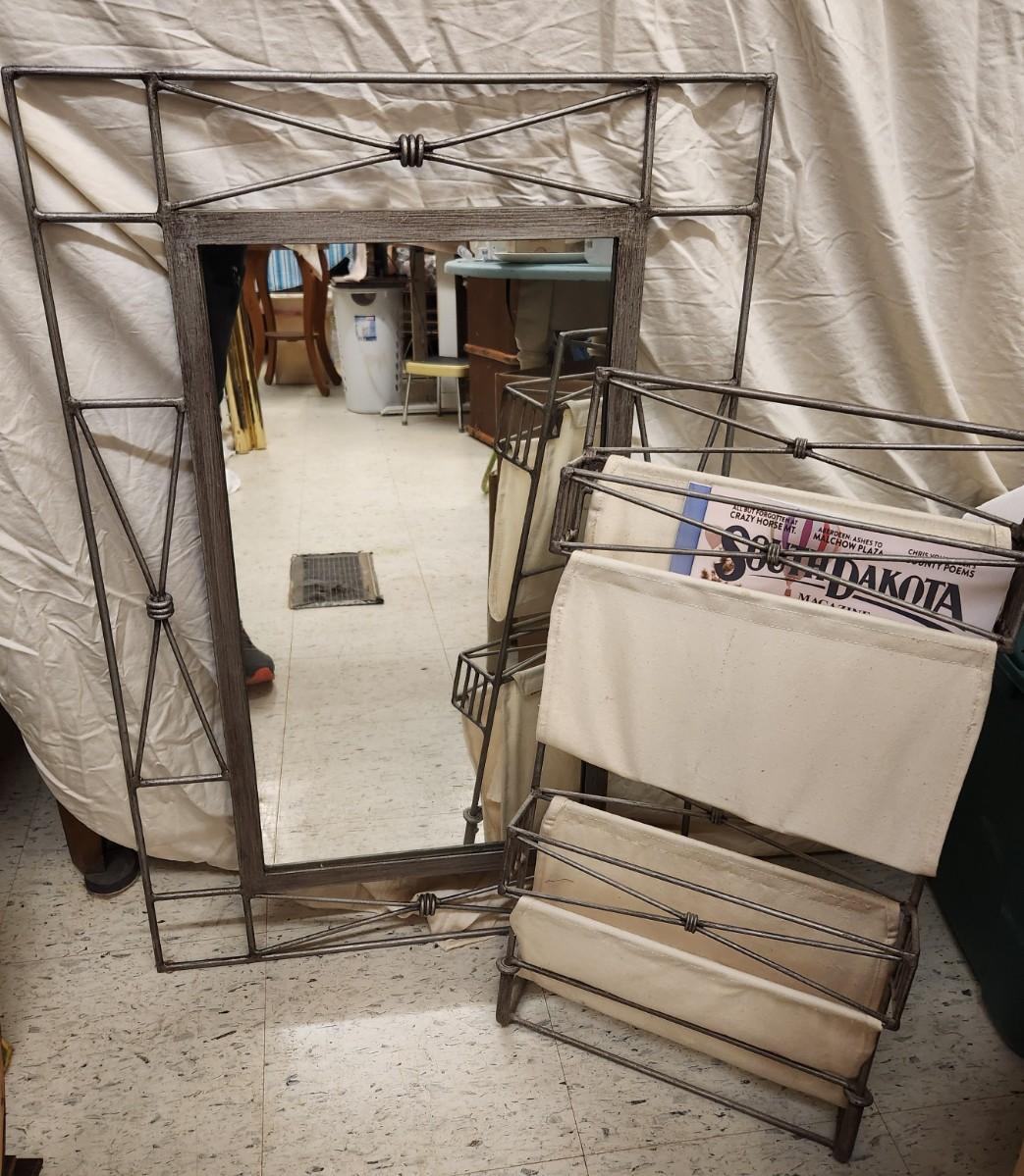 Neat metal mirror that can be hung either direction and a matching magazine rack. Dimensions in pictures