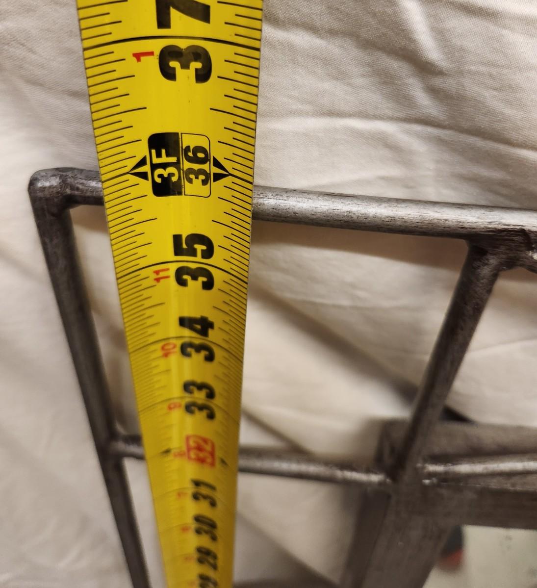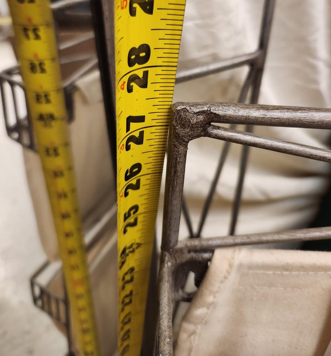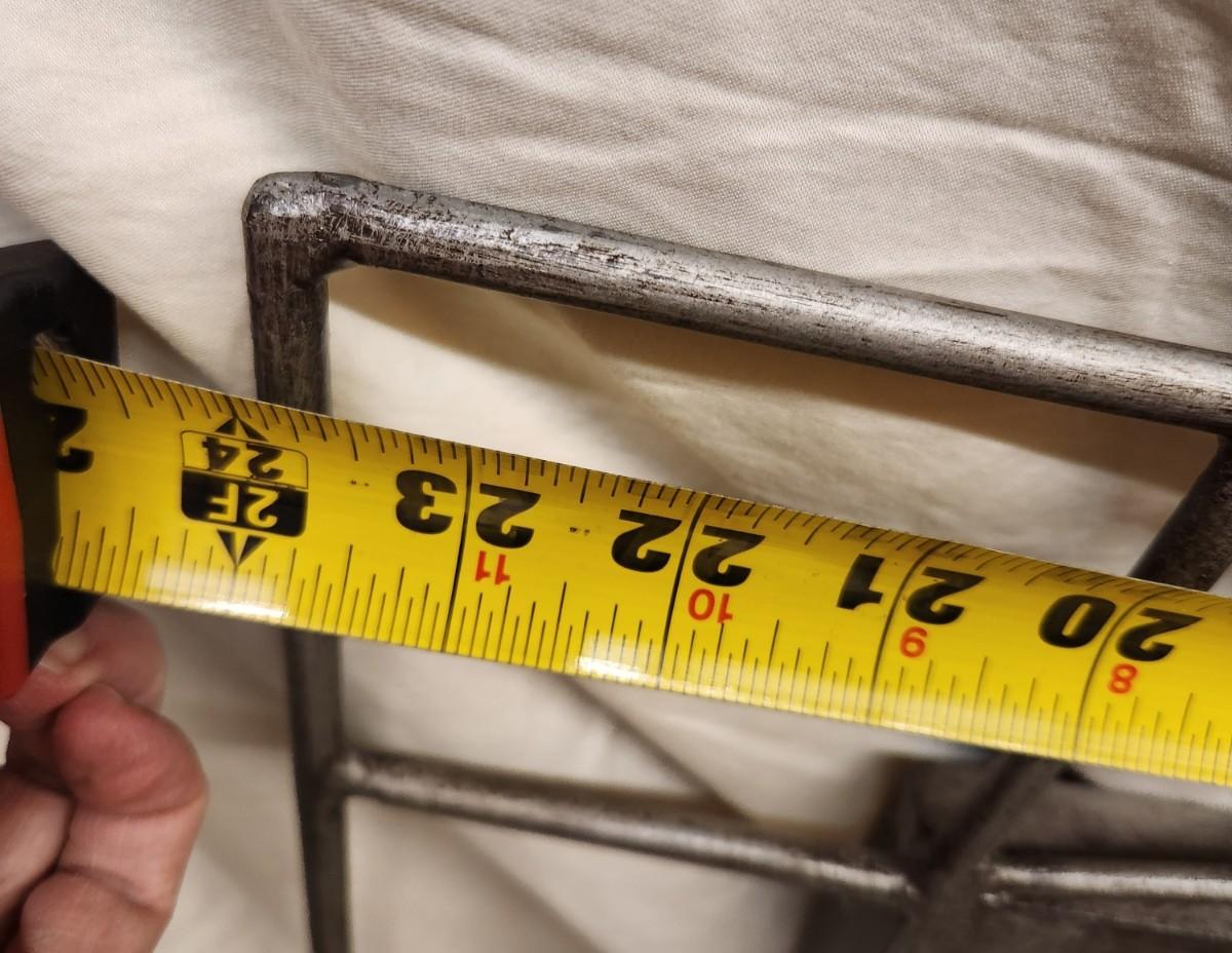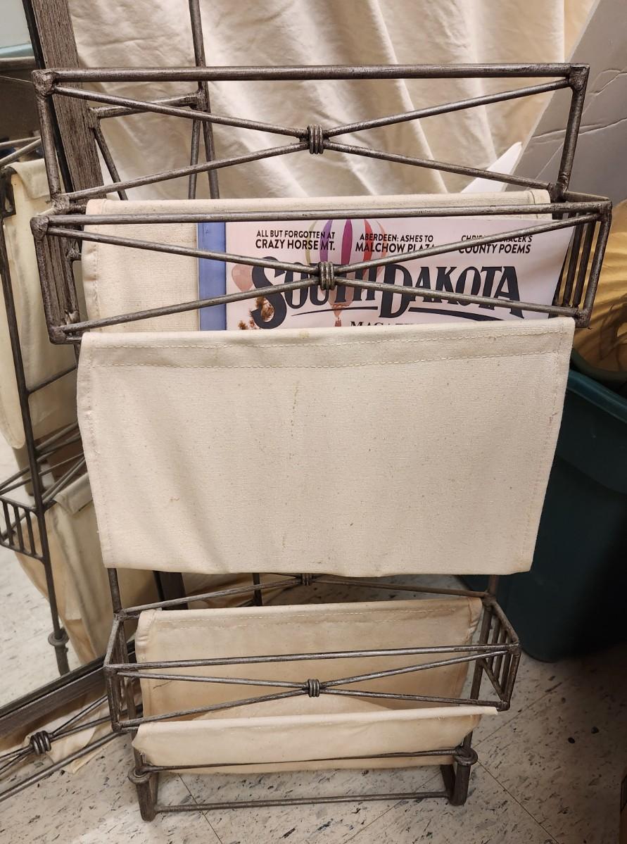 Neat metal mirror that can be hung either direction and a matching magazine rack. Dimensions in pictures