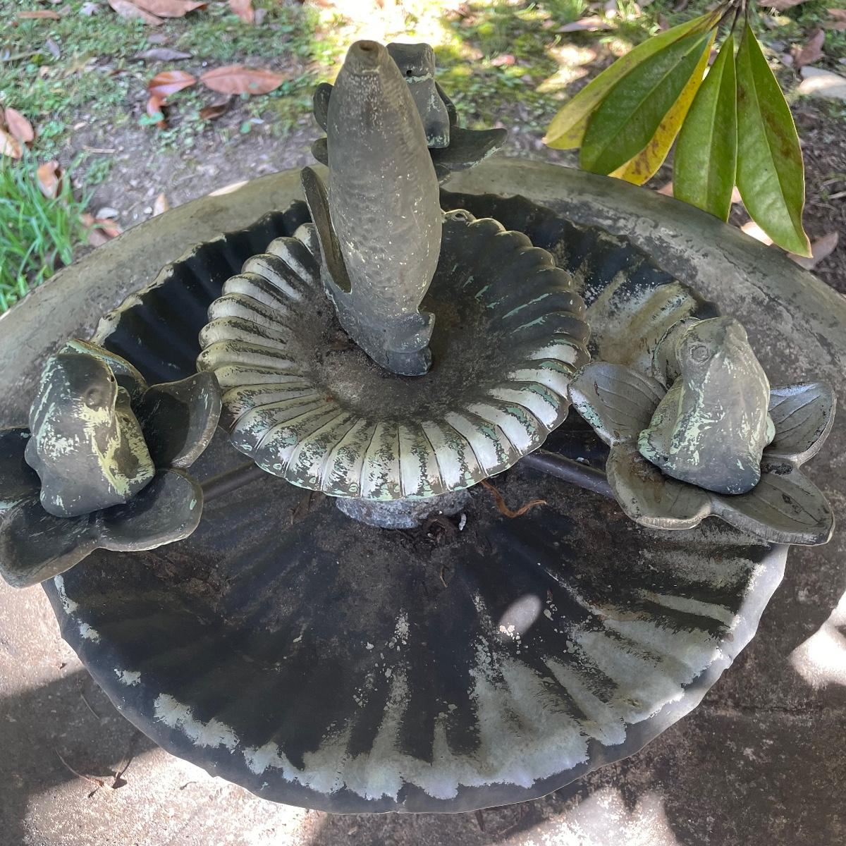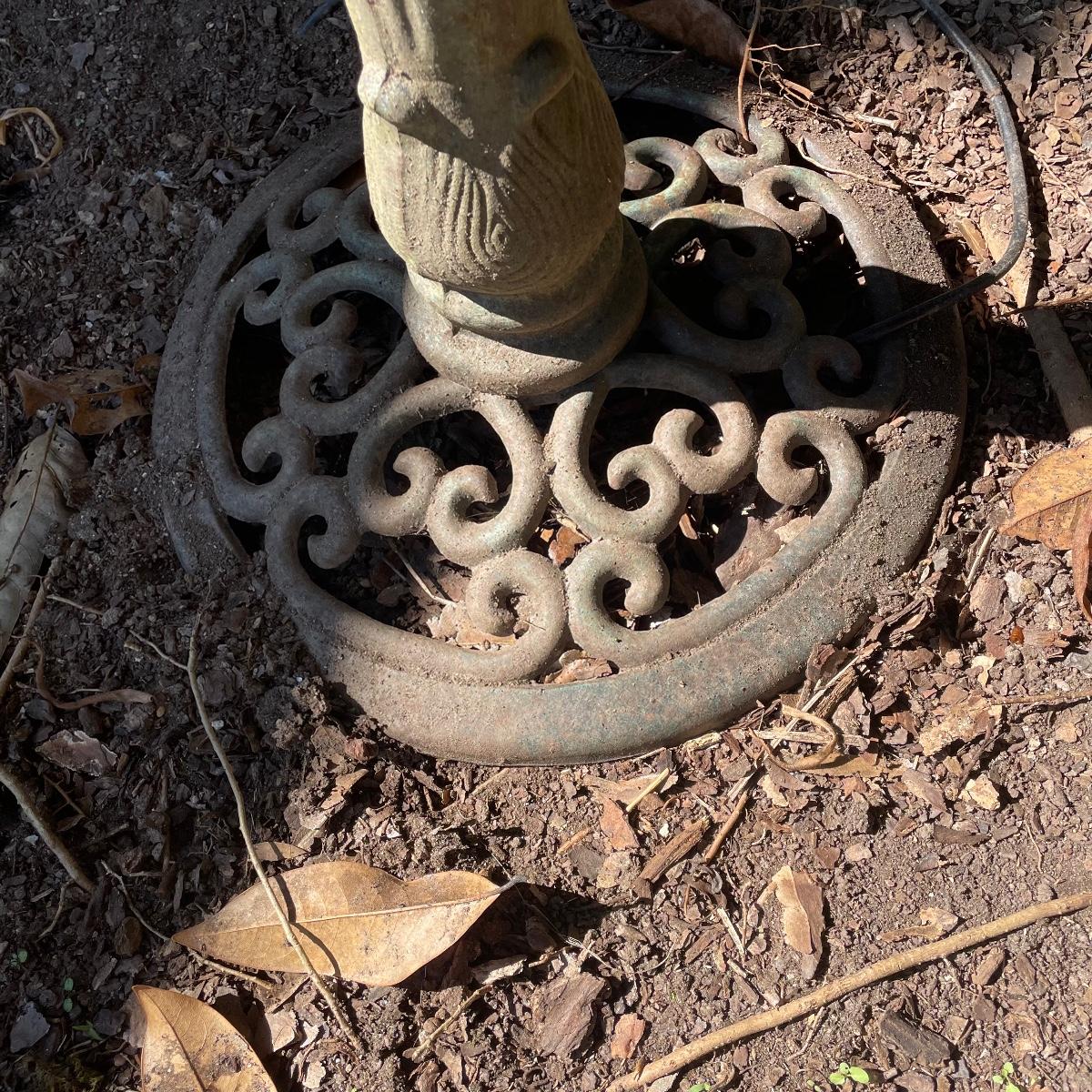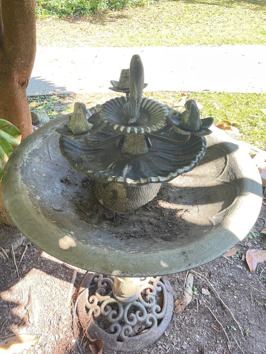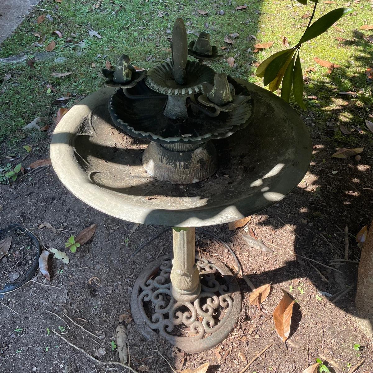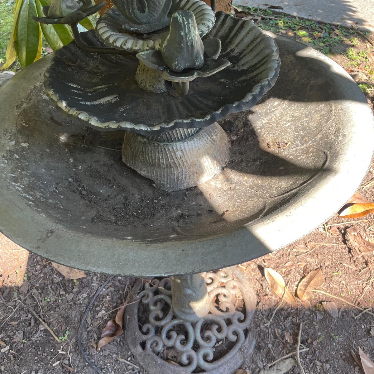 This ornate birdbath is metal and has a small pump in place that has not been tested. Please note the metal pump cover has eroded slightly, see image.
