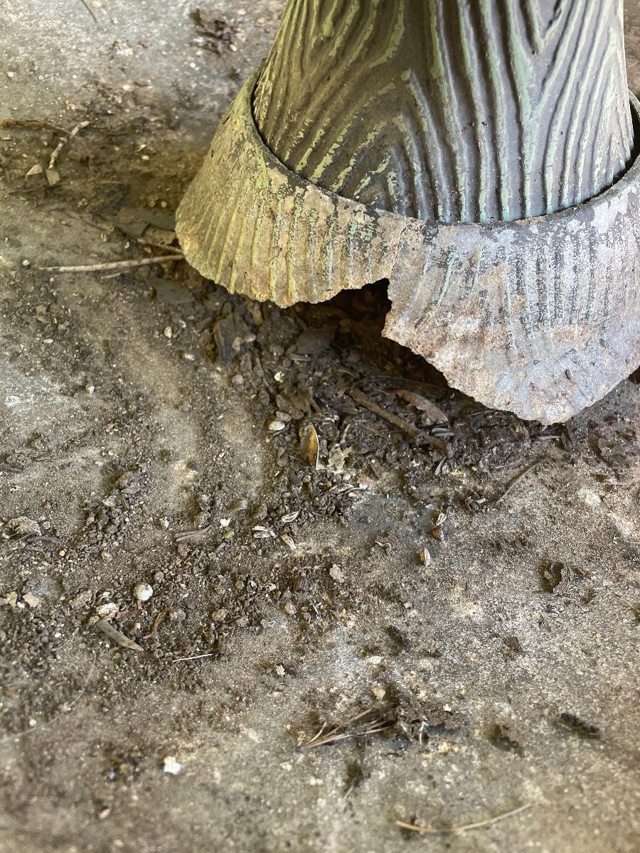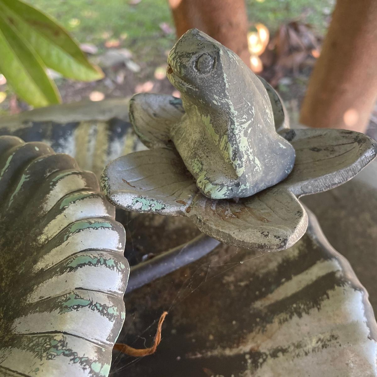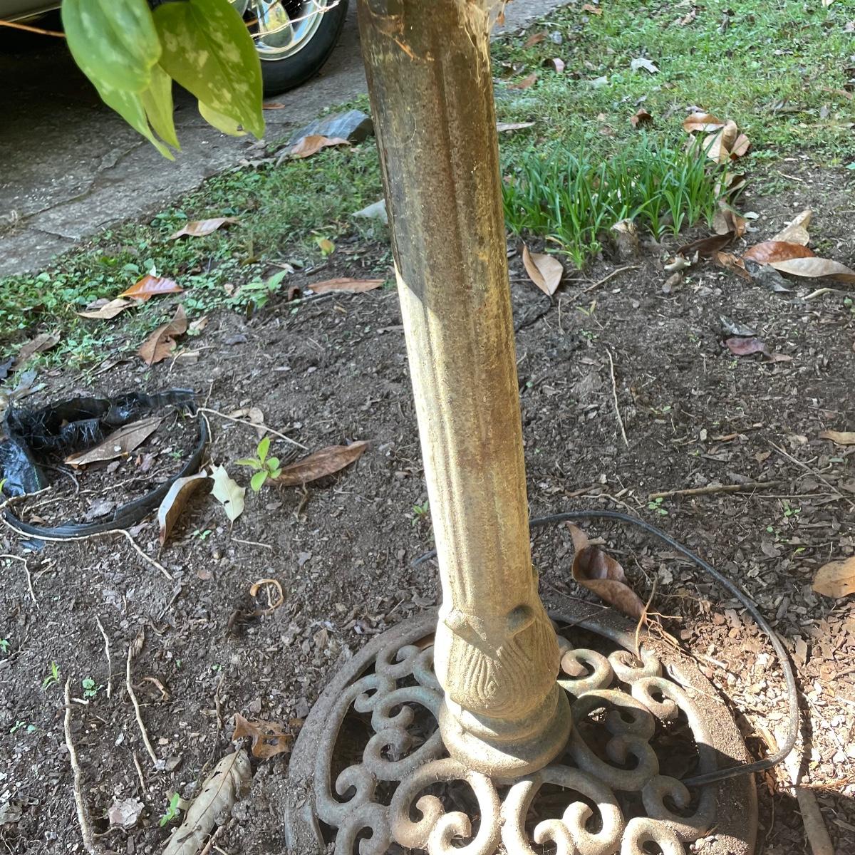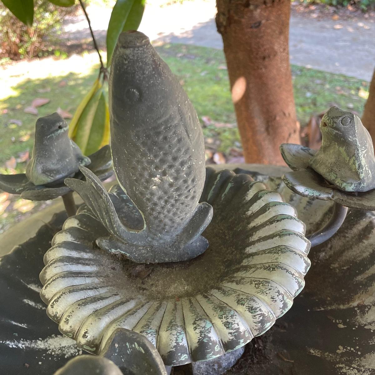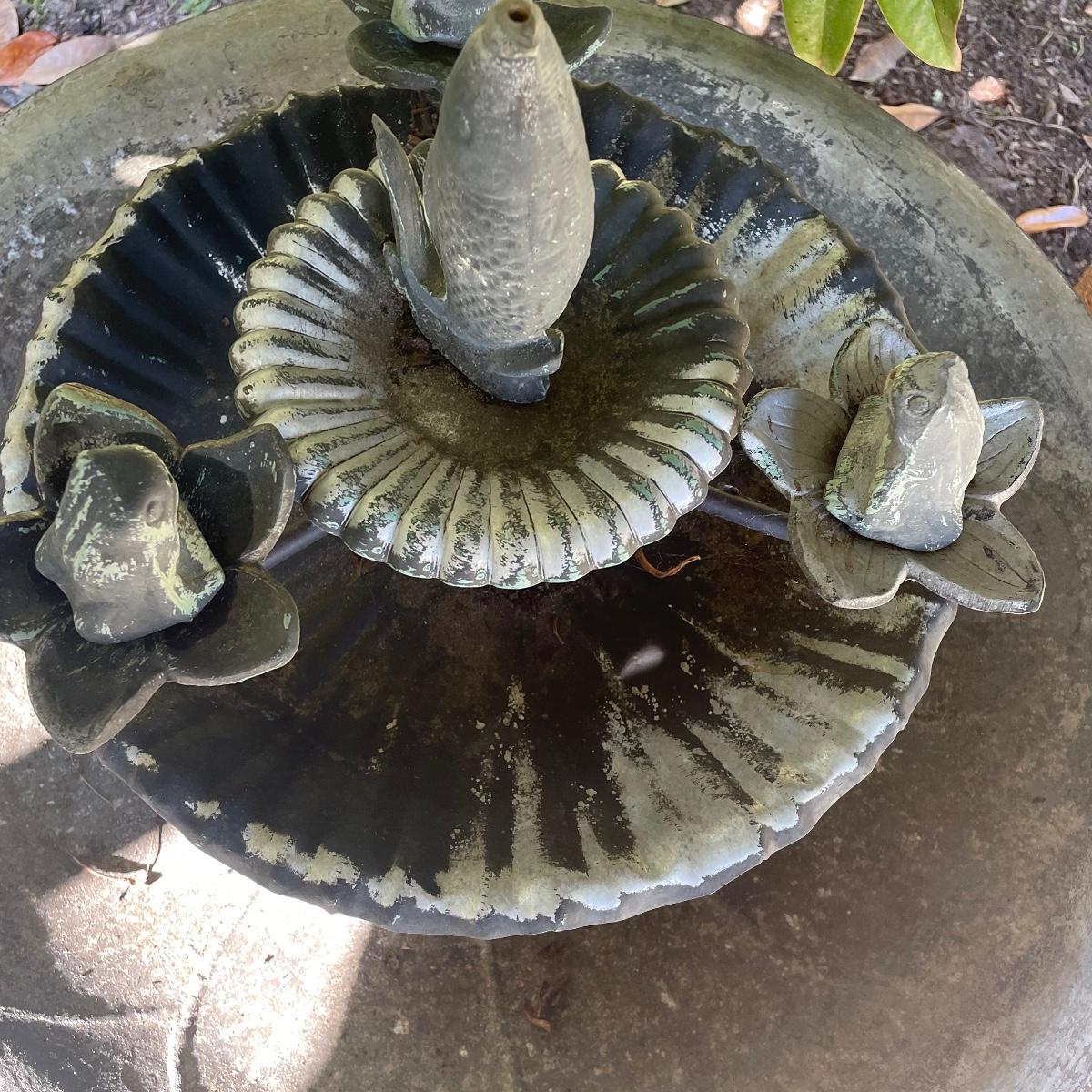 This ornate birdbath is metal and has a small pump in place that has not been tested. Please note the metal pump cover has eroded slightly, see image.