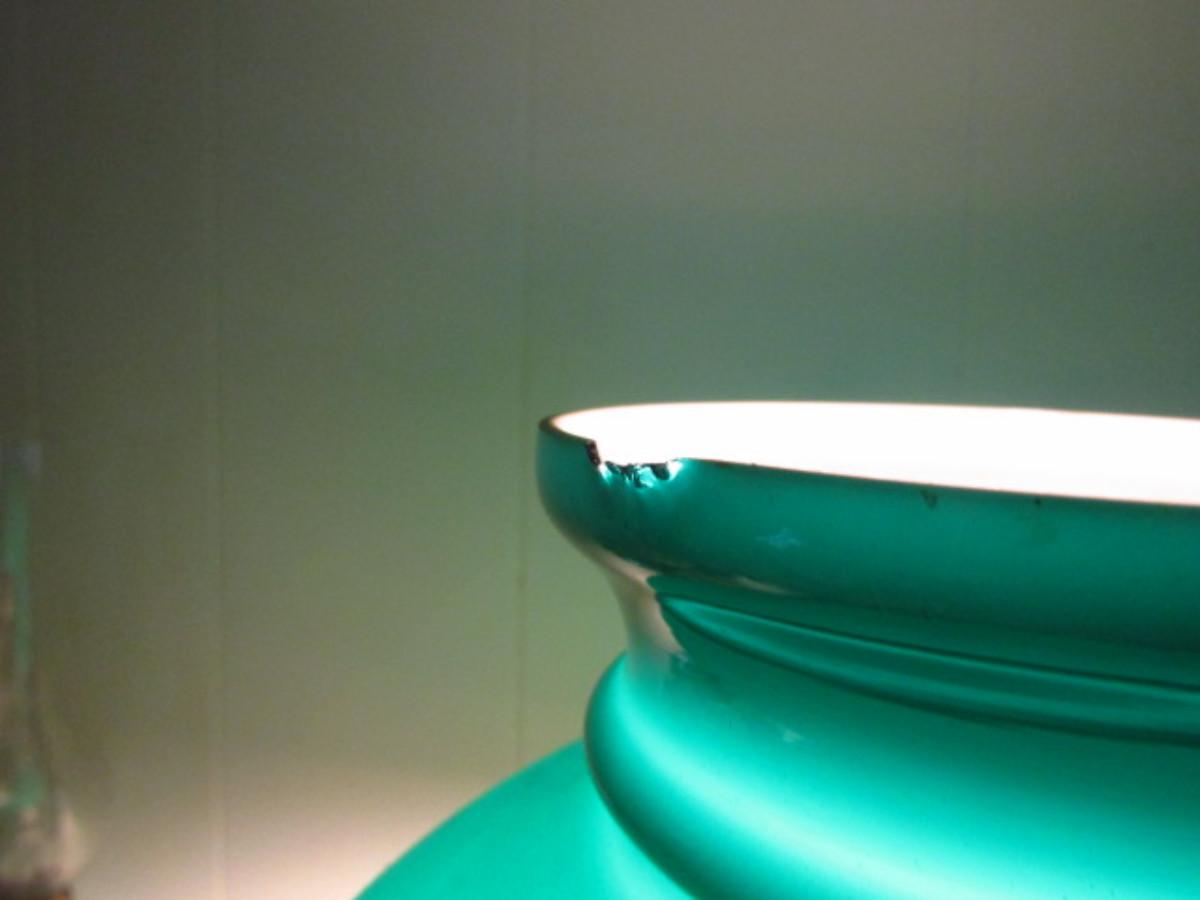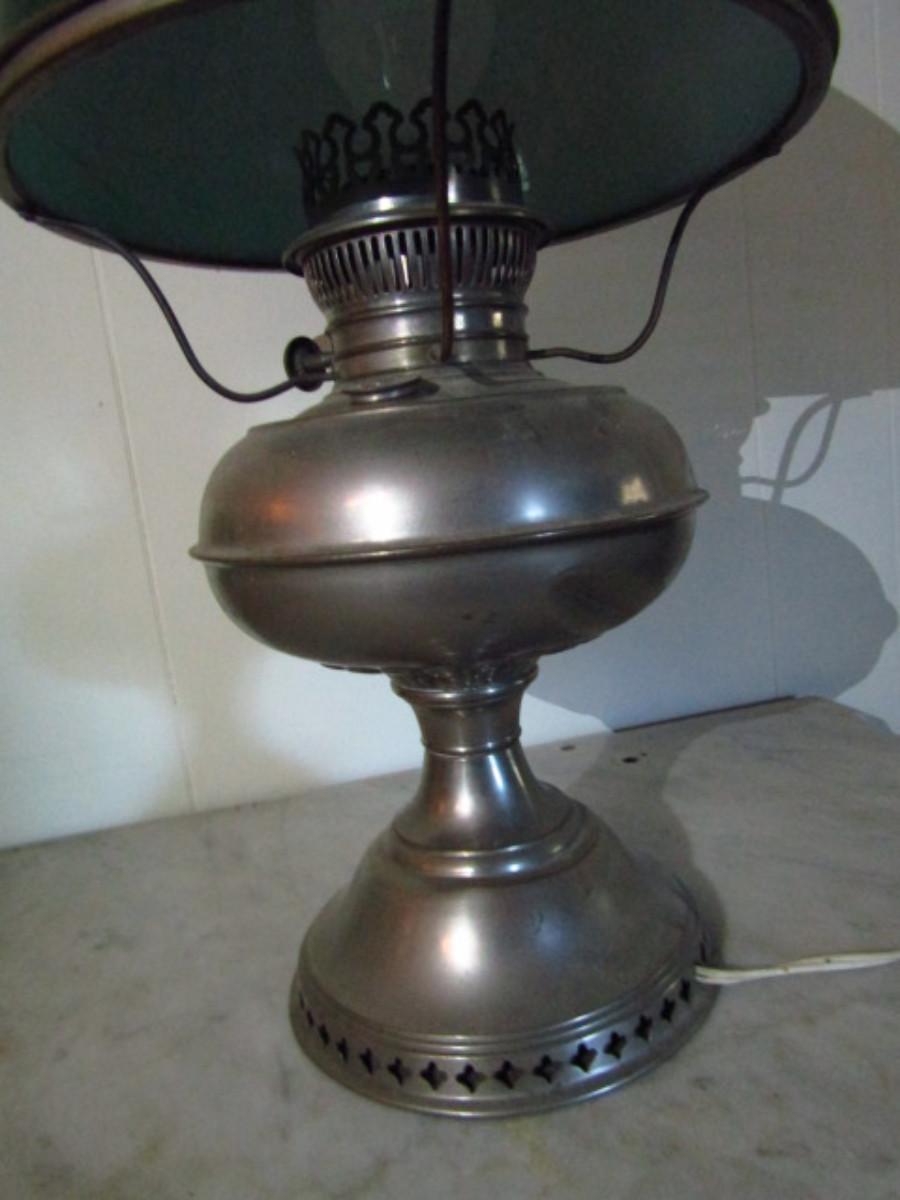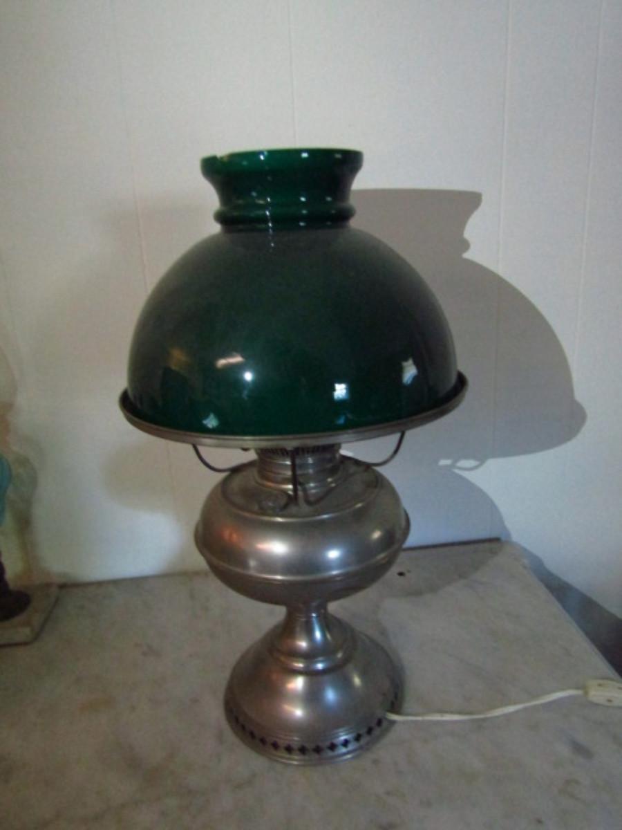 Metal Oil Lamp Style Electric Lamp with Green Glass Shade (#577), Please see all pictures- shade has a chip on top edge.