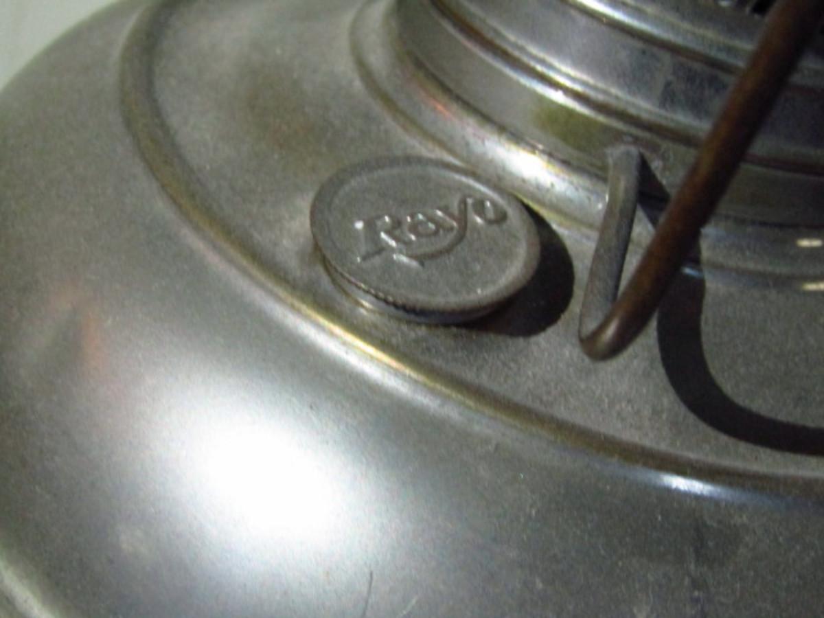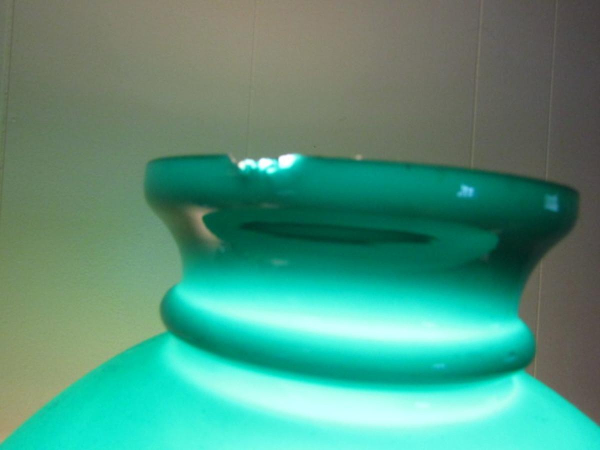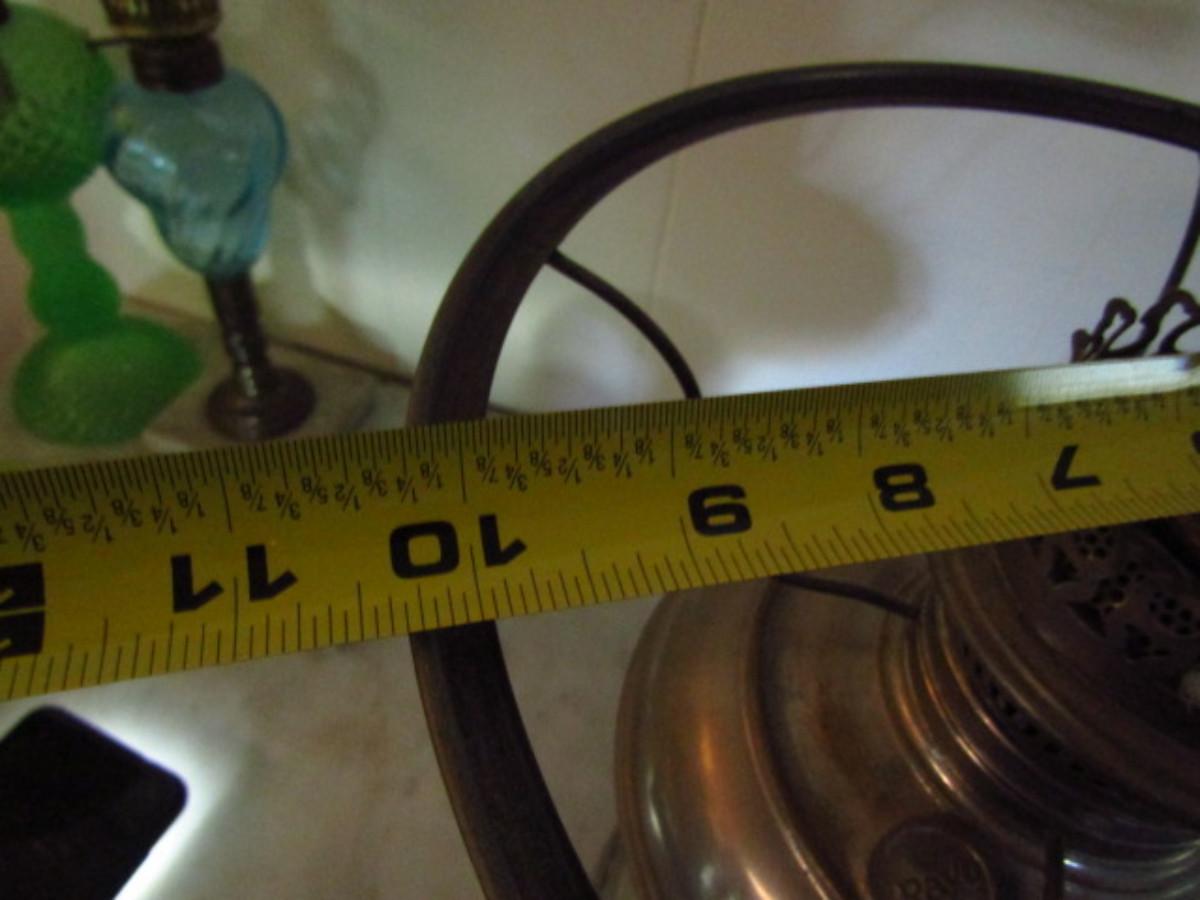 Metal Oil Lamp Style Electric Lamp with Green Glass Shade (#577), Please see all pictures- shade has a chip on top edge.