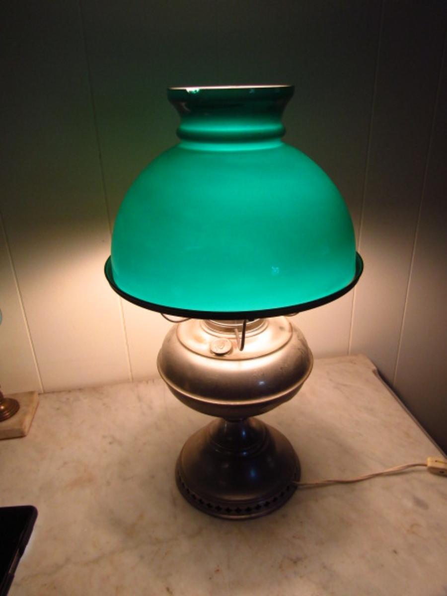 Metal Oil Lamp Style Electric Lamp with Green Glass Shade (#577)