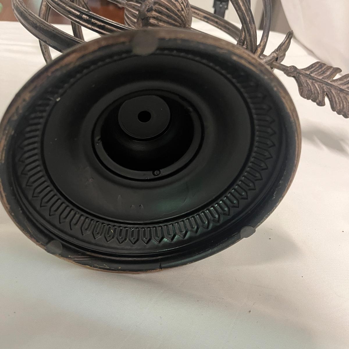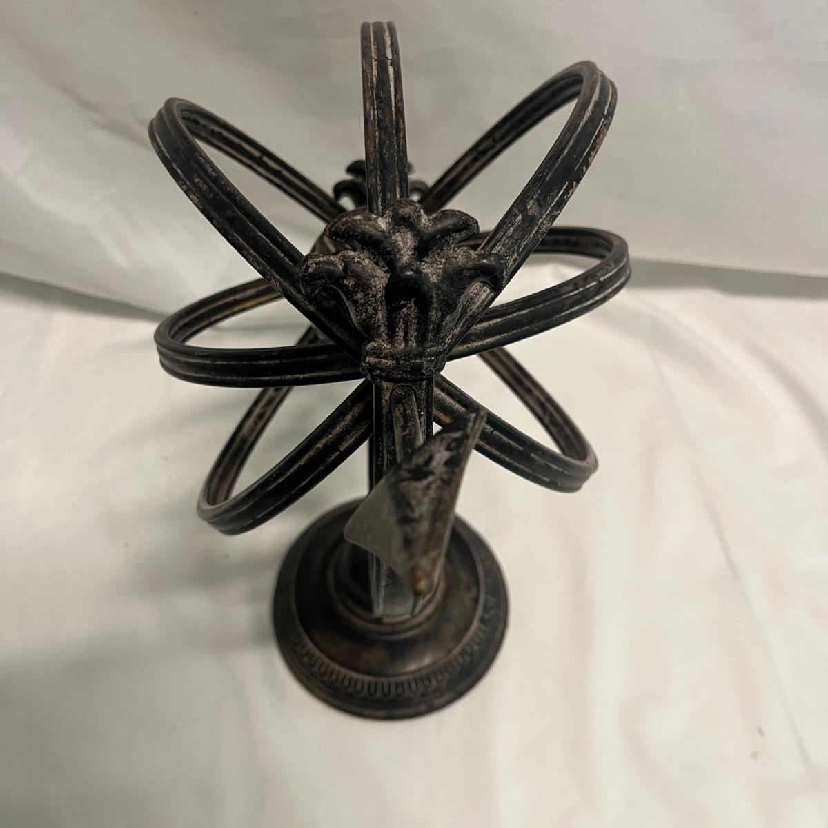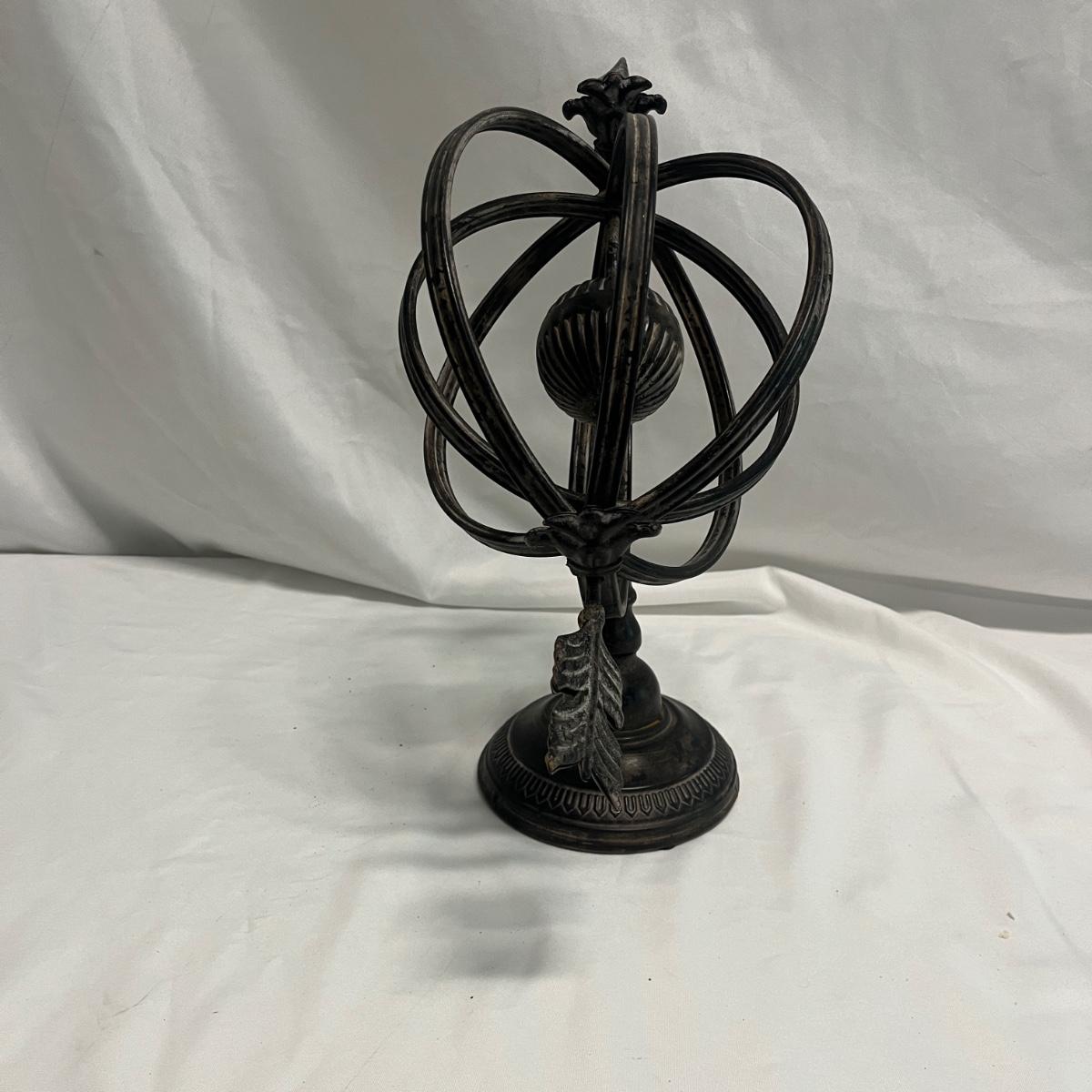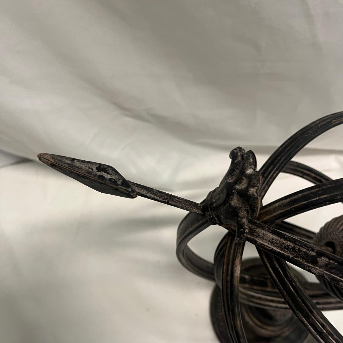 This metal orb has a distressed dark finish. Metal bands shaped in a globe-like shape have an arrow through the center, all on a rounded base and Fleur-De-Lis style accent on both ends. It measures 19.5” x 9” x 16.5”H.