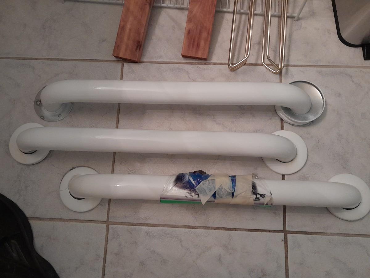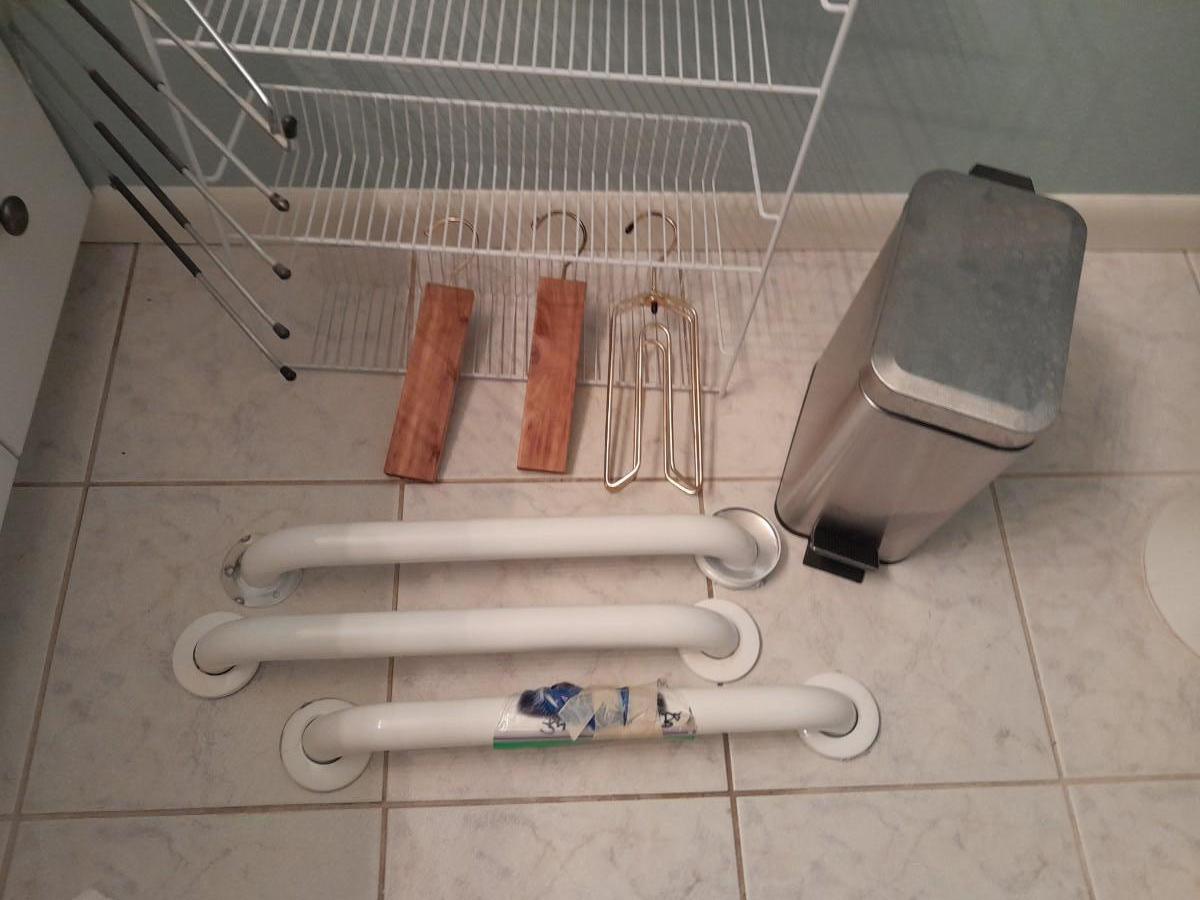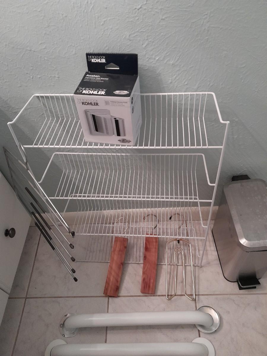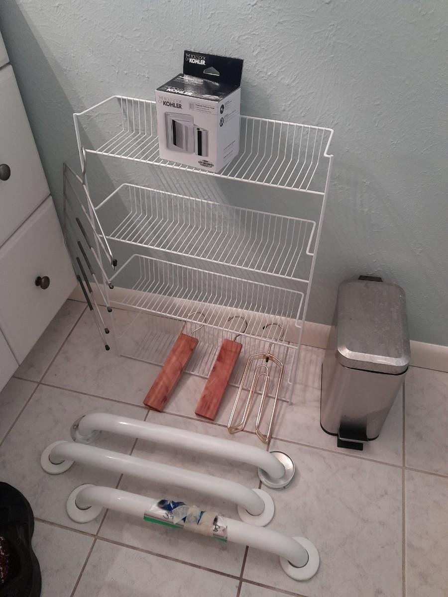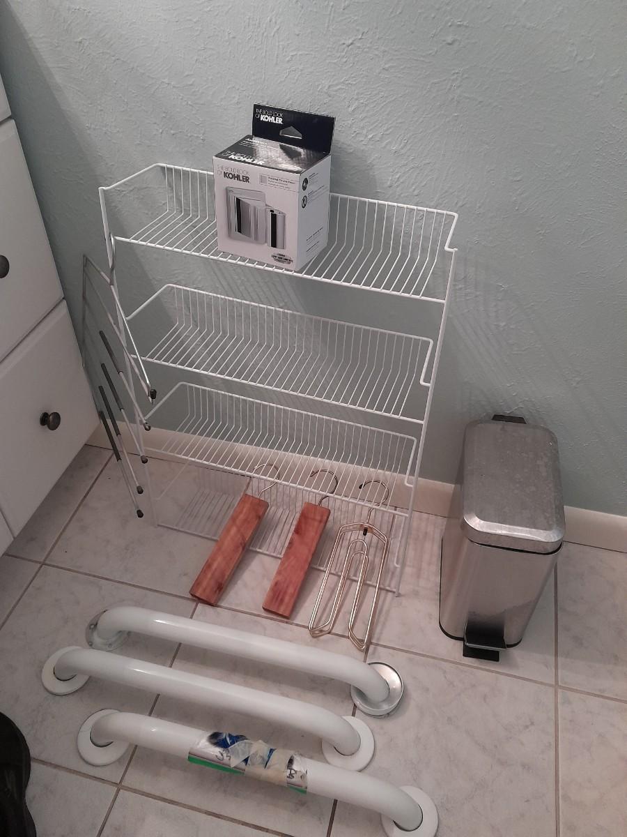 METAL ORGANIZING RACK, THREE METAL SAFTEY HANDLES, KOHLER CHROME HOOK, AND A SMALL STAINLESS TRASHCAN