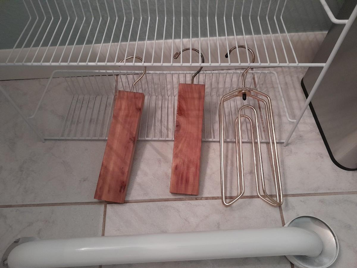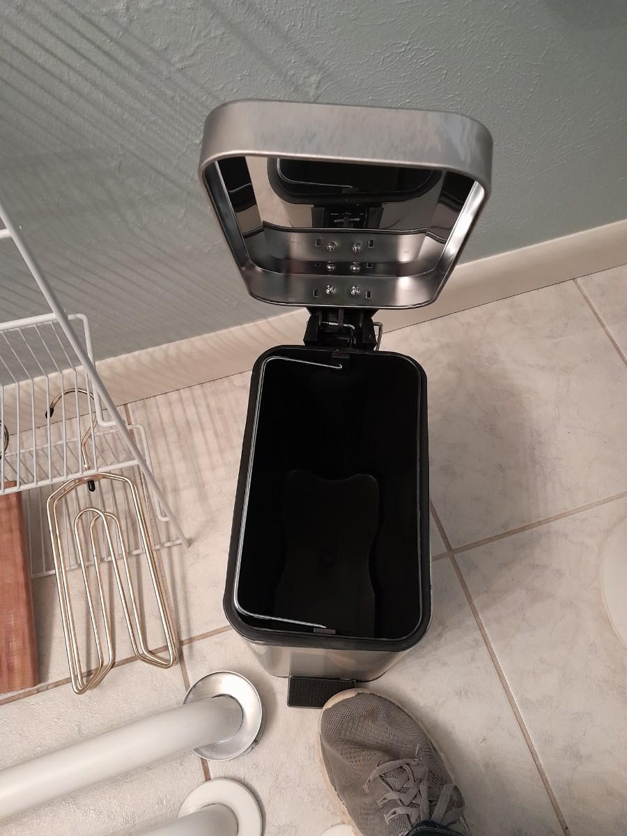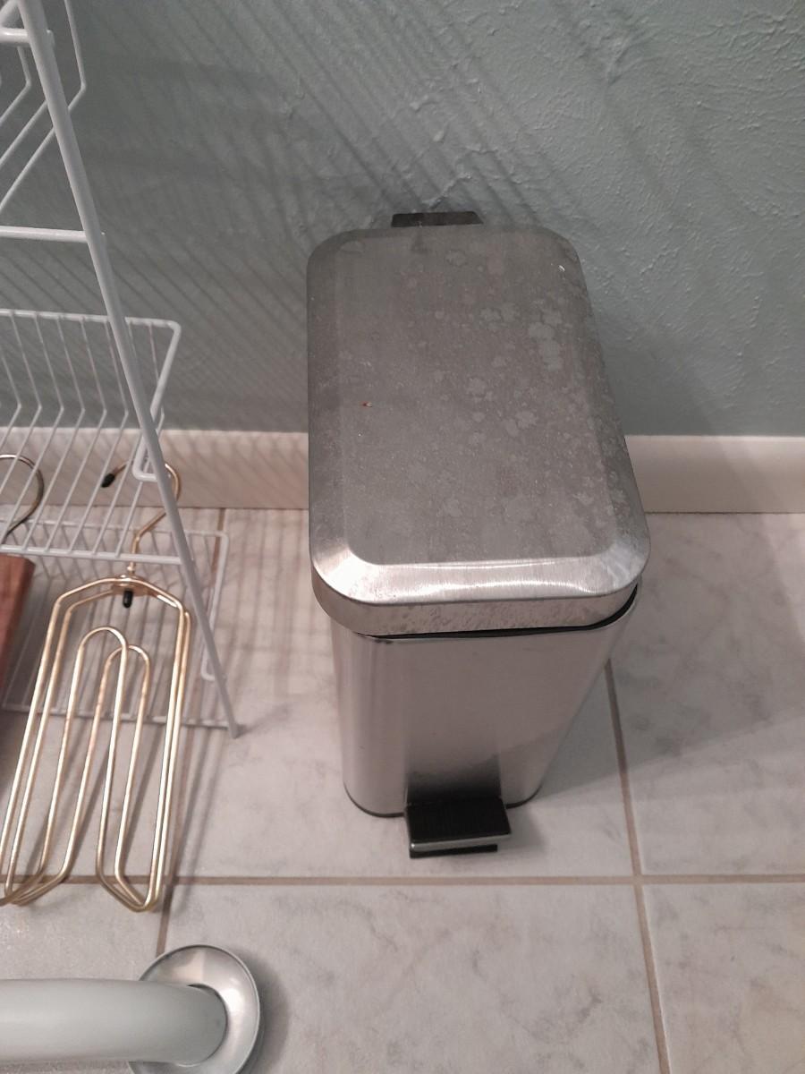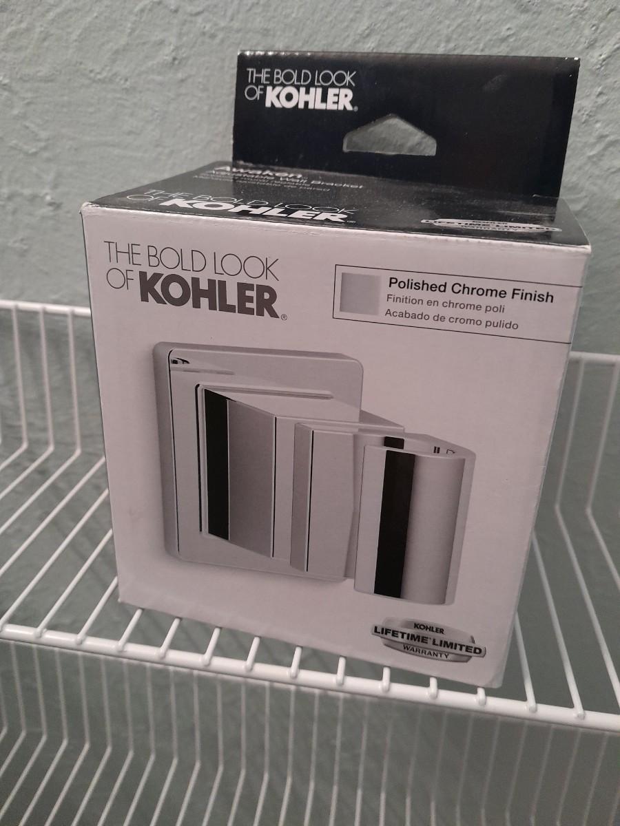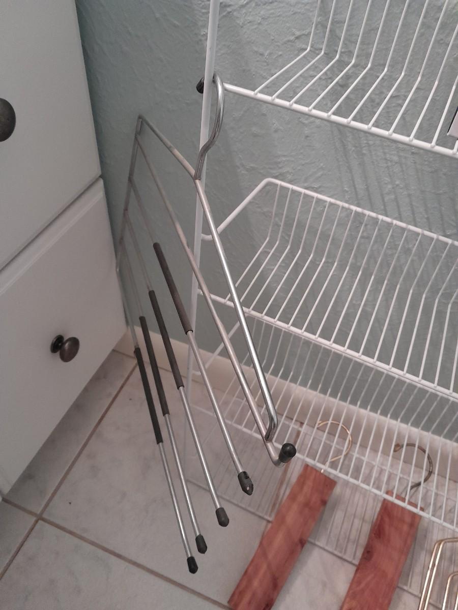 METAL ORGANIZING RACK, THREE METAL SAFTEY HANDLES, KOHLER CHROME HOOK, AND A SMALL STAINLESS TRASHCAN