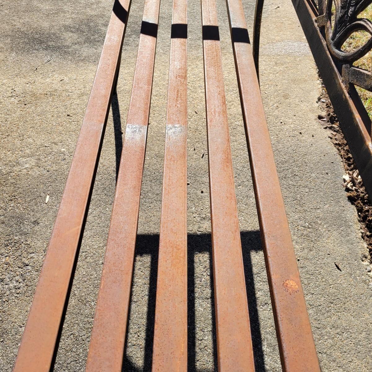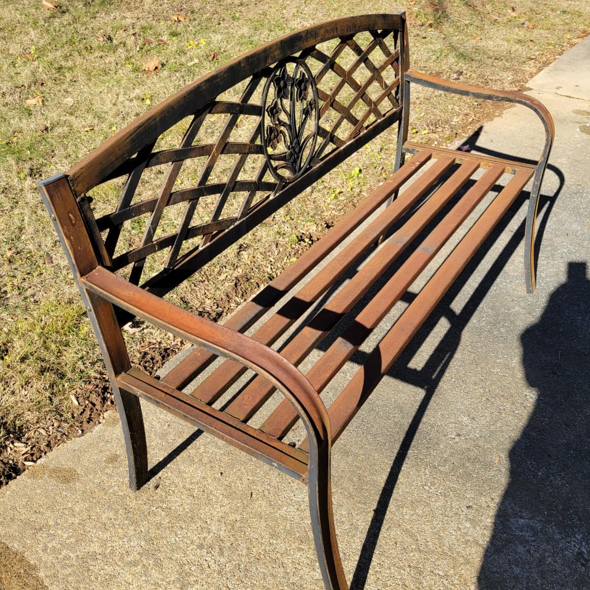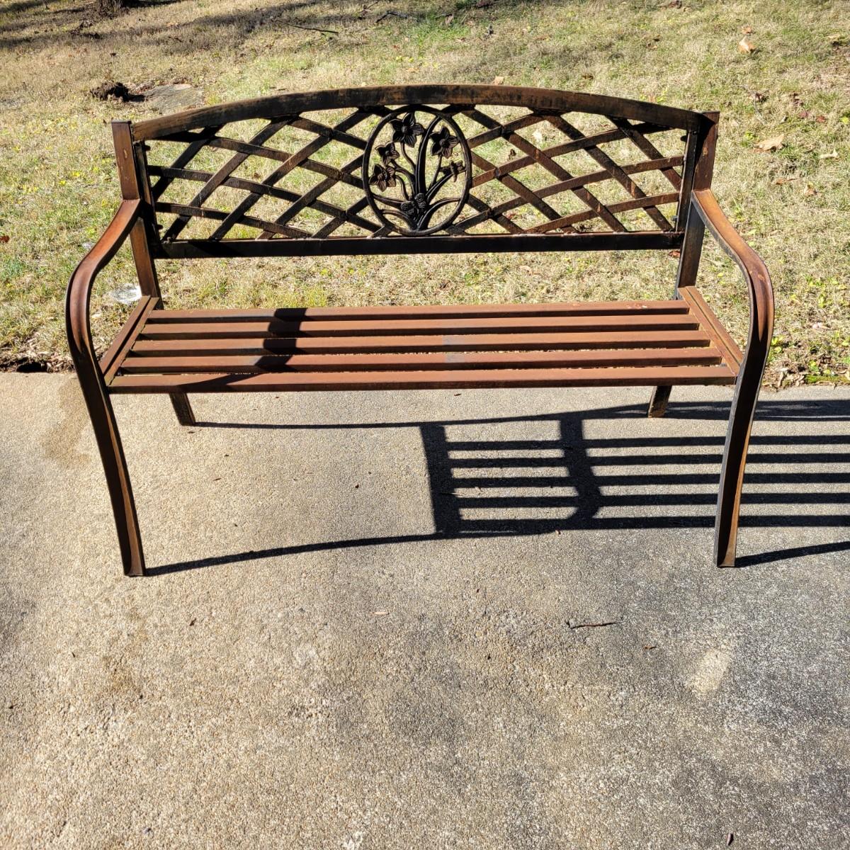 A metal outdoor bench that measures approximately 50.5" x 19" x 33.5"H. The bench has lost most of its paint and has surface rust. Local pickup only. Winning bidder must bring assistance to help move and load this item due to its weight and/or size.