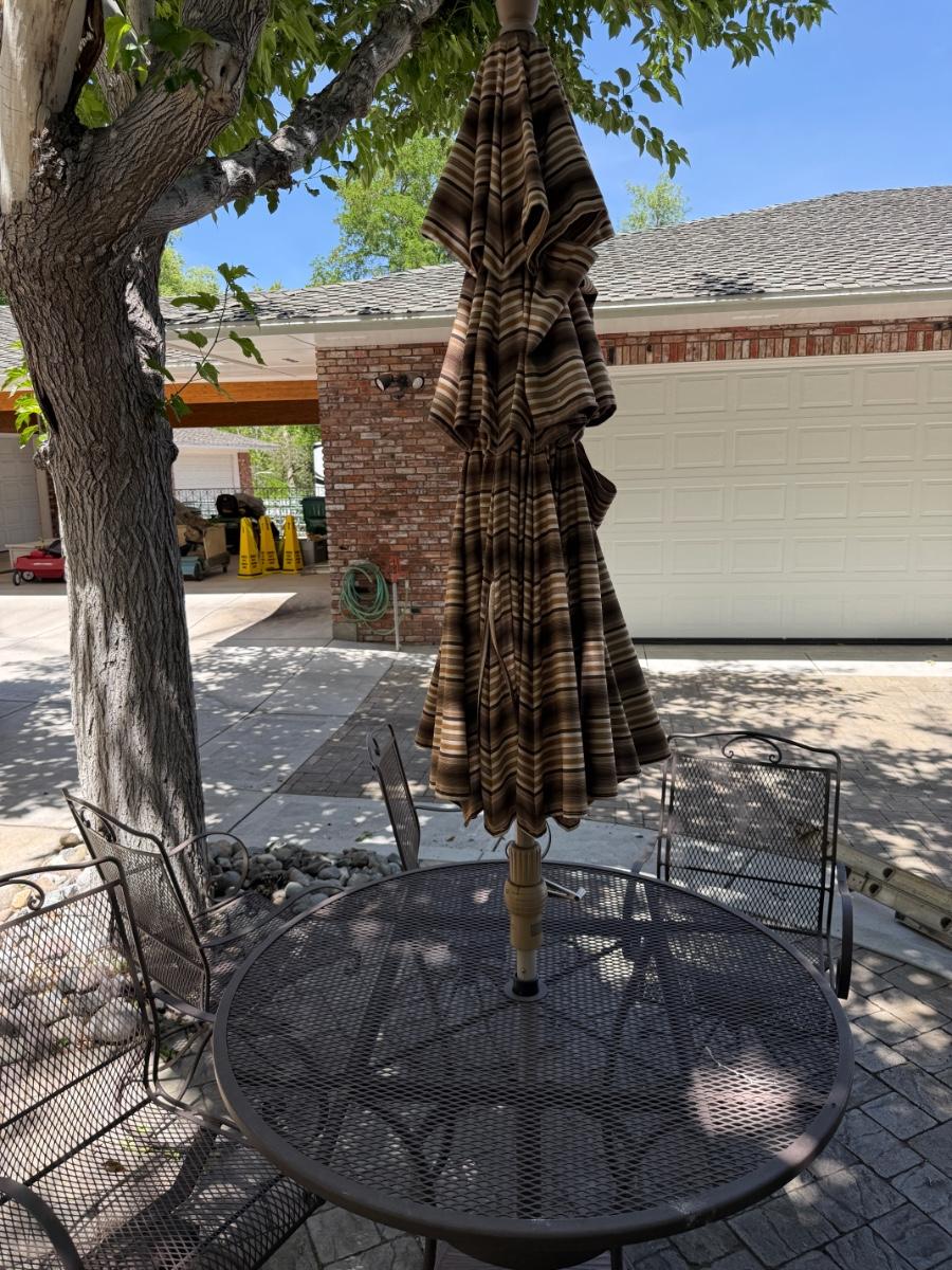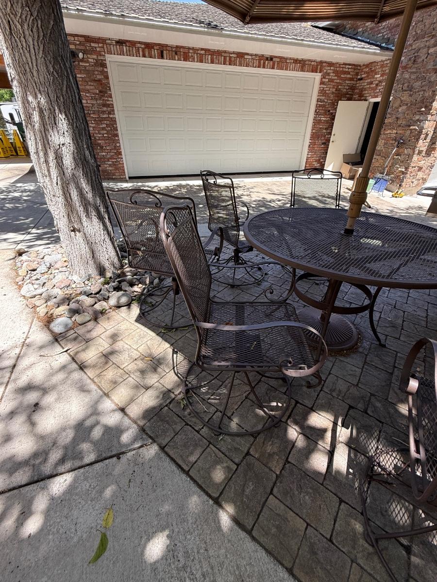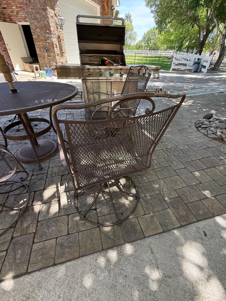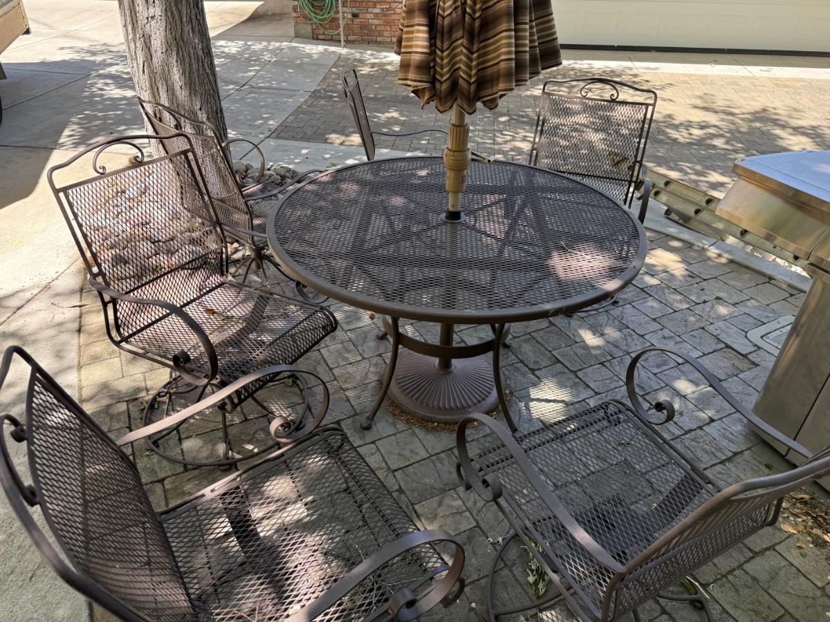 Metal outdoor Patio Set w/6 rocking chairs/umbrella and also think I have covers for all of these pieces.