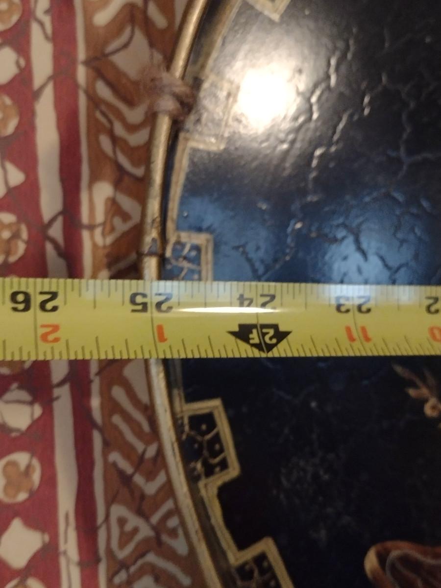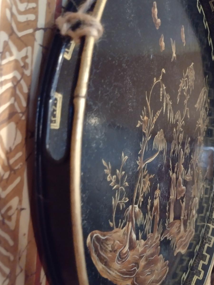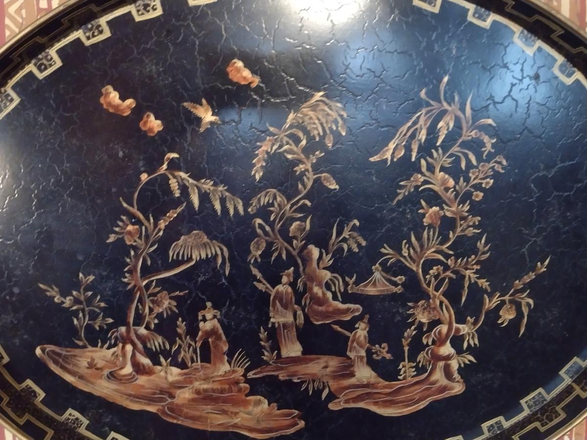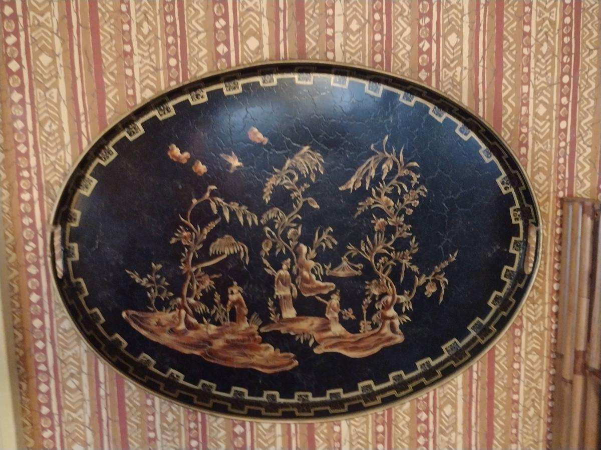 Metal Oval Serving Tray with Painted Asian Design. Approx 25" x 19".