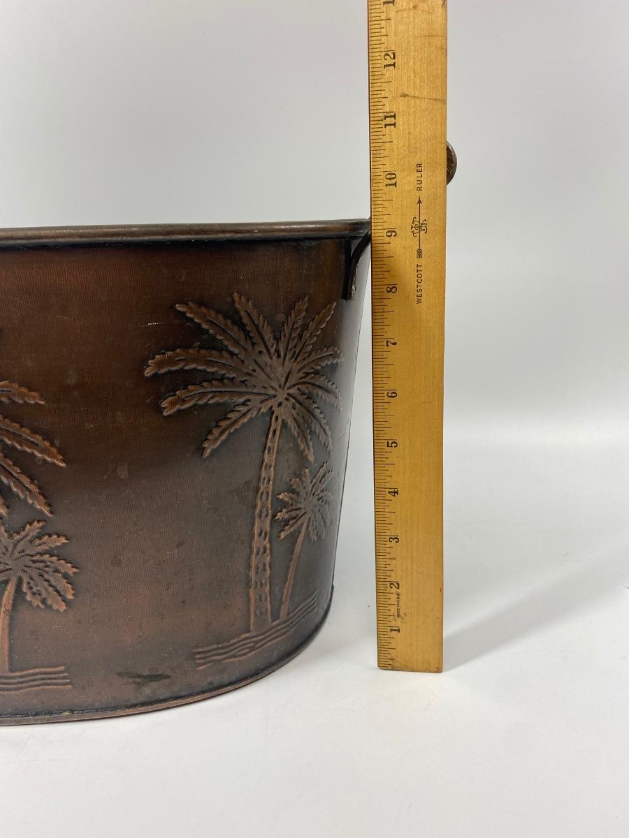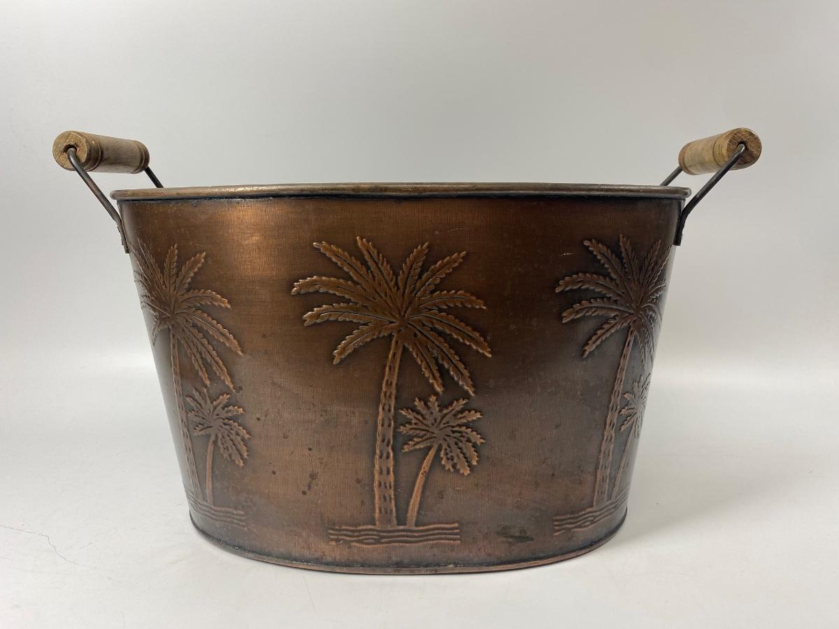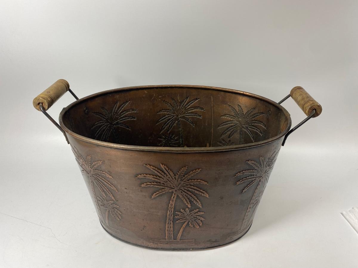 Metal Palm Tree Embossed Double Handle Bucket. Copper colored finish. Great as an ice bucket or open cooler for drinks at your next BBQ.