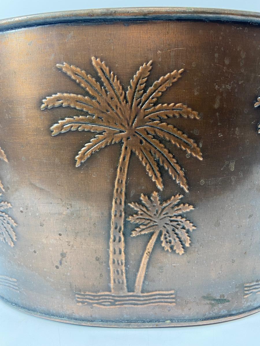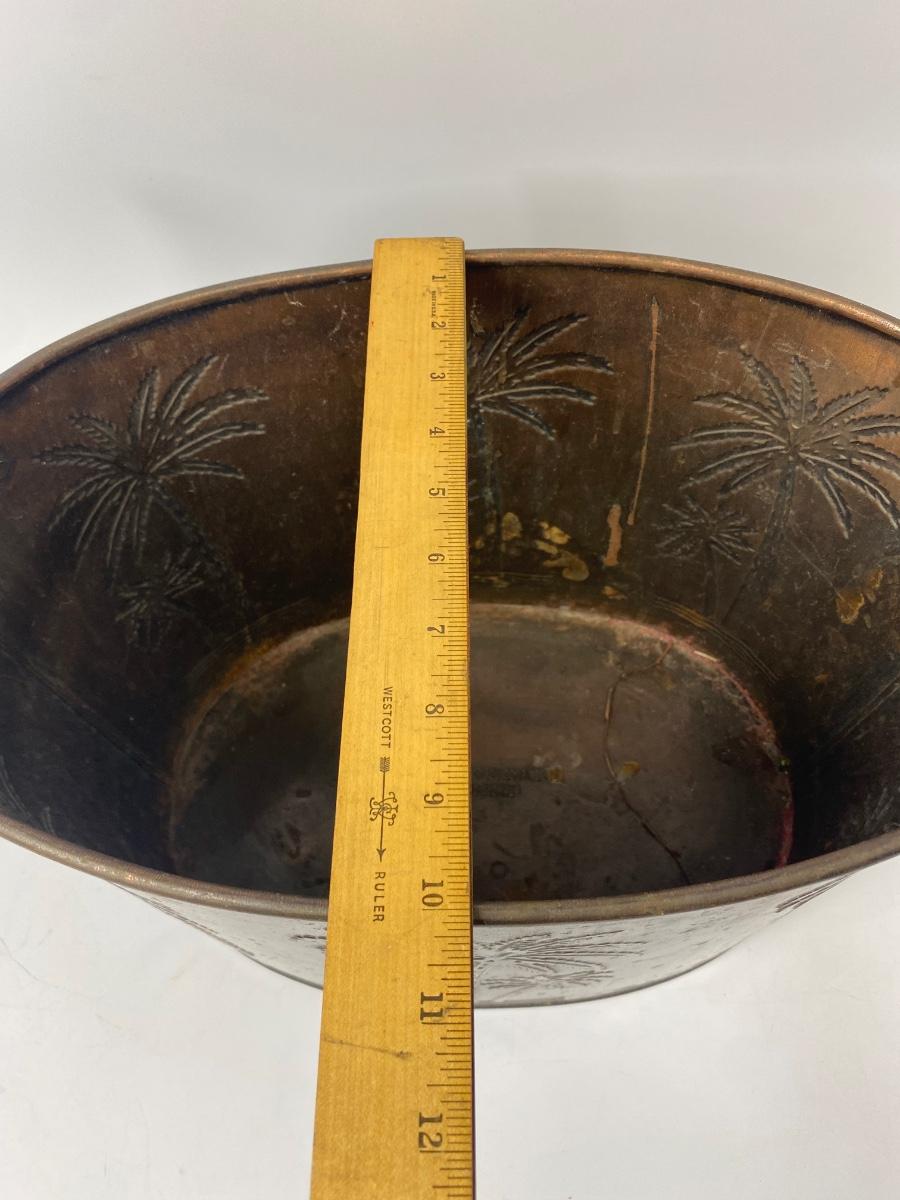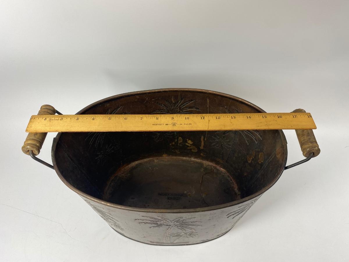 Metal Palm Tree Embossed Double Handle Bucket. Copper colored finish. Great as an ice bucket or open cooler for drinks at your next BBQ.
