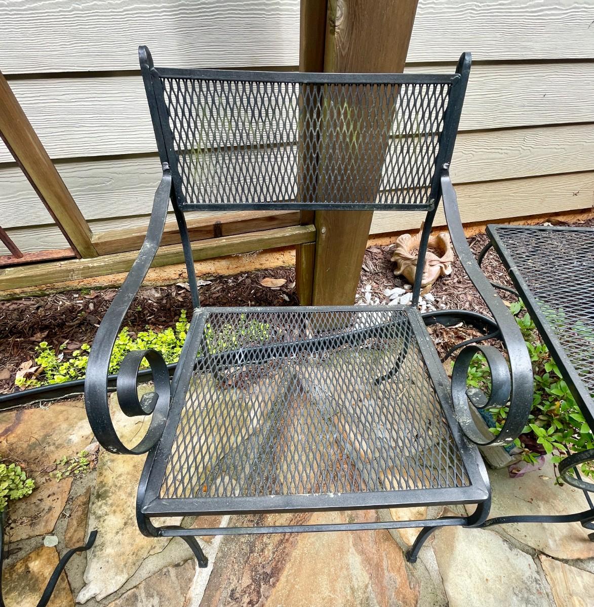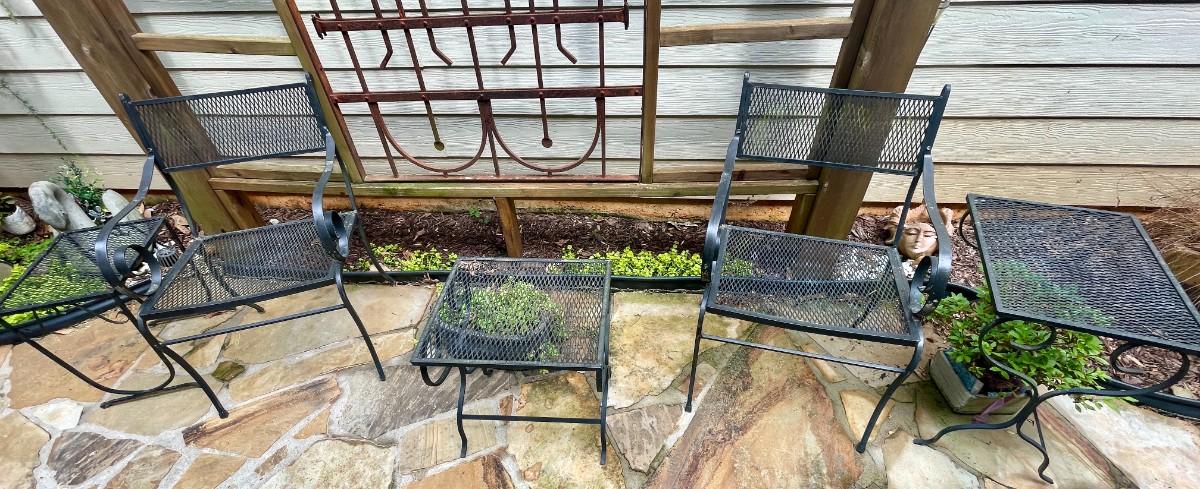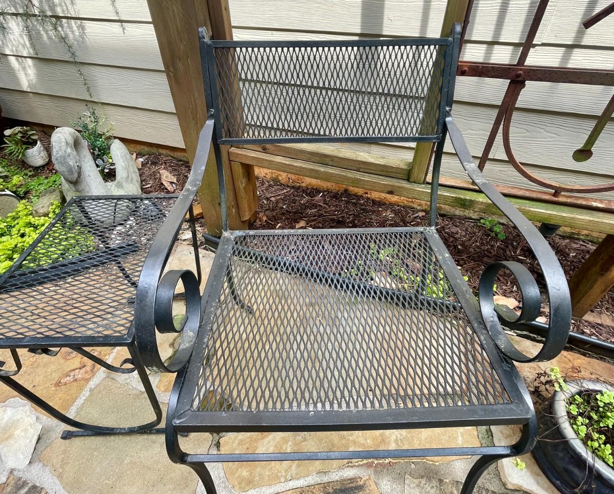 2 Chairs and 3 Small Metal Tables; Set of 5 Pieces. Very good condition.