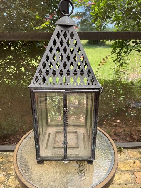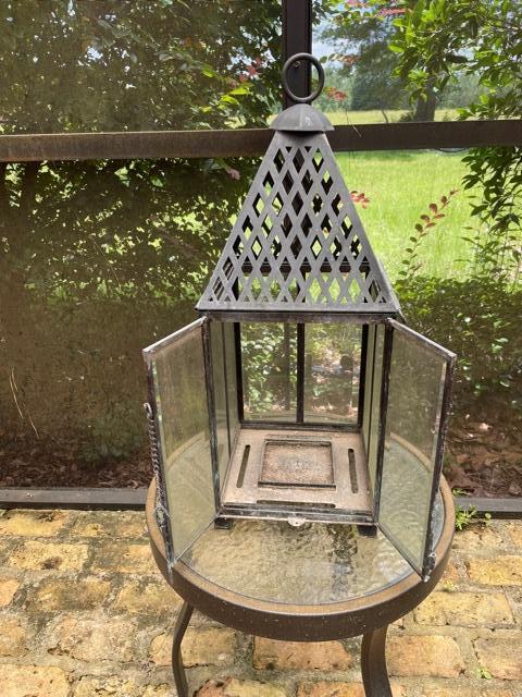 Metal Carriage Lamp holds pillar candle. Glass sides & solid base