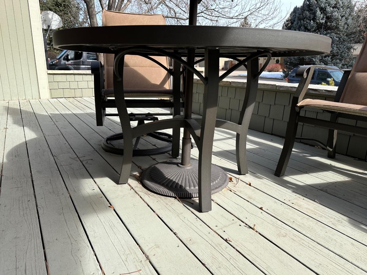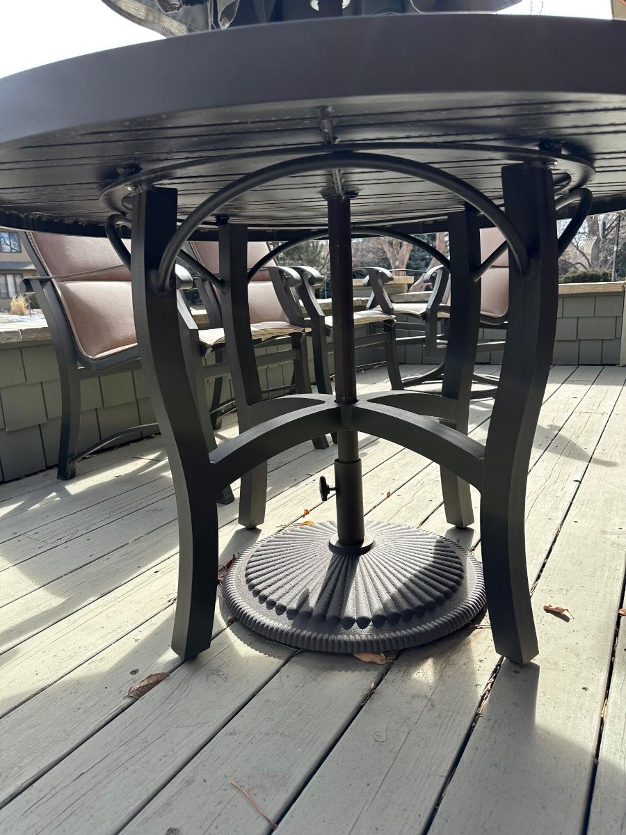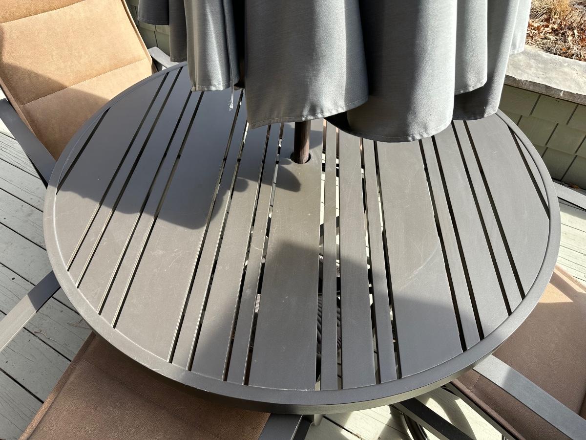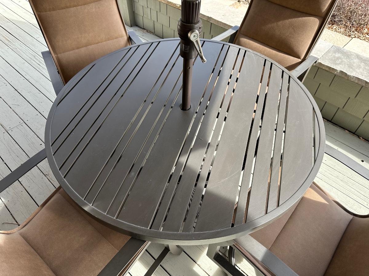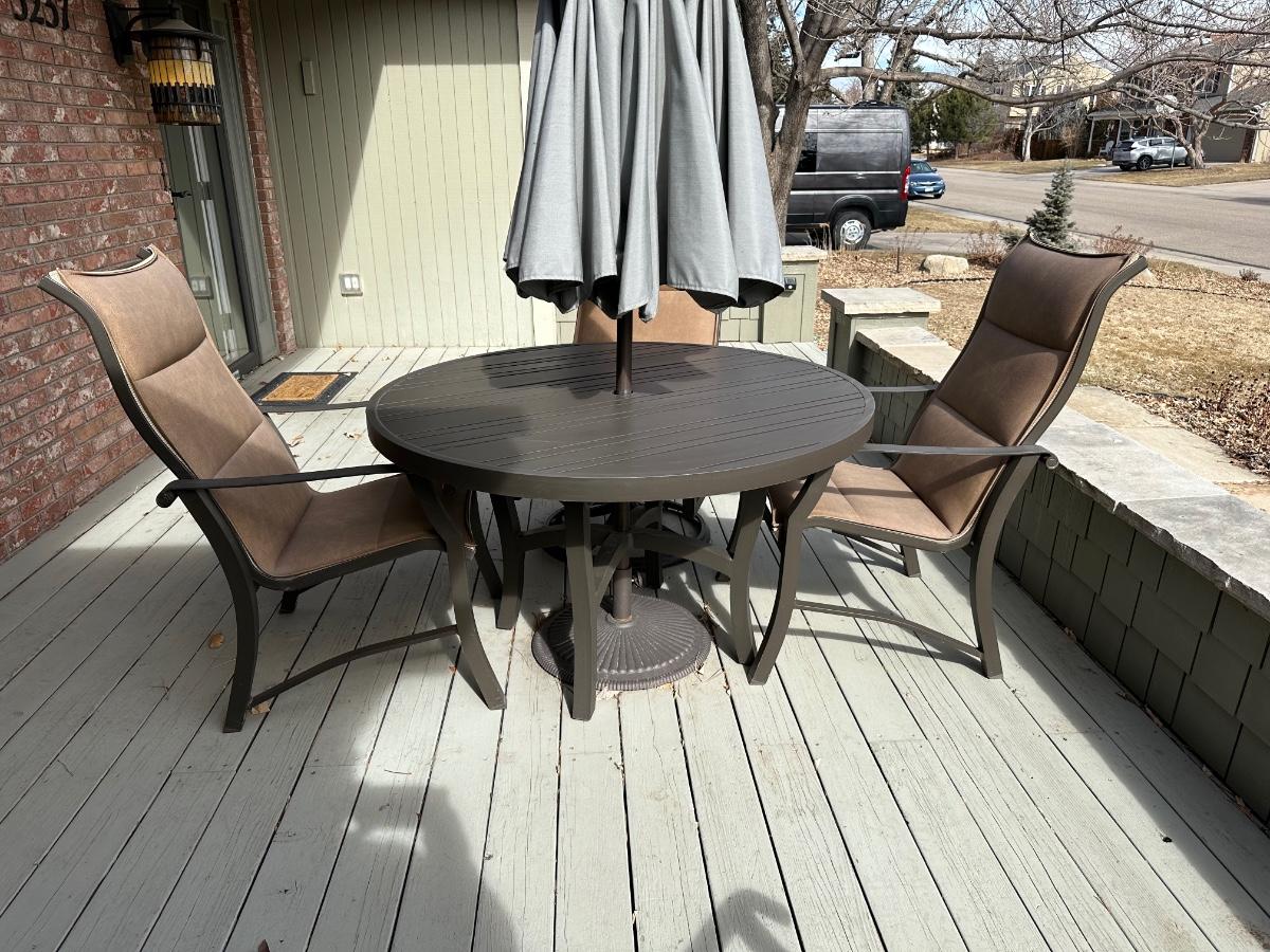 METAL PATIO TABLE, 4 CHAIRS, AND UMBRELLA W/STAND