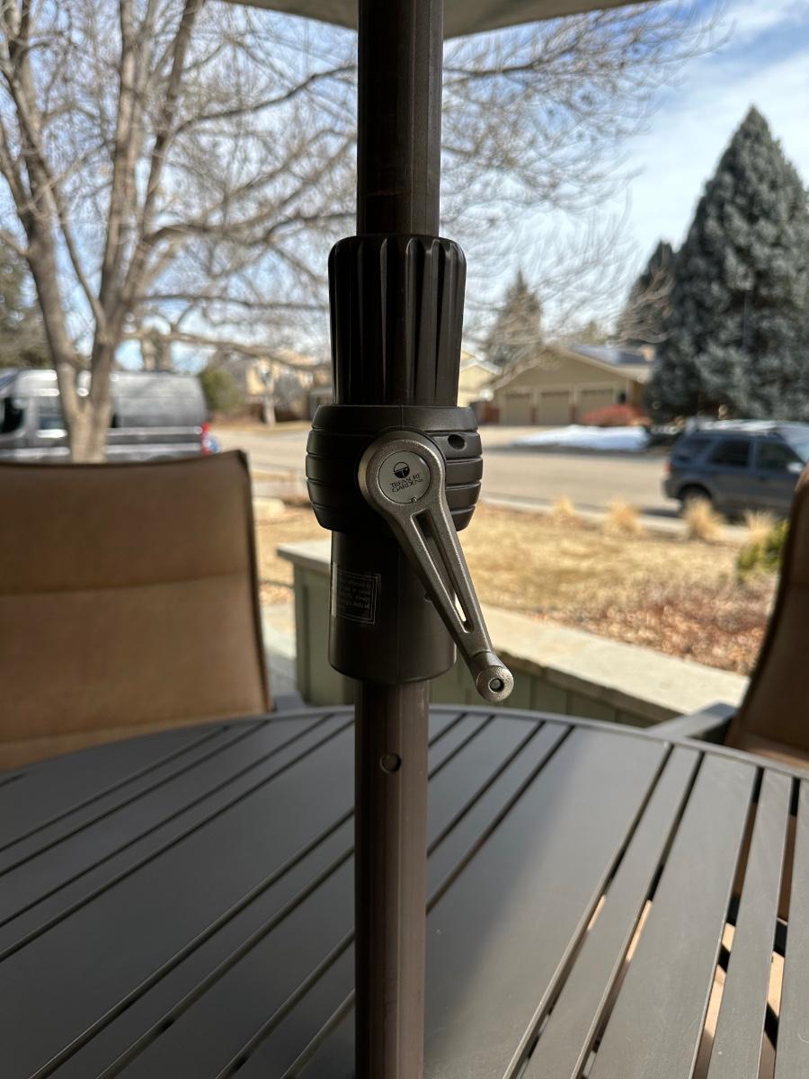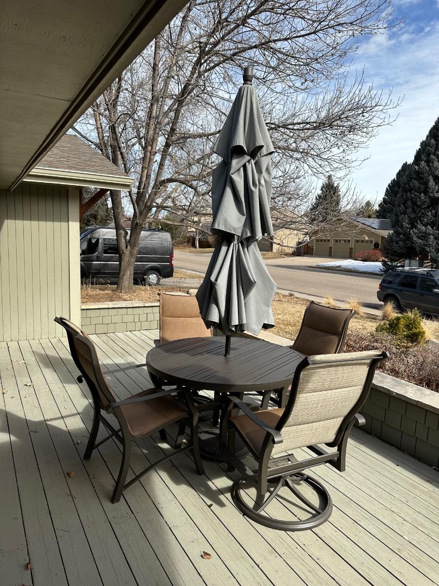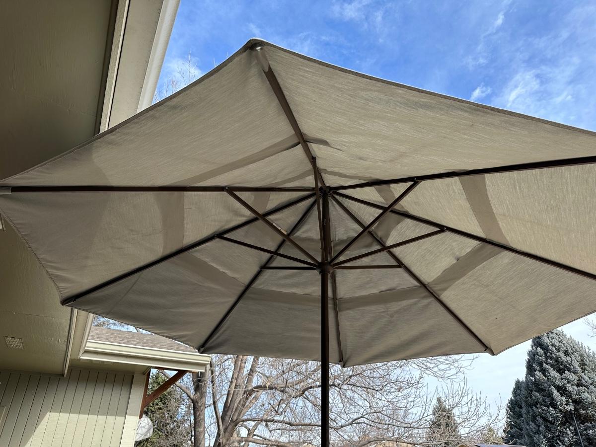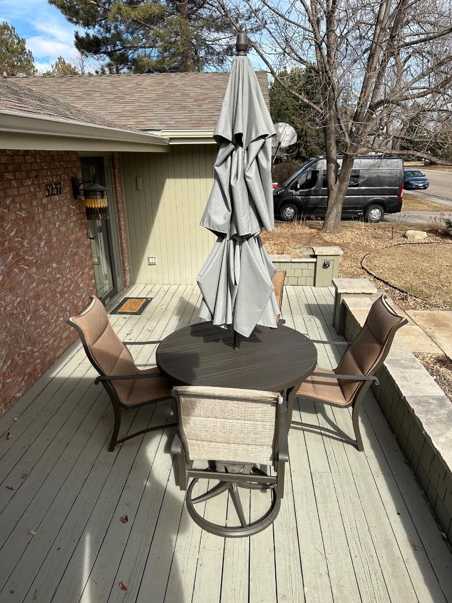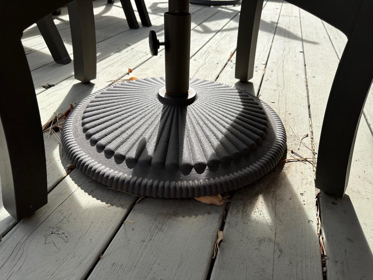 METAL PATIO TABLE, 4 CHAIRS, AND UMBRELLA W/STAND