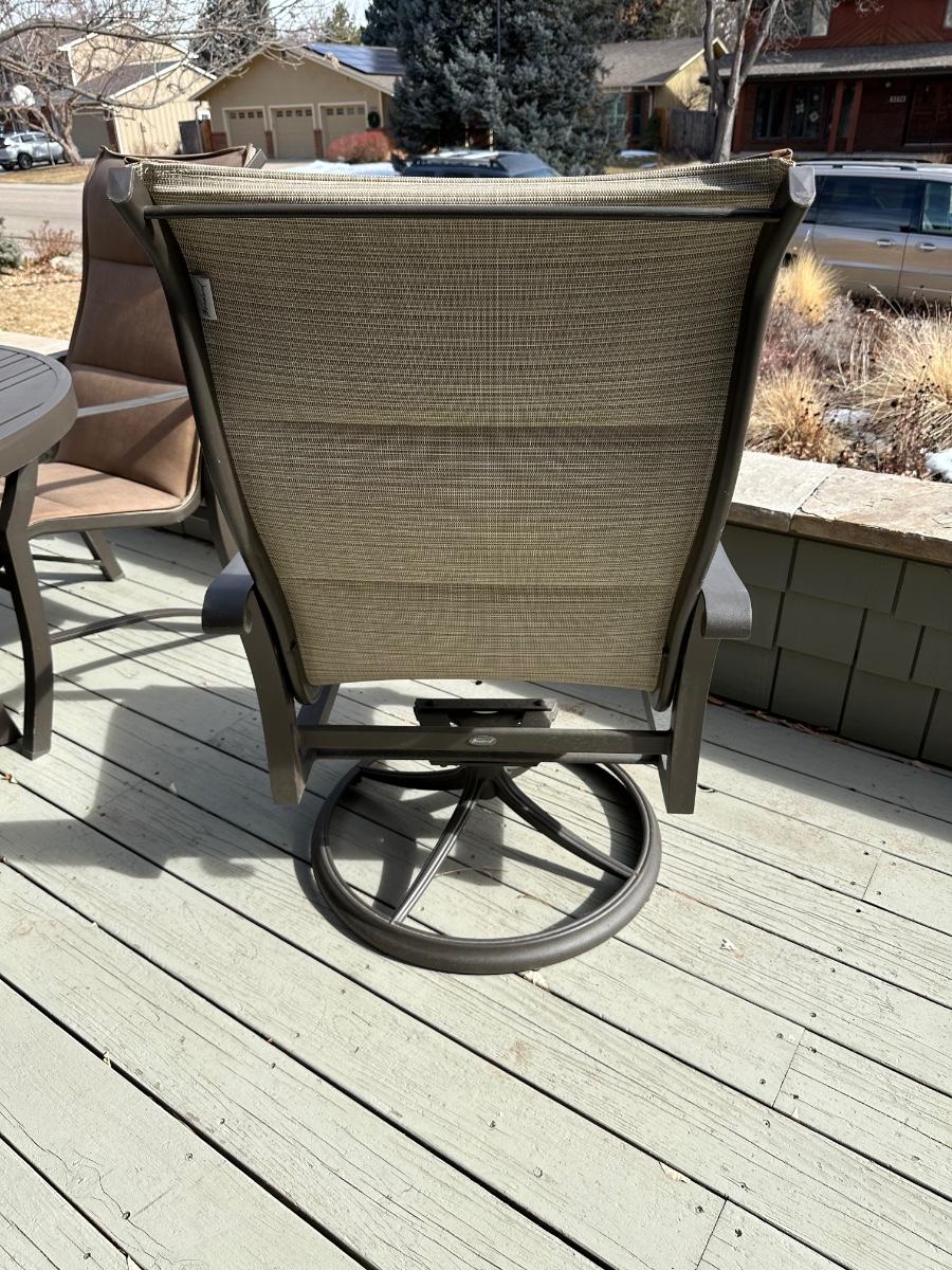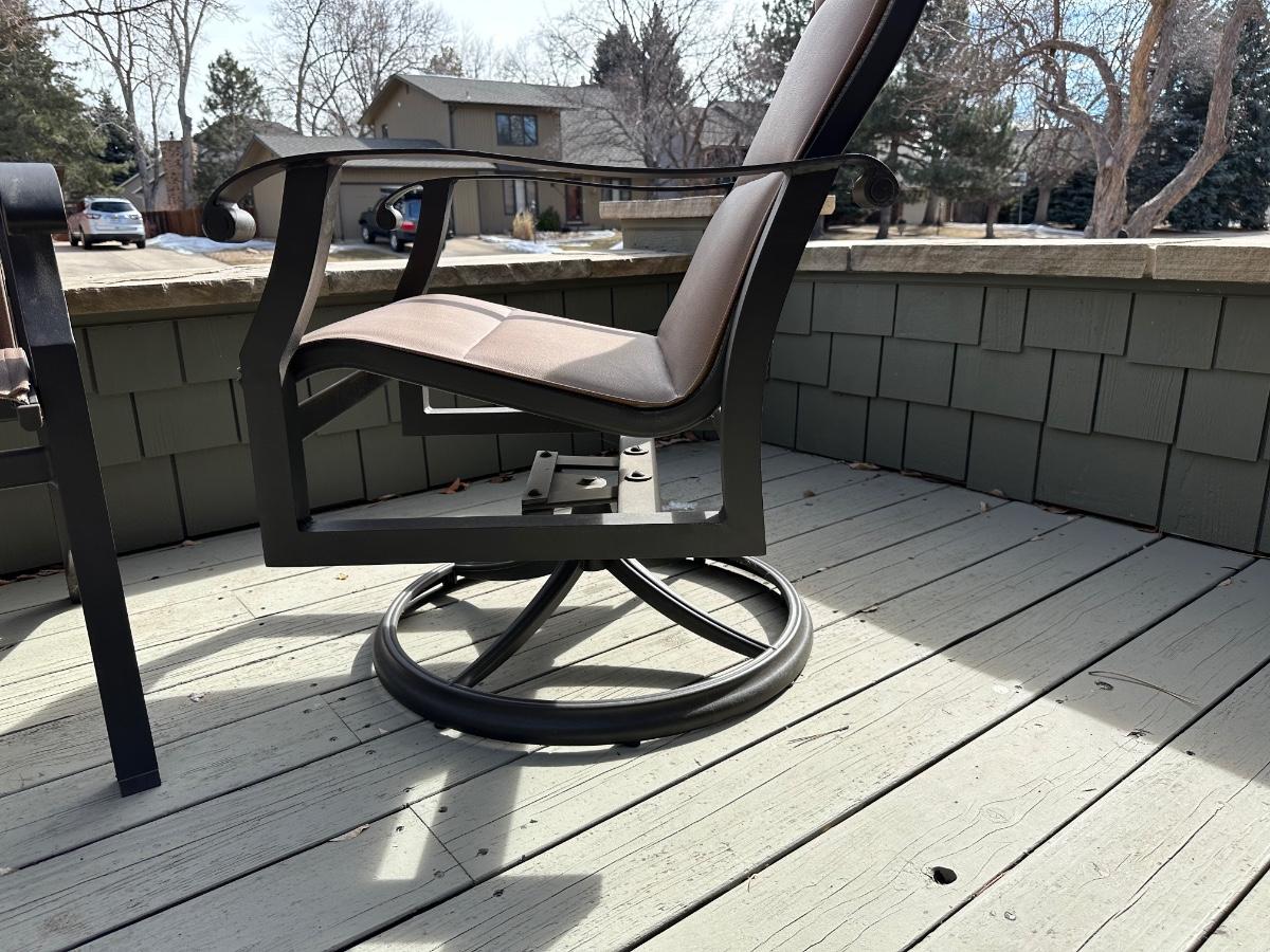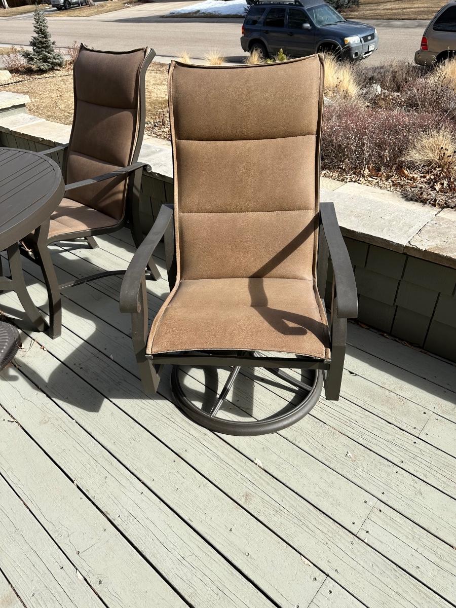 2 CHAIRS ARE SWIVEL ROCKERS, 1 OF THEM HAS A LITTLE DAMAGE TO THE CUSHION (SEE PIC) ALL IN GREAT SHAPE!