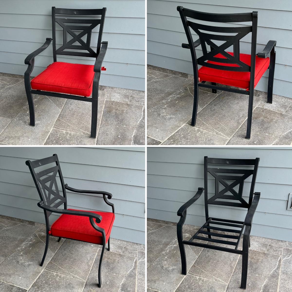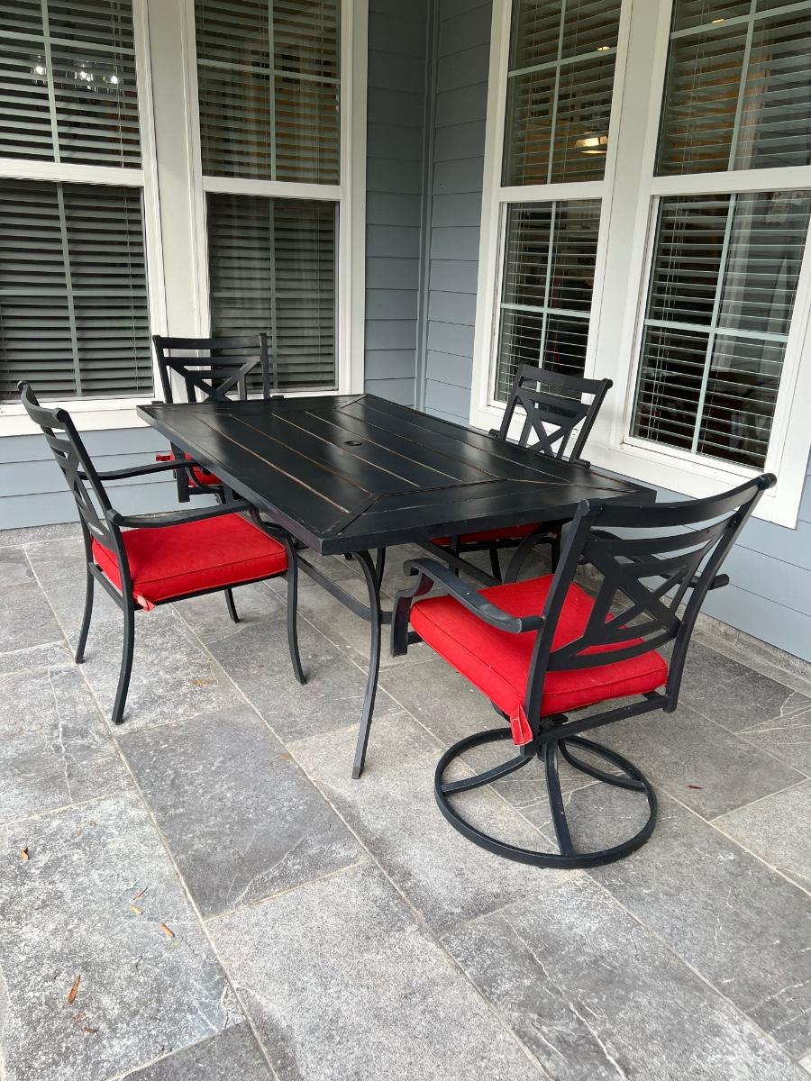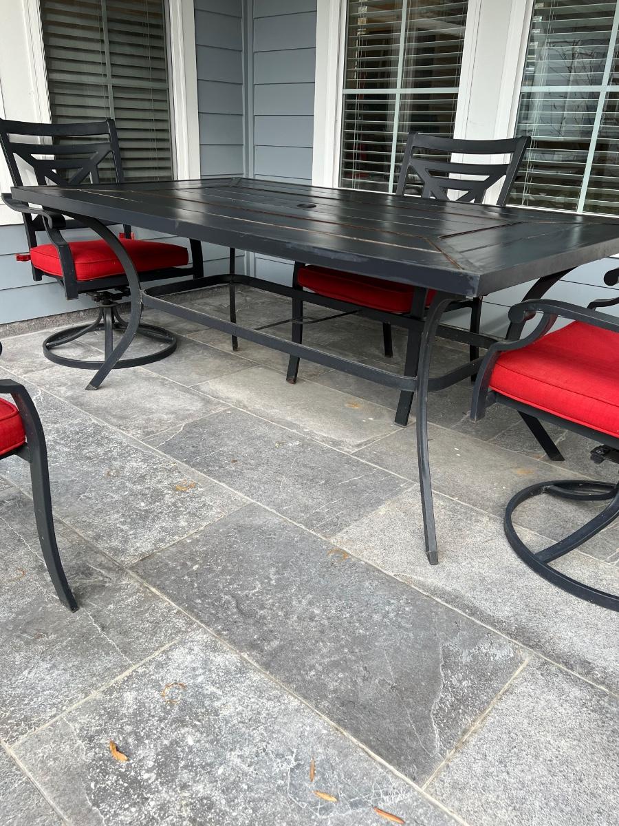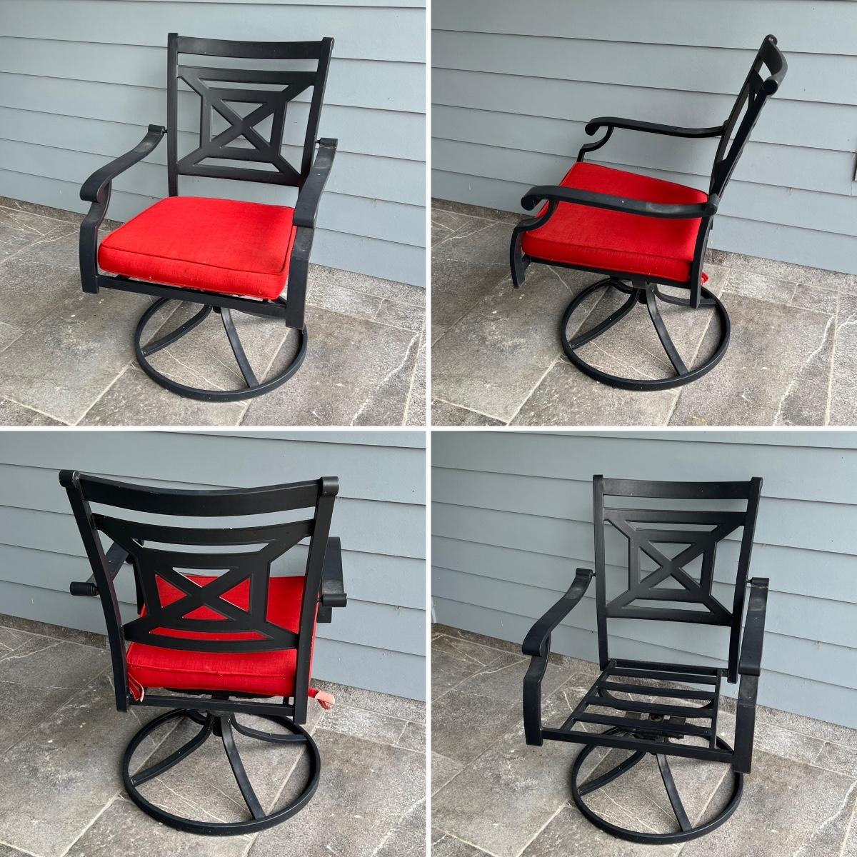 Set includes Table, 2 regular chairs, 2 swivel chairs & 4 seat cushions ~ Medium weight metal ~ Table & chairs have surface rust, see photos ~ Was porch kept ~ Seat cushions need additional cleaning ~ Table = 28” H x 70” W x 40” D ~ Chairs = 36” H x 24” W x 22” D