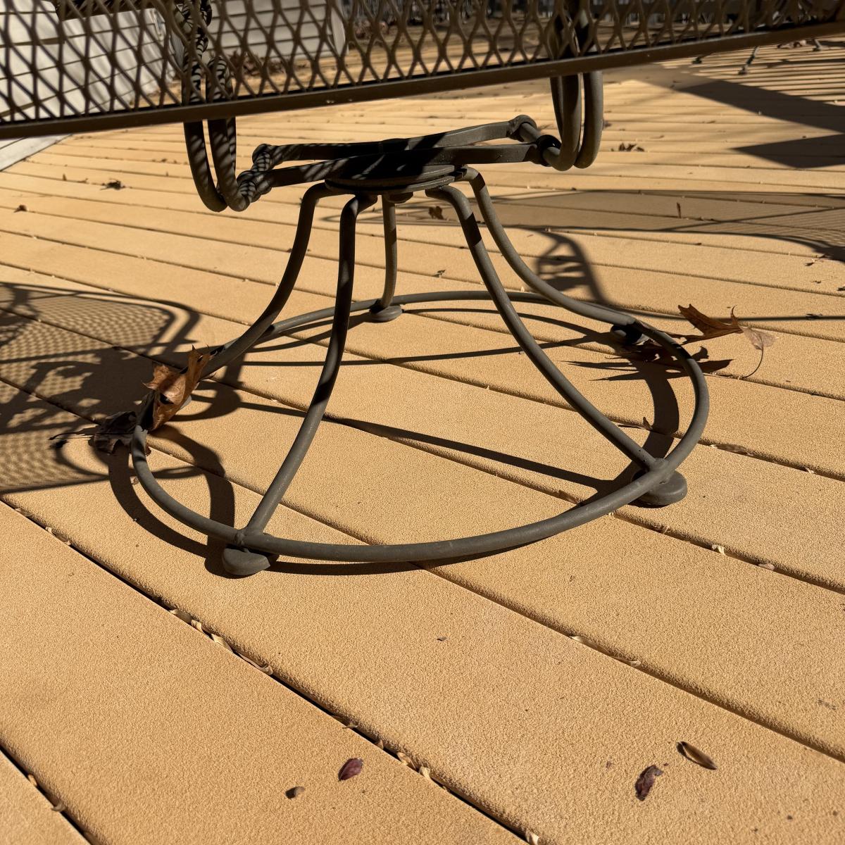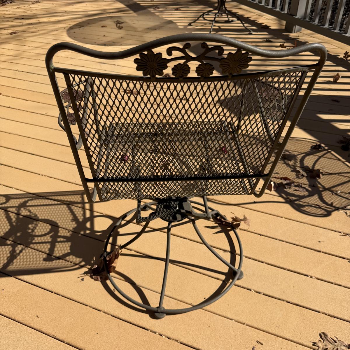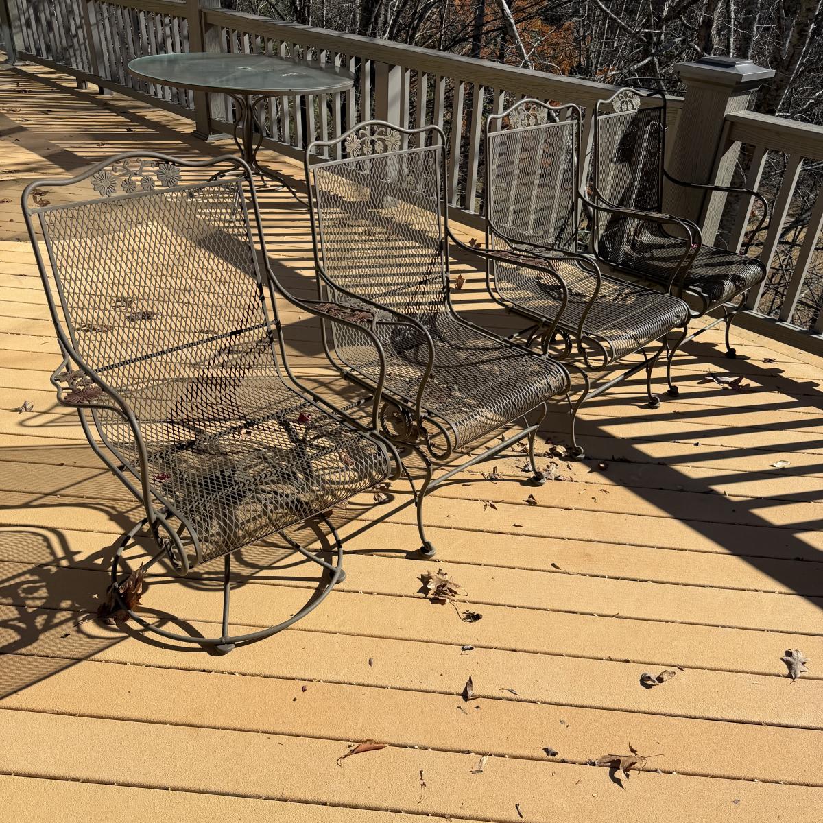 Lot includes a metal table with glass top, three metal spring rockers and one metal swivel spring rocker chair. Table measures 47”D x 29”H and chairs measure 27” x 25” x 38”H with a 16” seat height.