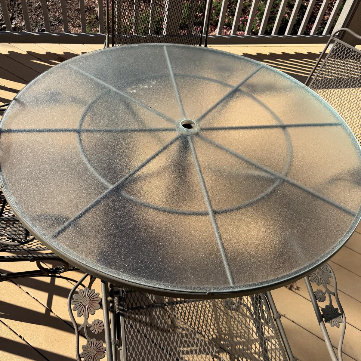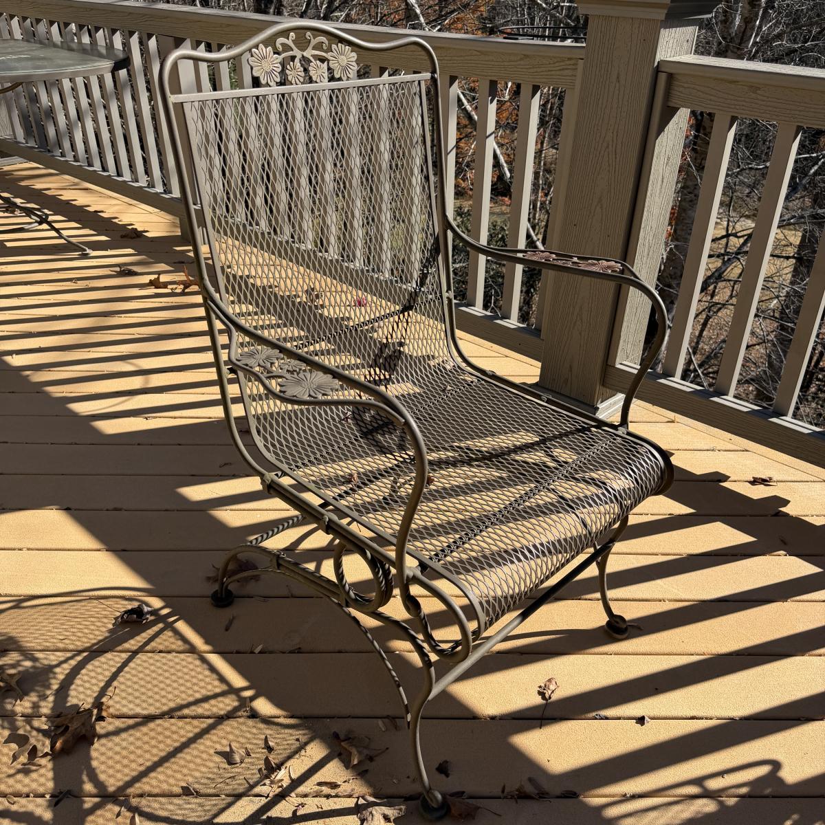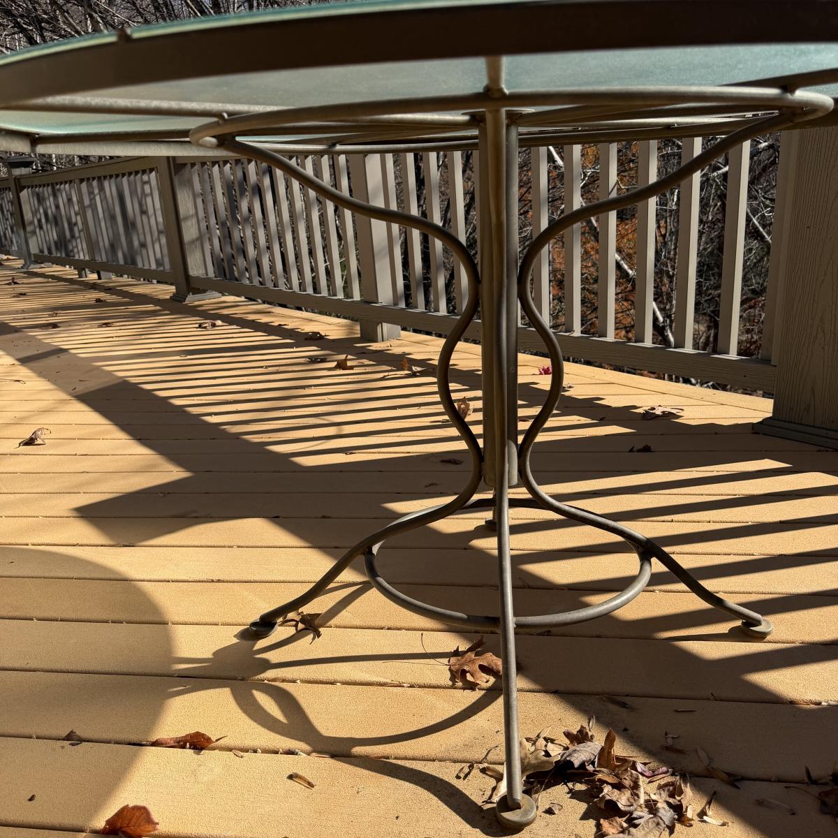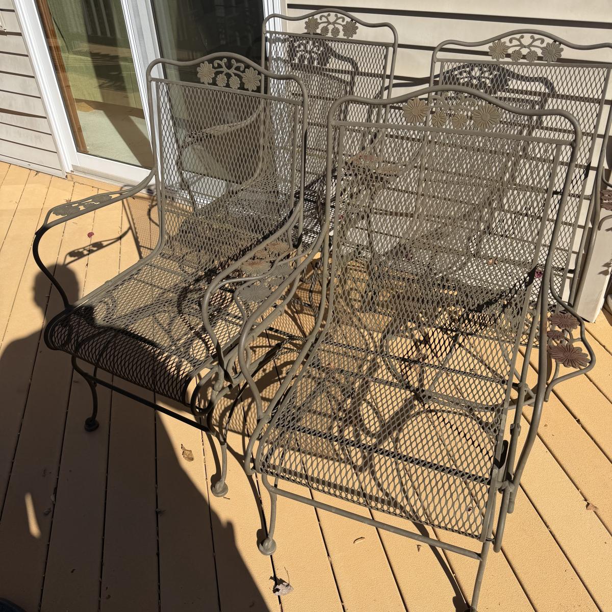Lot includes a metal table with glass top, three metal spring rockers and one metal swivel spring rocker chair. Table measures 47”D x 29”H and chairs measure 27” x 25” x 38”H with a 16” seat height.