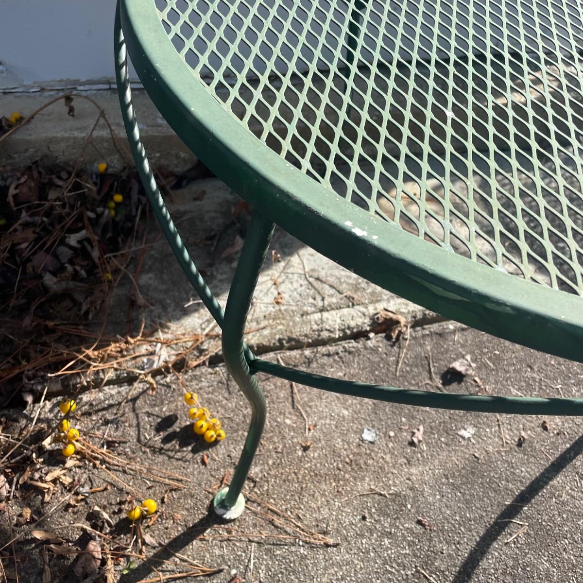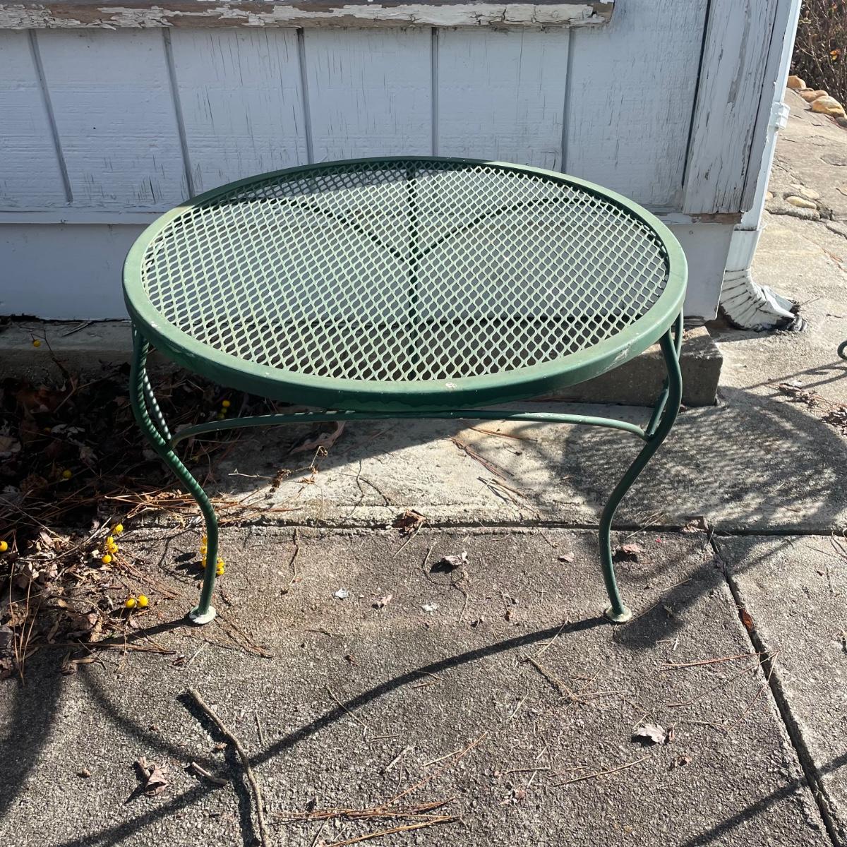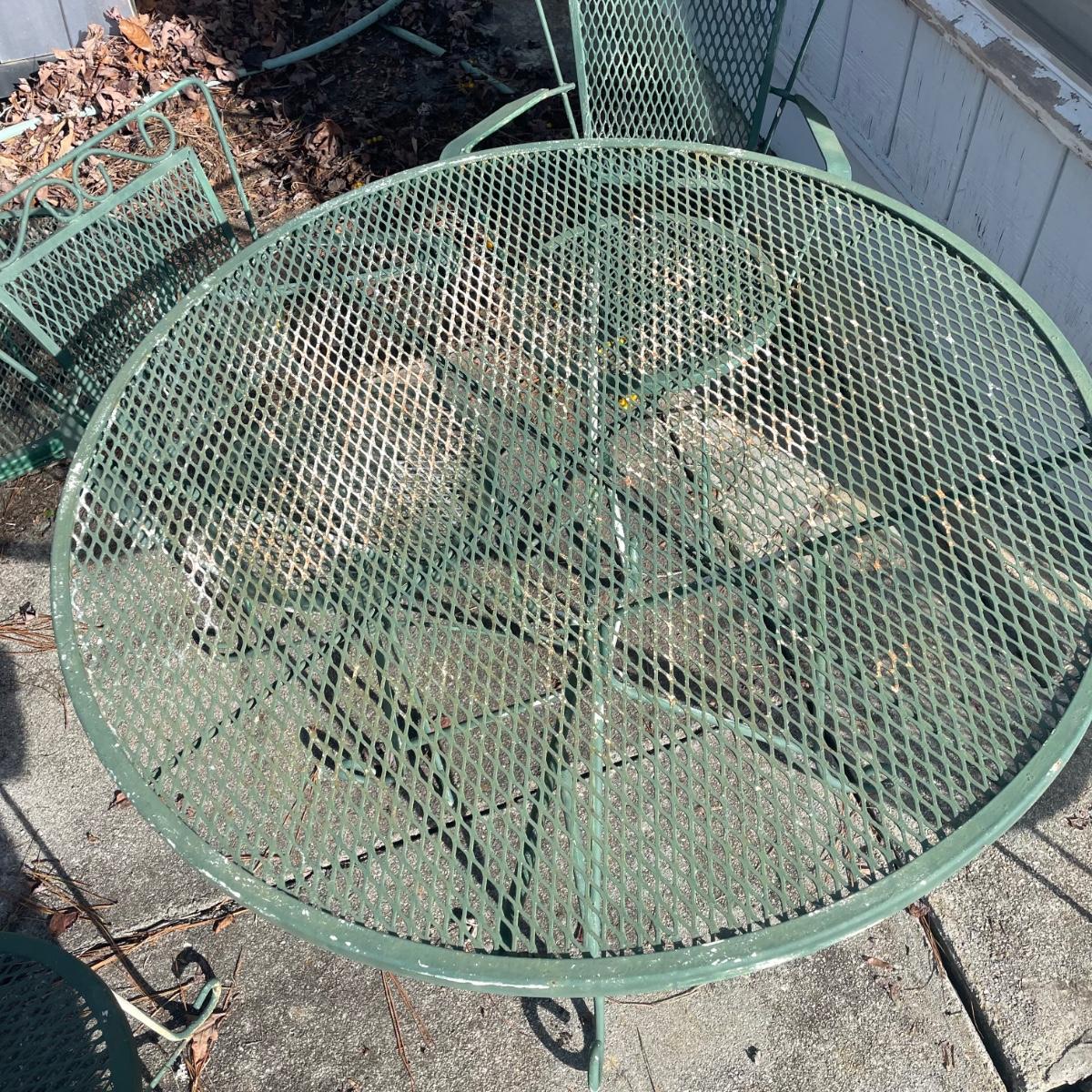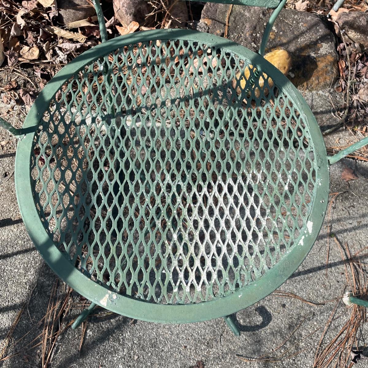 This matching set of green painted metal patio furniture includes 4 chairs, a larger table, and a second smaller side table. This sturdy set is in need of a fresh coat of paint but is in good condition otherwise.