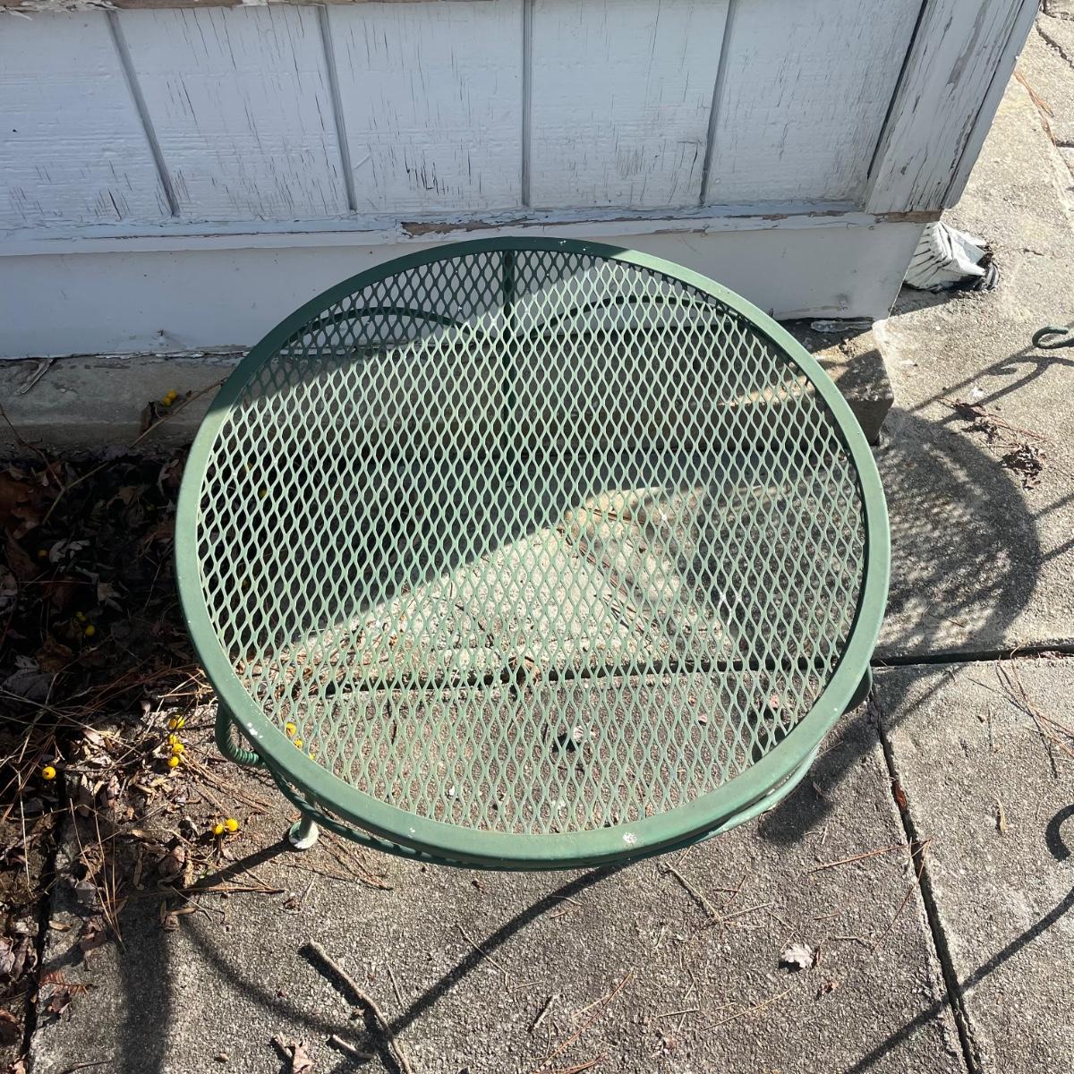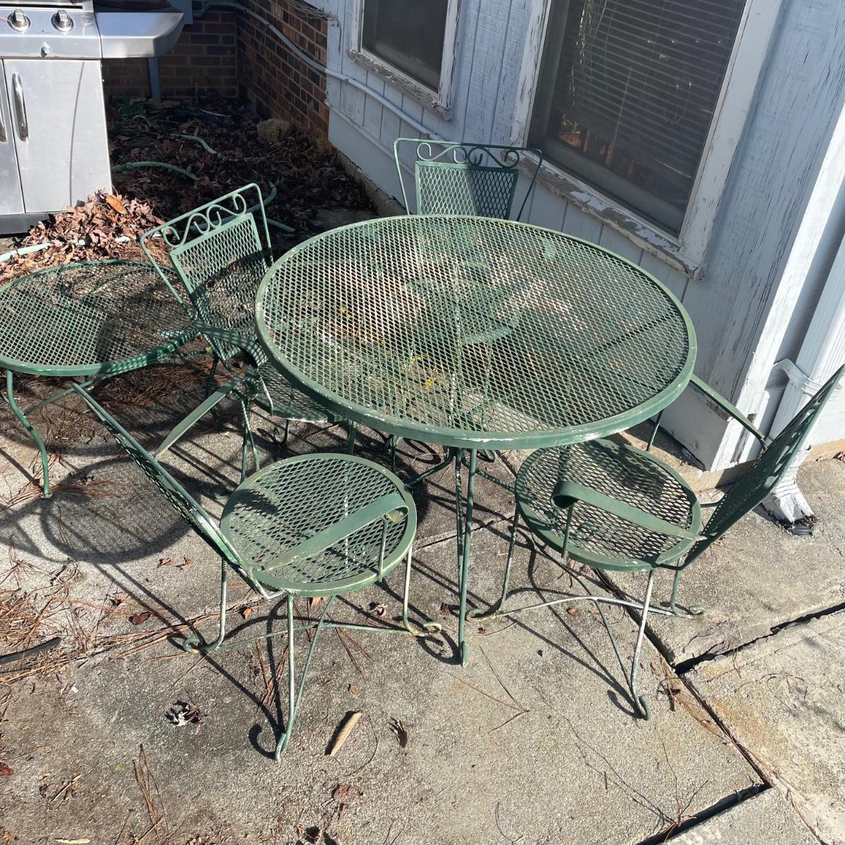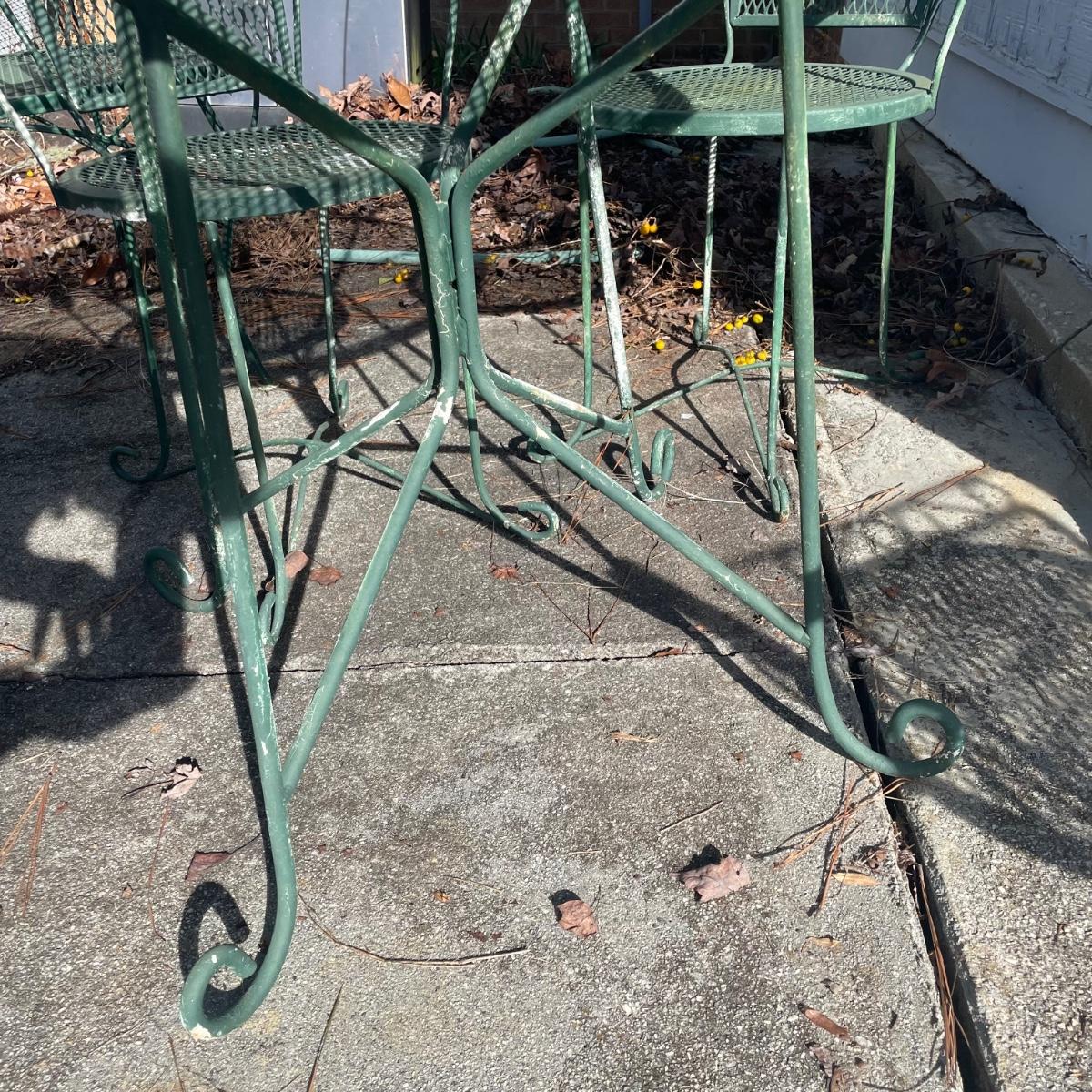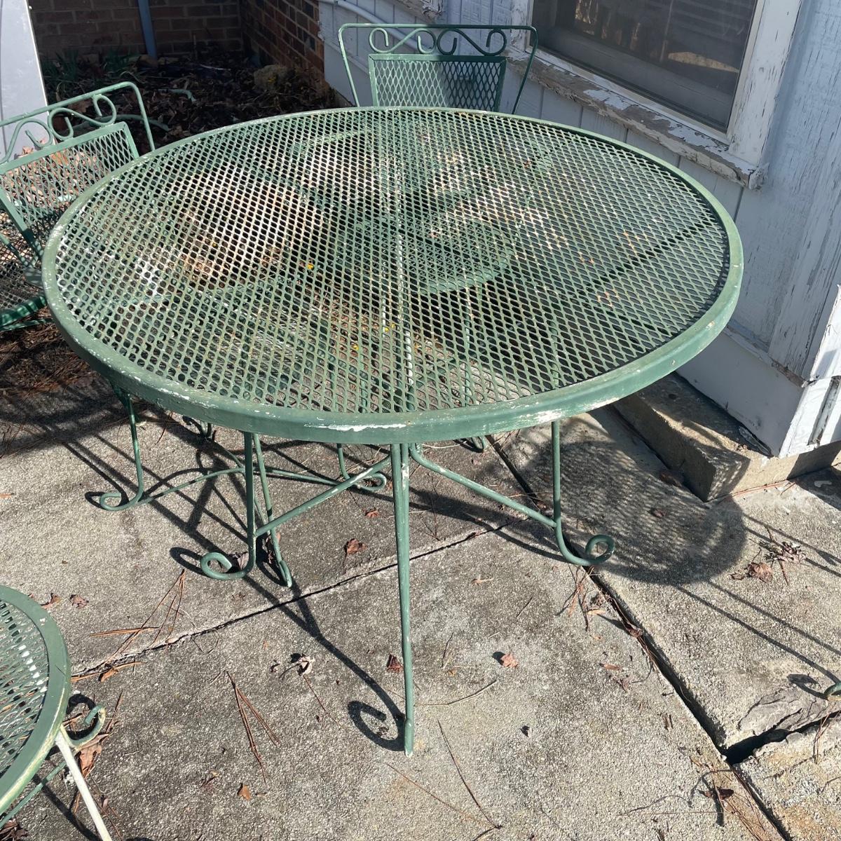This matching set of green painted metal patio furniture includes 4 chairs, a larger table, and a second smaller side table. This sturdy set is in need of a fresh coat of paint but is in good condition otherwise.