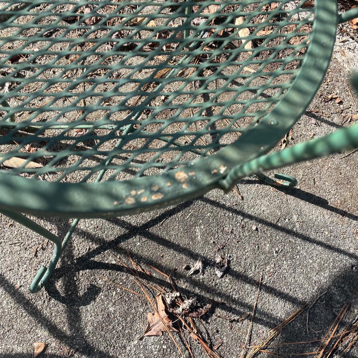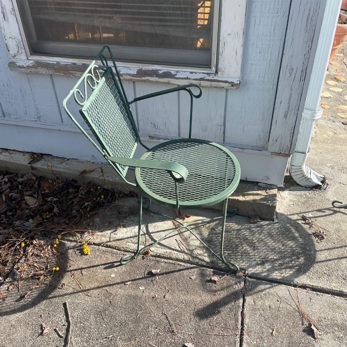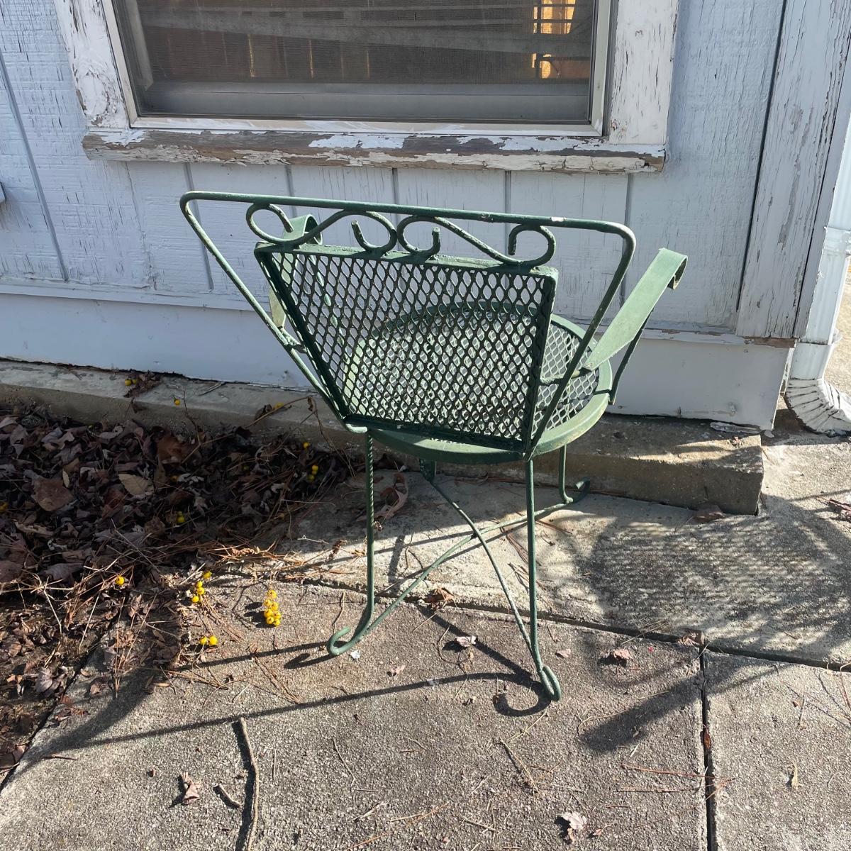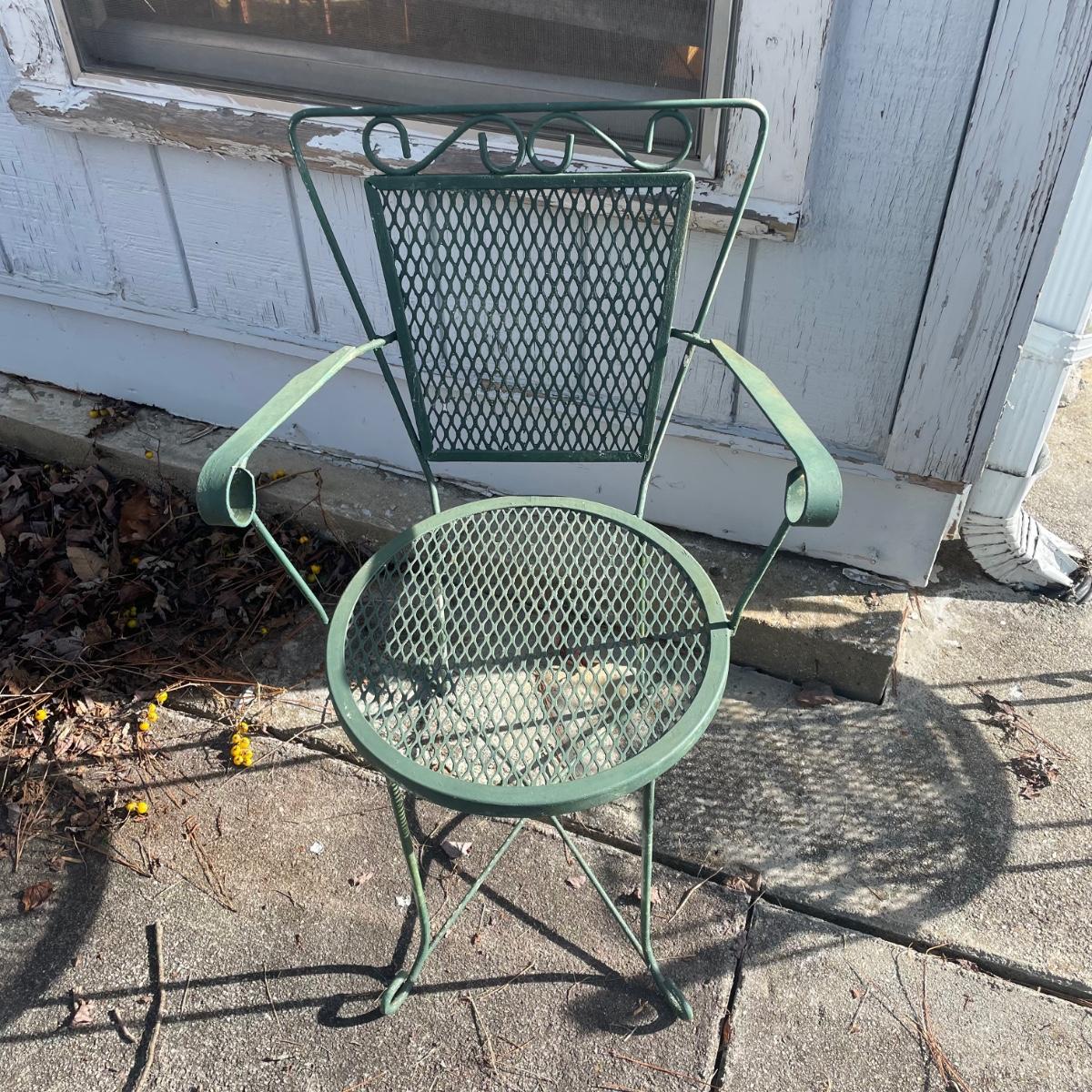 This matching set of green painted metal patio furniture includes 4 chairs, a larger table, and a second smaller side table. This sturdy set is in need of a fresh coat of paint but is in good condition otherwise.