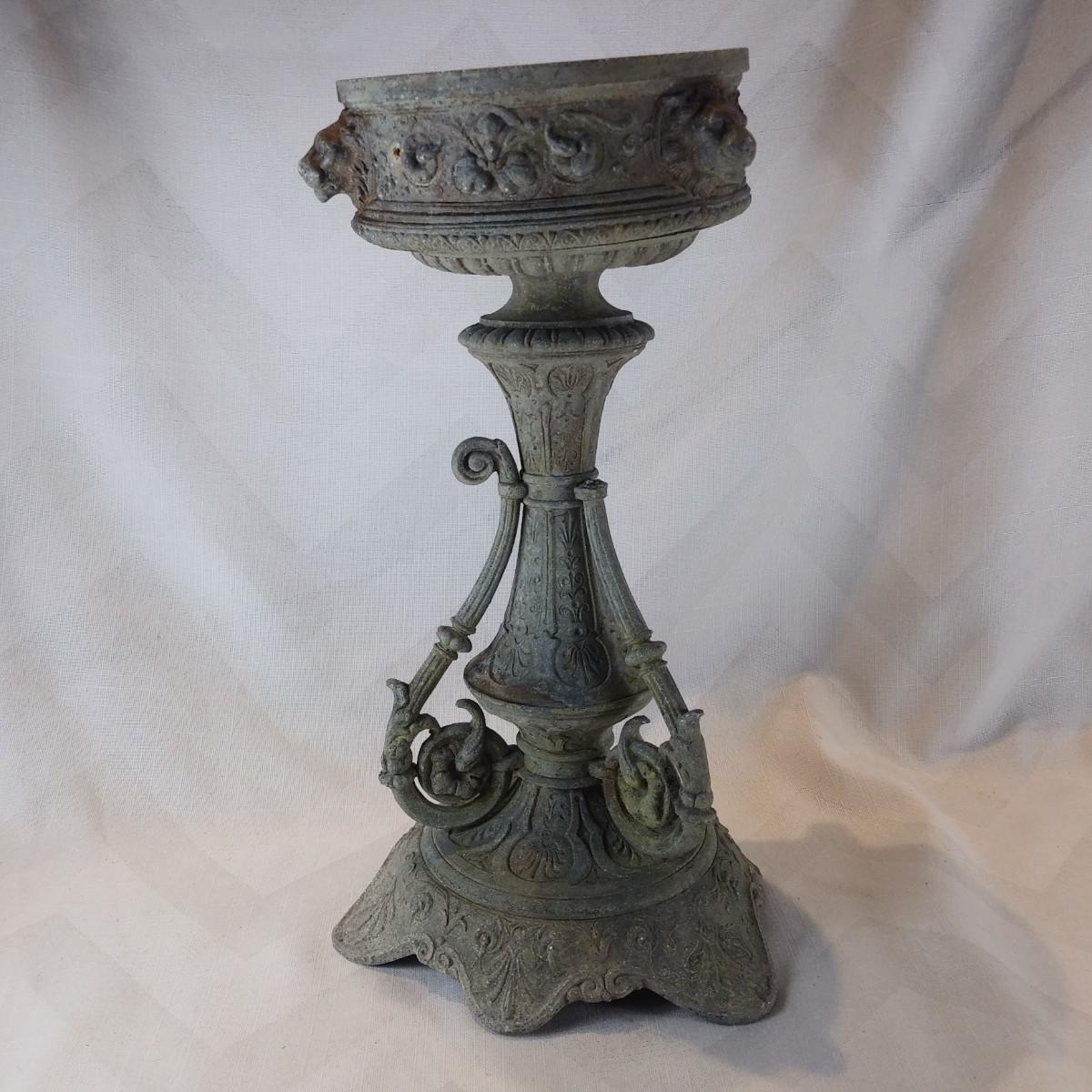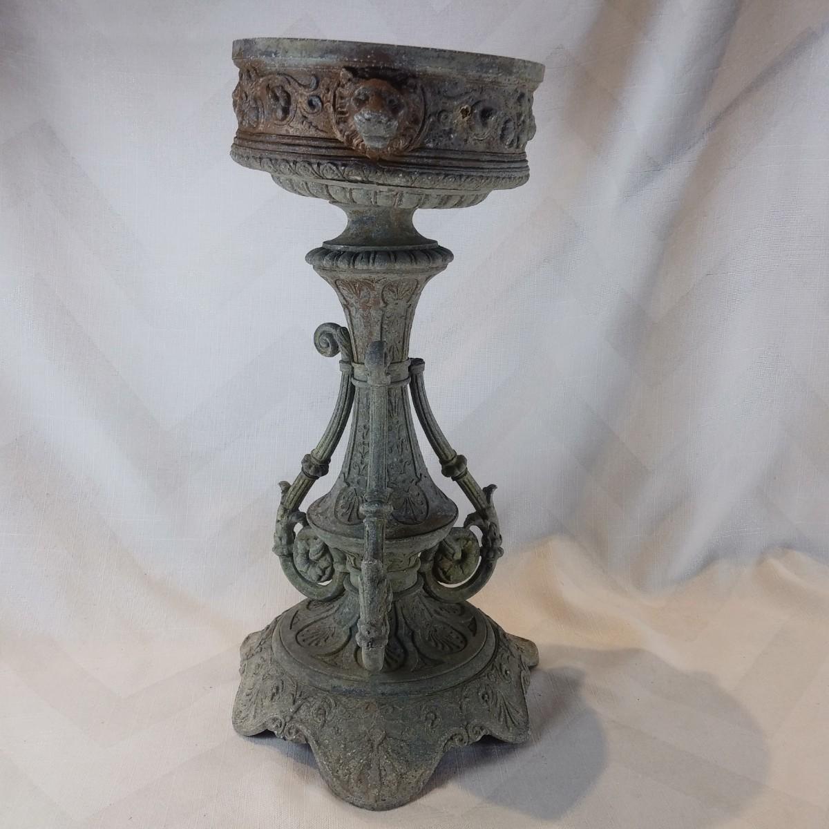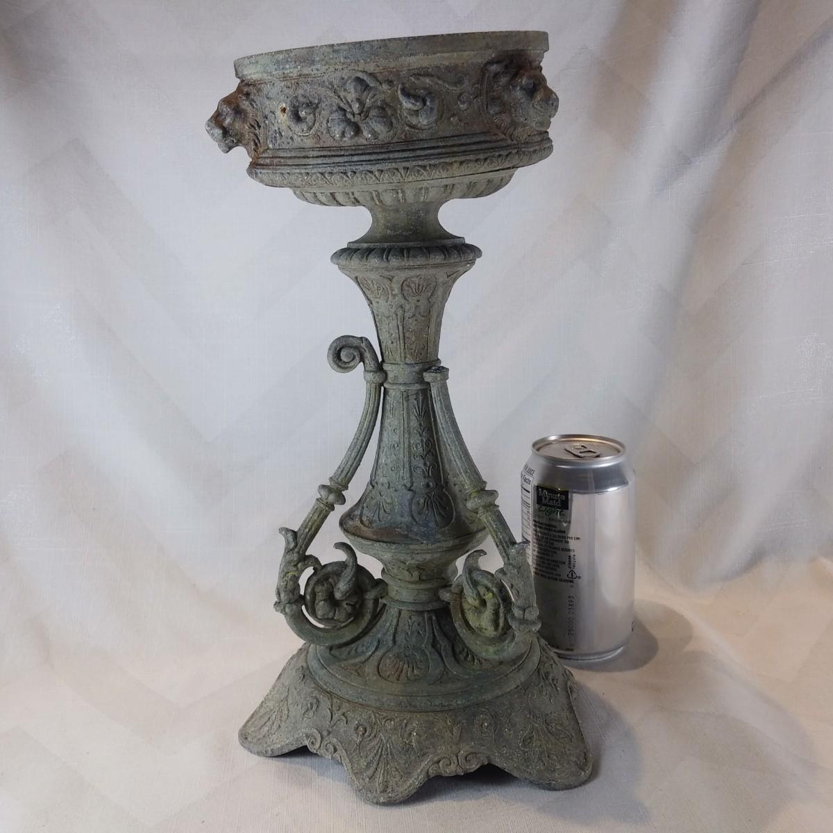 This auction lot is for a Metal Pedestal Planter. This offering is a wonderful vintage ornate pot-metal planter. It does have some damage (one of the curlicues is missing) and the planter top is crooked. Once filled with flowers most won't notice the imperfections. It stands about 13-inches tall. Great coloration.. NOTE: This piece is large and heavy so it will be very expensive to ship.