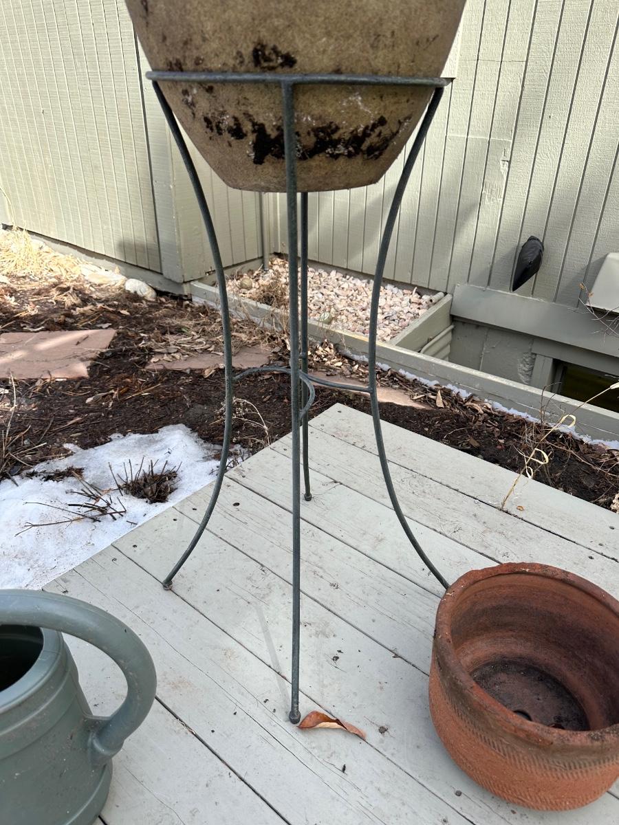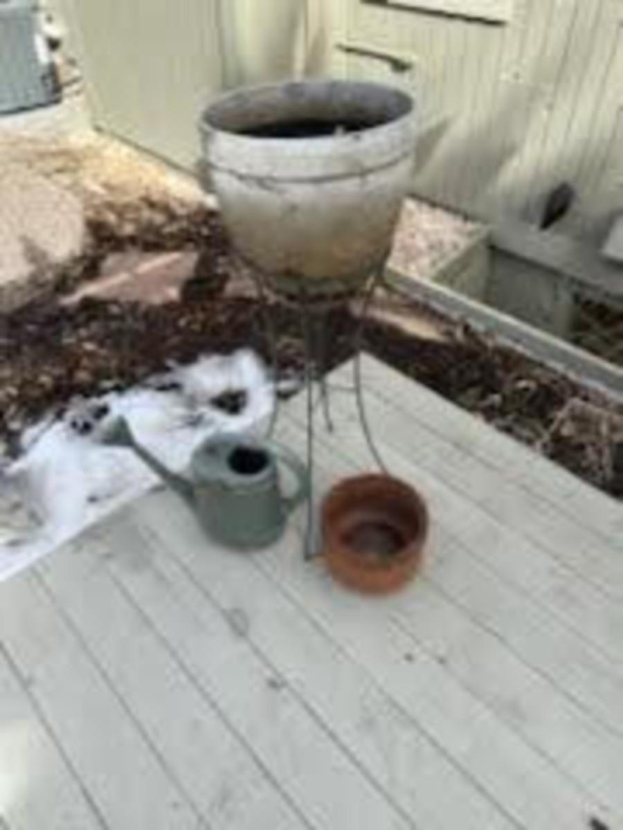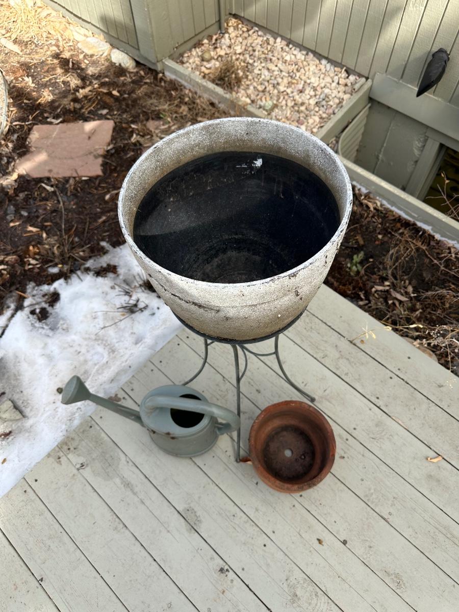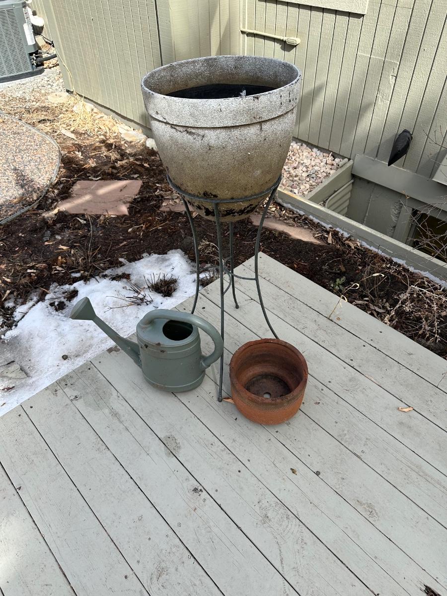METAL PLANT STAND, 2 FLOWER POTS AND A WATERING CAN