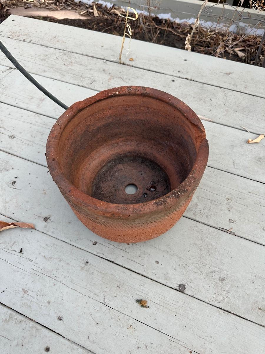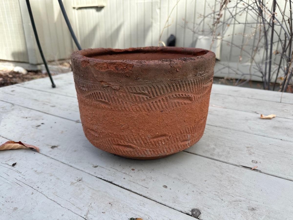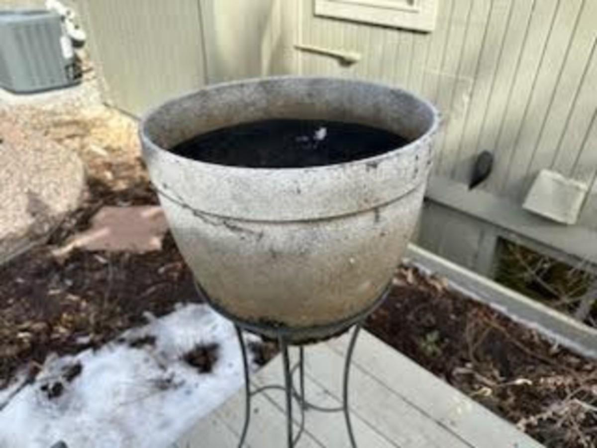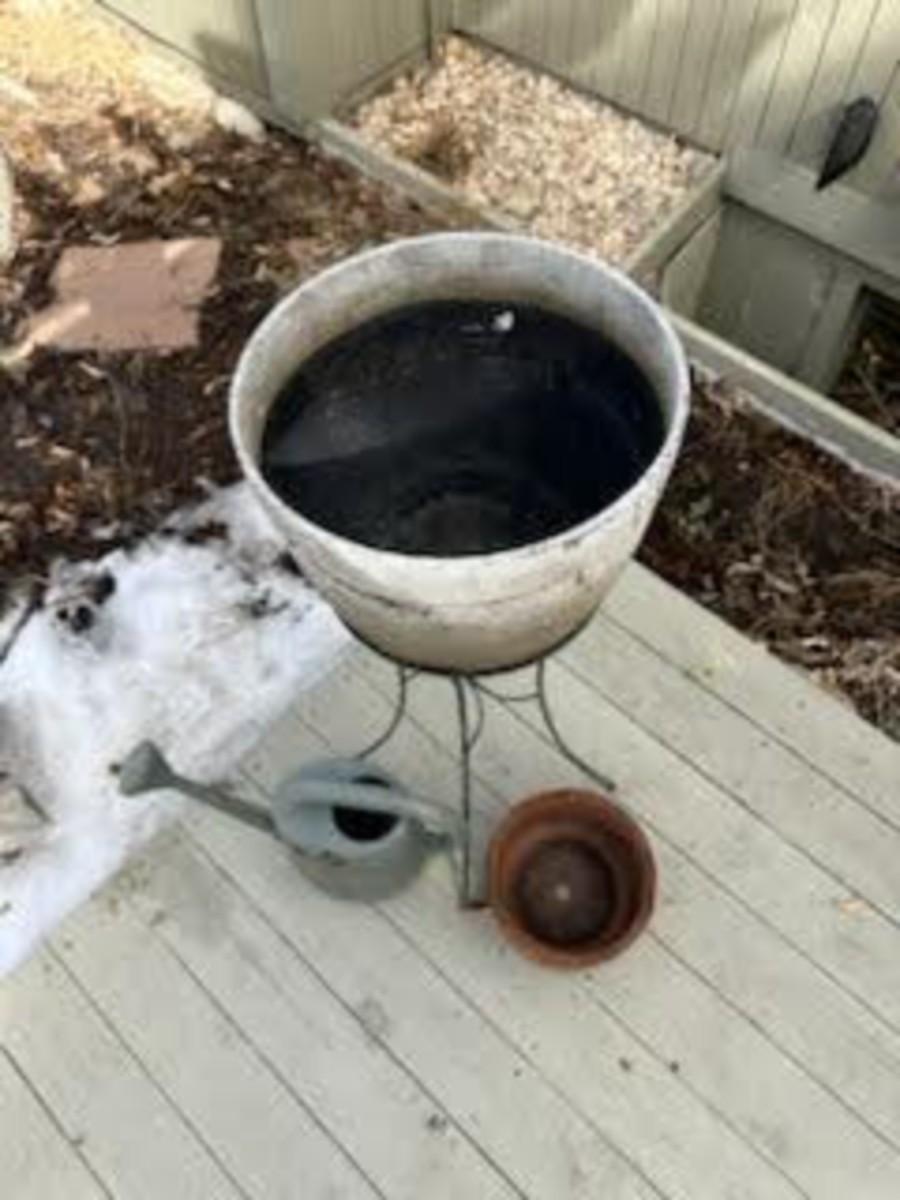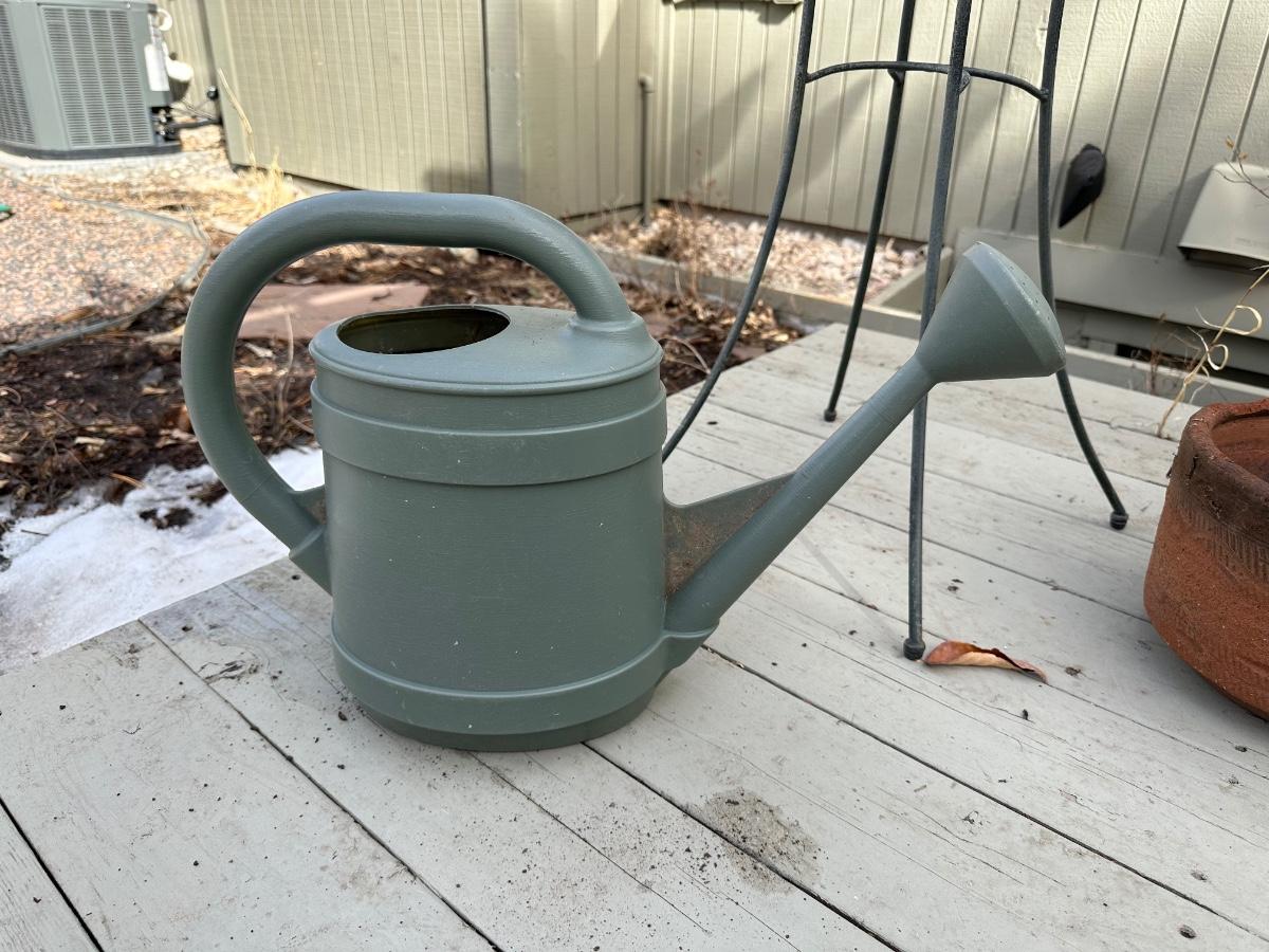 METAL PLANT STAND, 2 FLOWER POTS AND A WATERING CAN