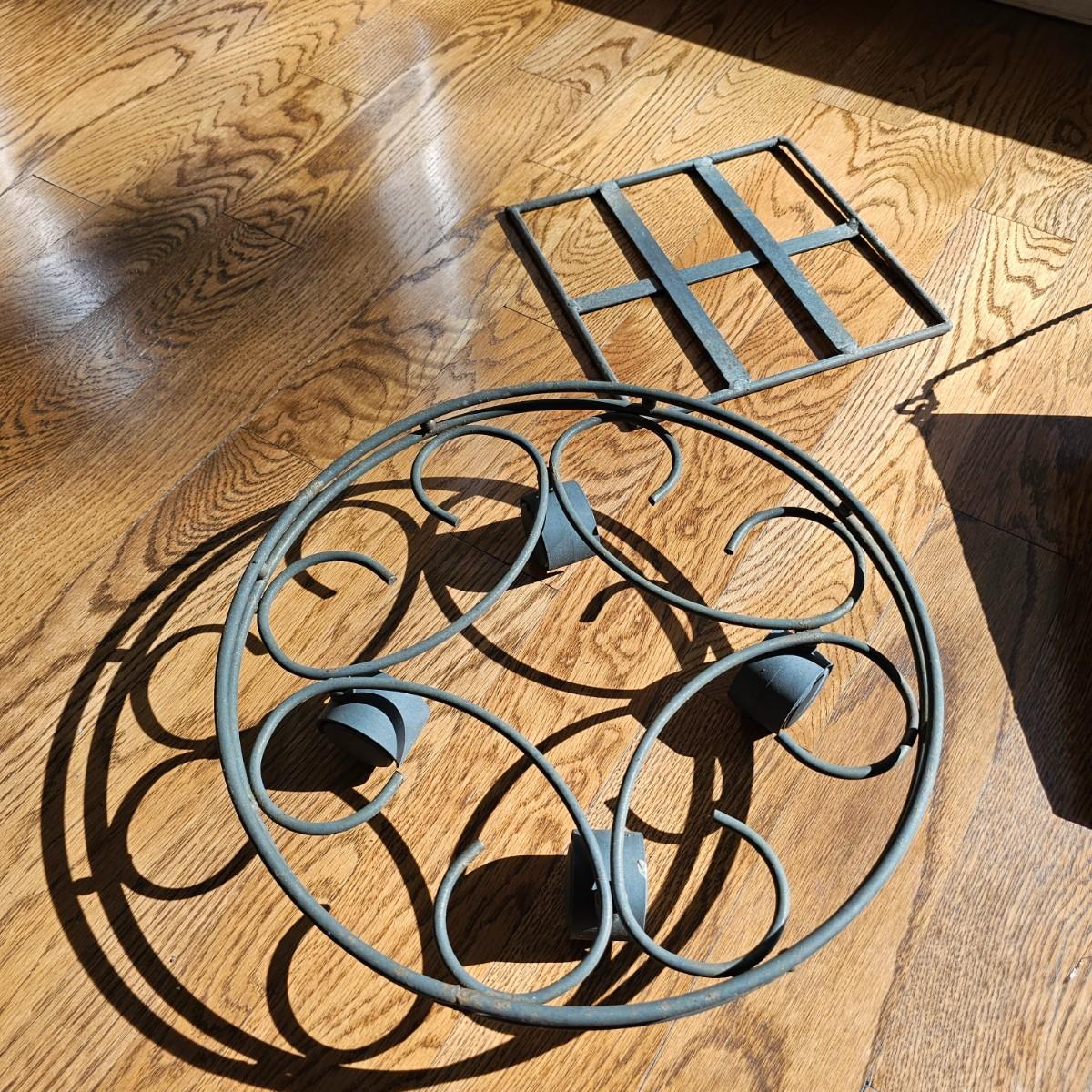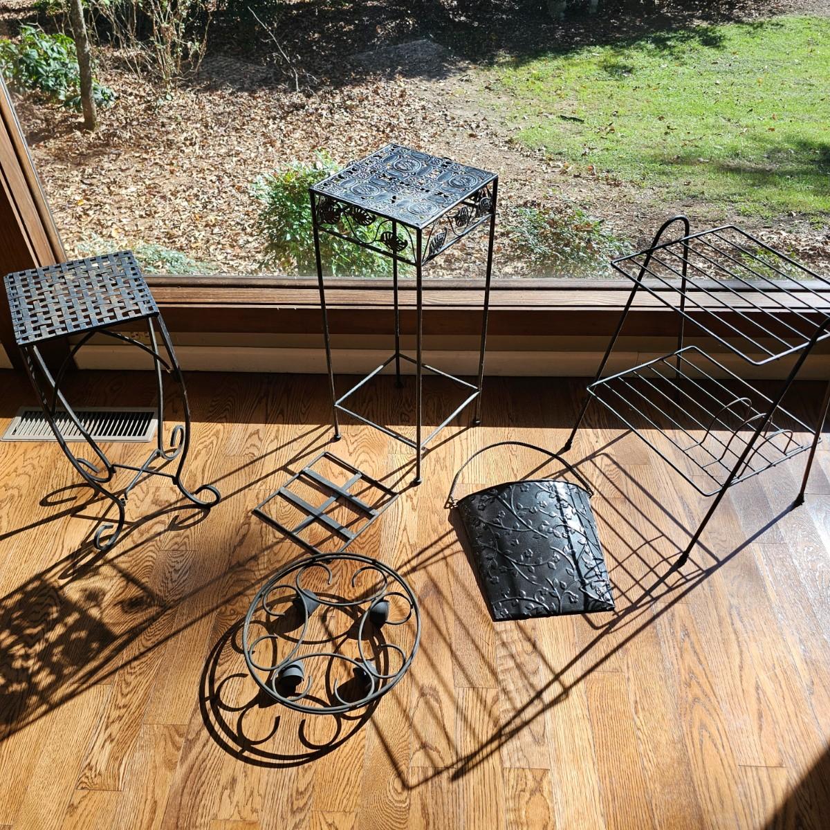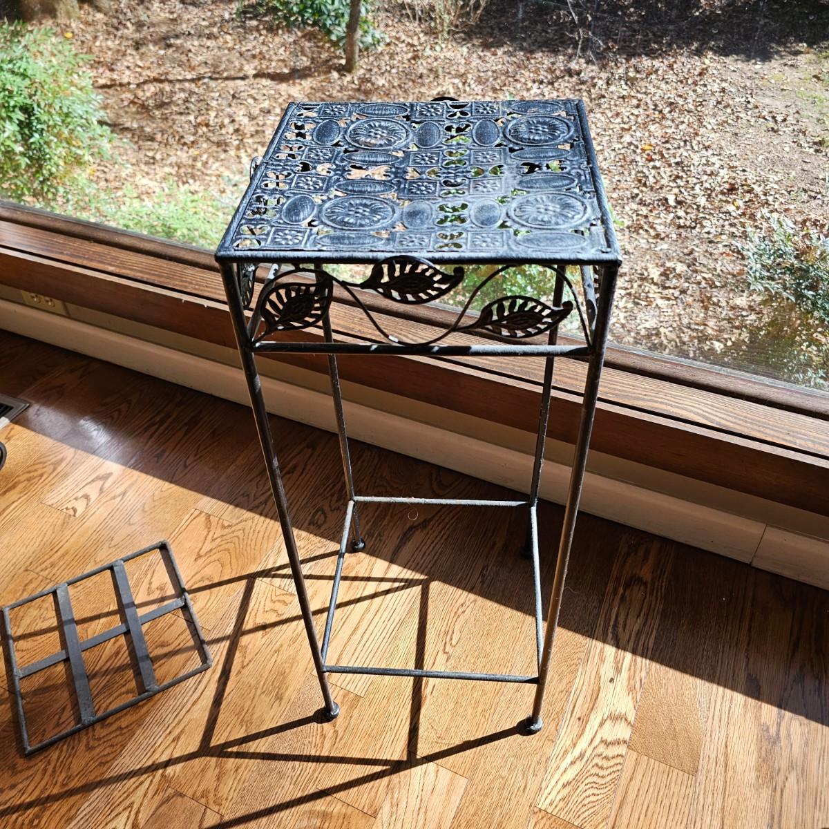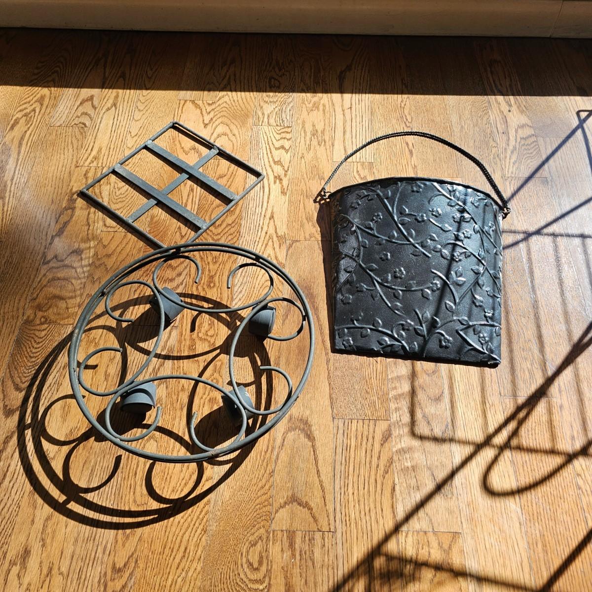 Three tall stands, a round rolling base and a handled basket for your favorite plants. Tallest item is 11" x 11" x 27.5"H, rolling base is 13.5"D. Some items are wrought iron, others are lighter metal. See photos for details.