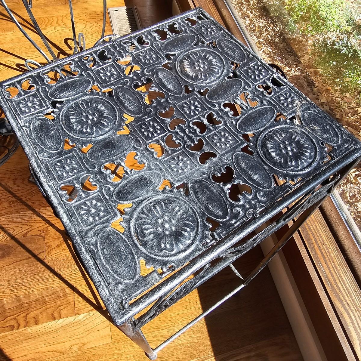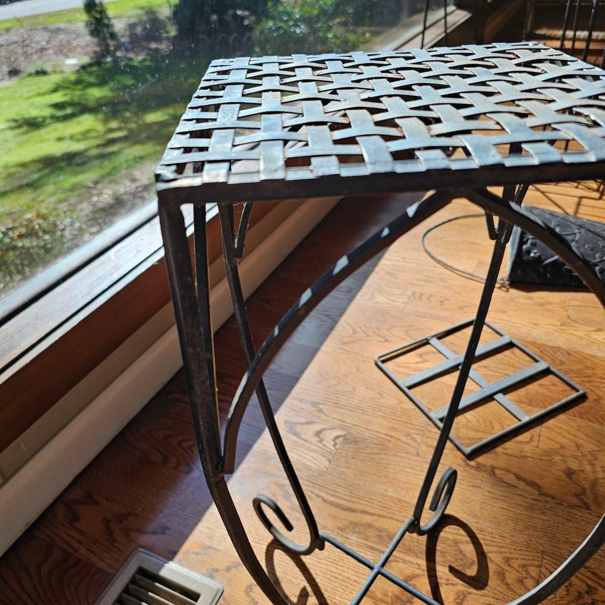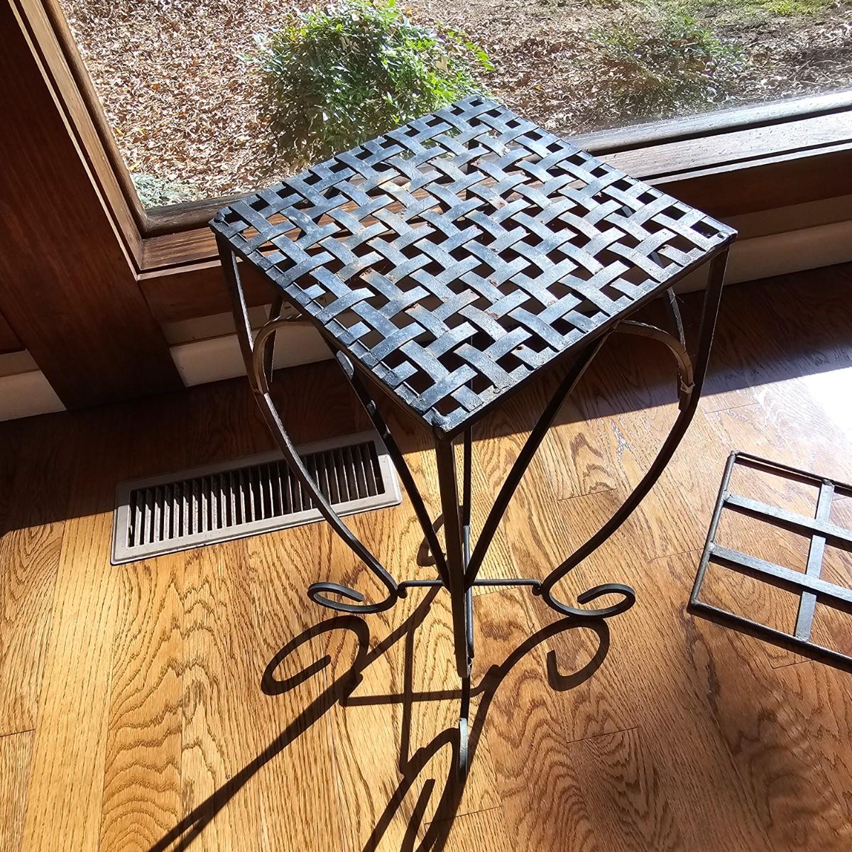 Three tall stands, a round rolling base and a handled basket for your favorite plants. Tallest item is 11" x 11" x 27.5"H, rolling base is 13.5"D. Some items are wrought iron, others are lighter metal. See photos for details.
