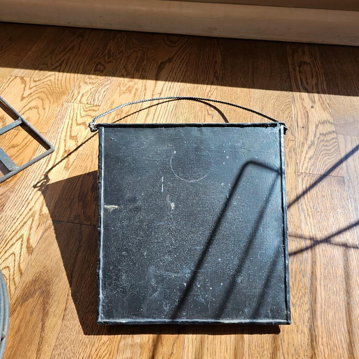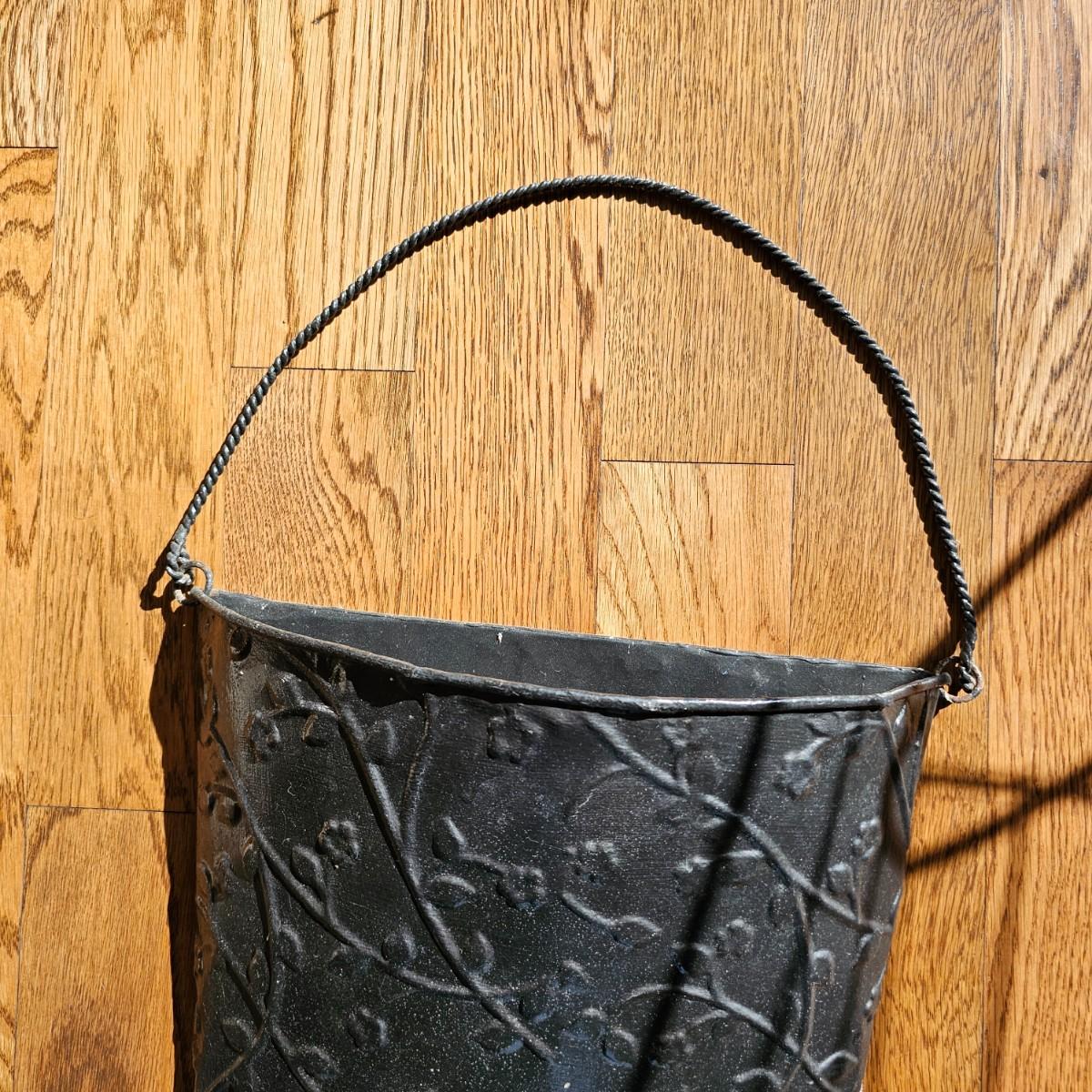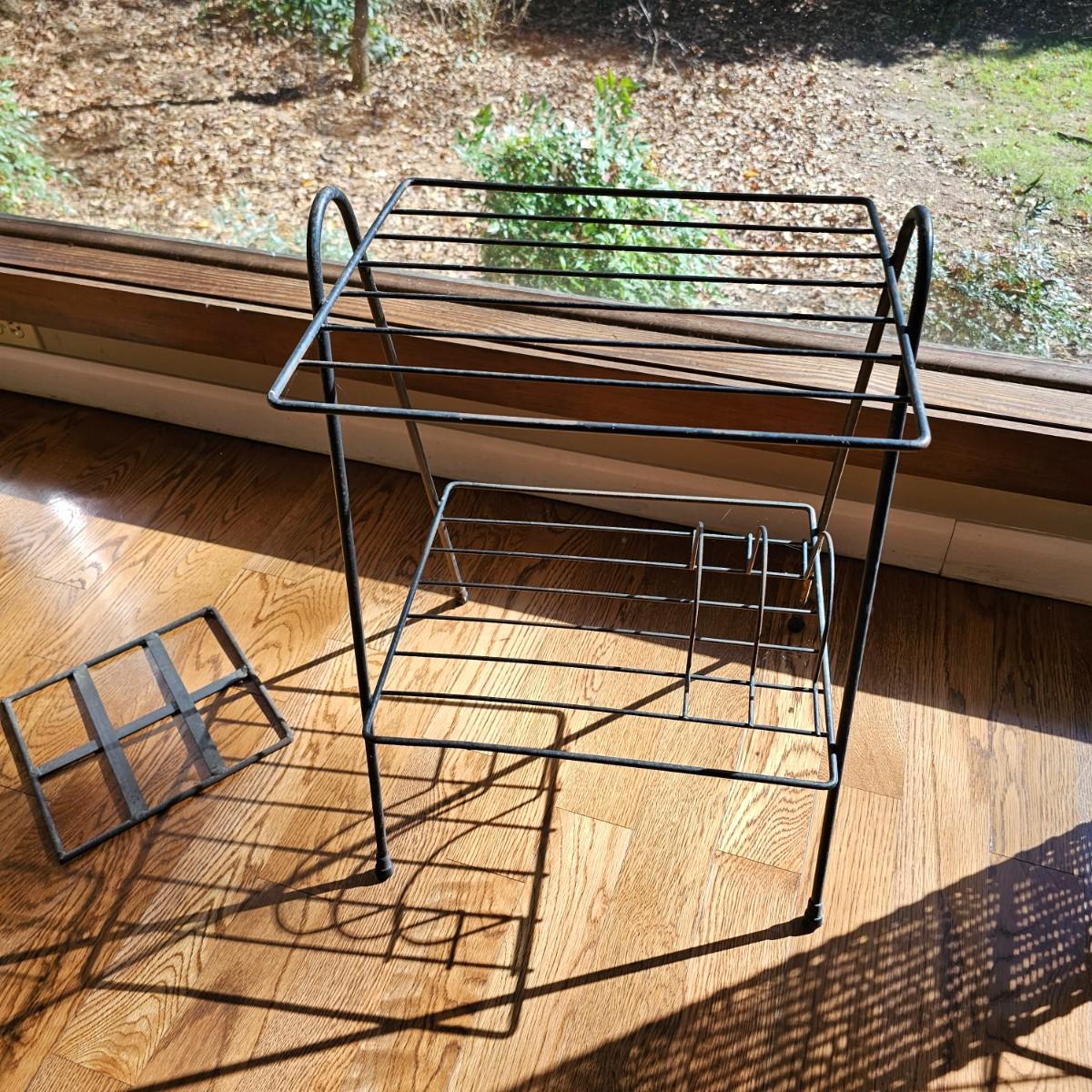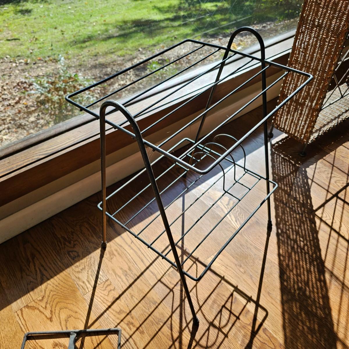 Three tall stands, a round rolling base and a handled basket for your favorite plants. Tallest item is 11" x 11" x 27.5"H, rolling base is 13.5"D. Some items are wrought iron, others are lighter metal. See photos for details.