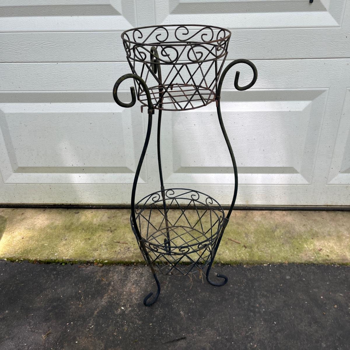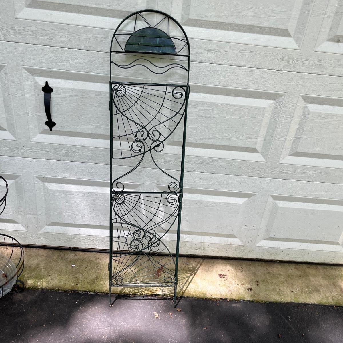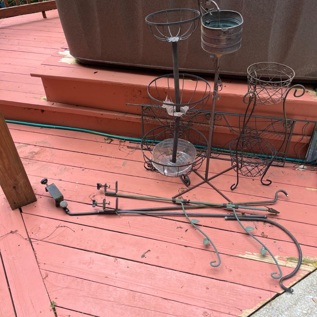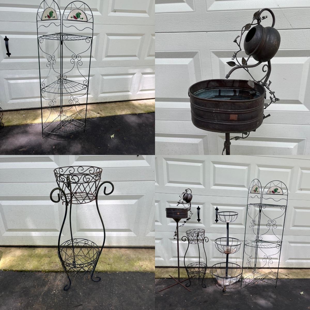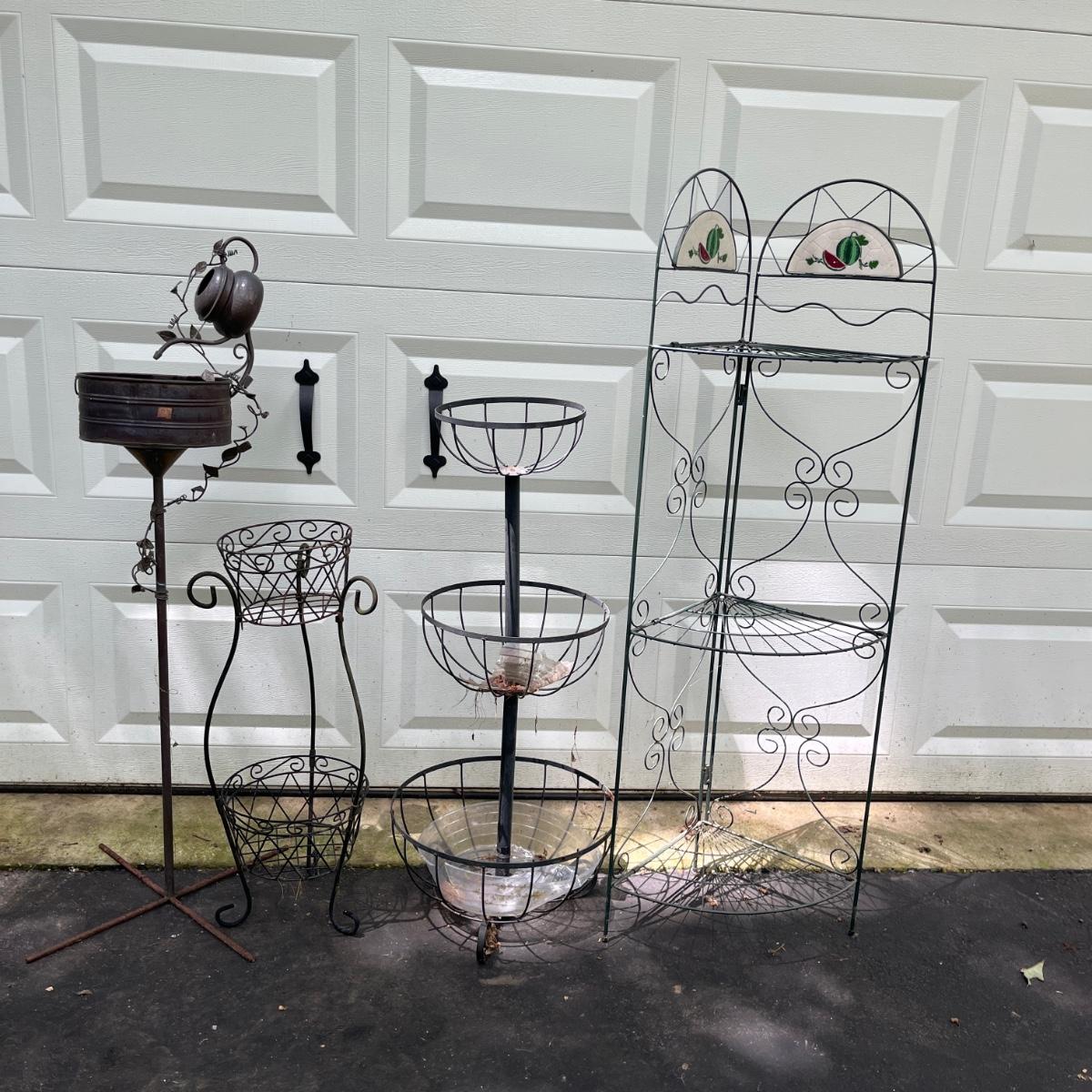 Lot includes watermelon motif metal corner folding stand, single plant stand, metal planter with pitcher and tiered metal stand. Watermelon motif stand measures 18” x 13” x 52”H. Also includes three deck mount plant hangers with the longest one measuring 40”long.