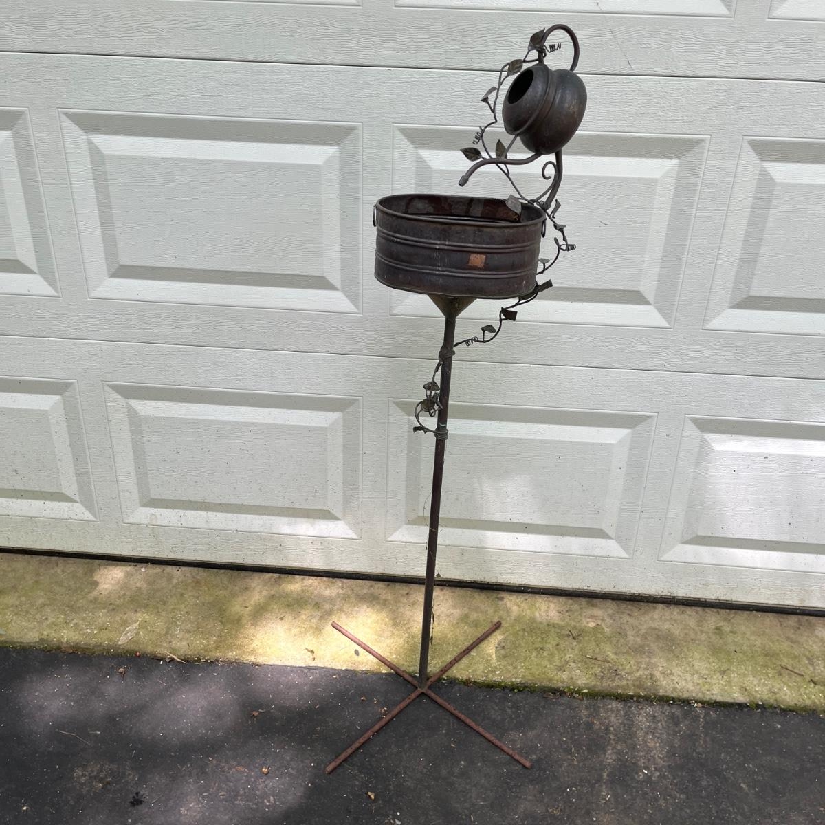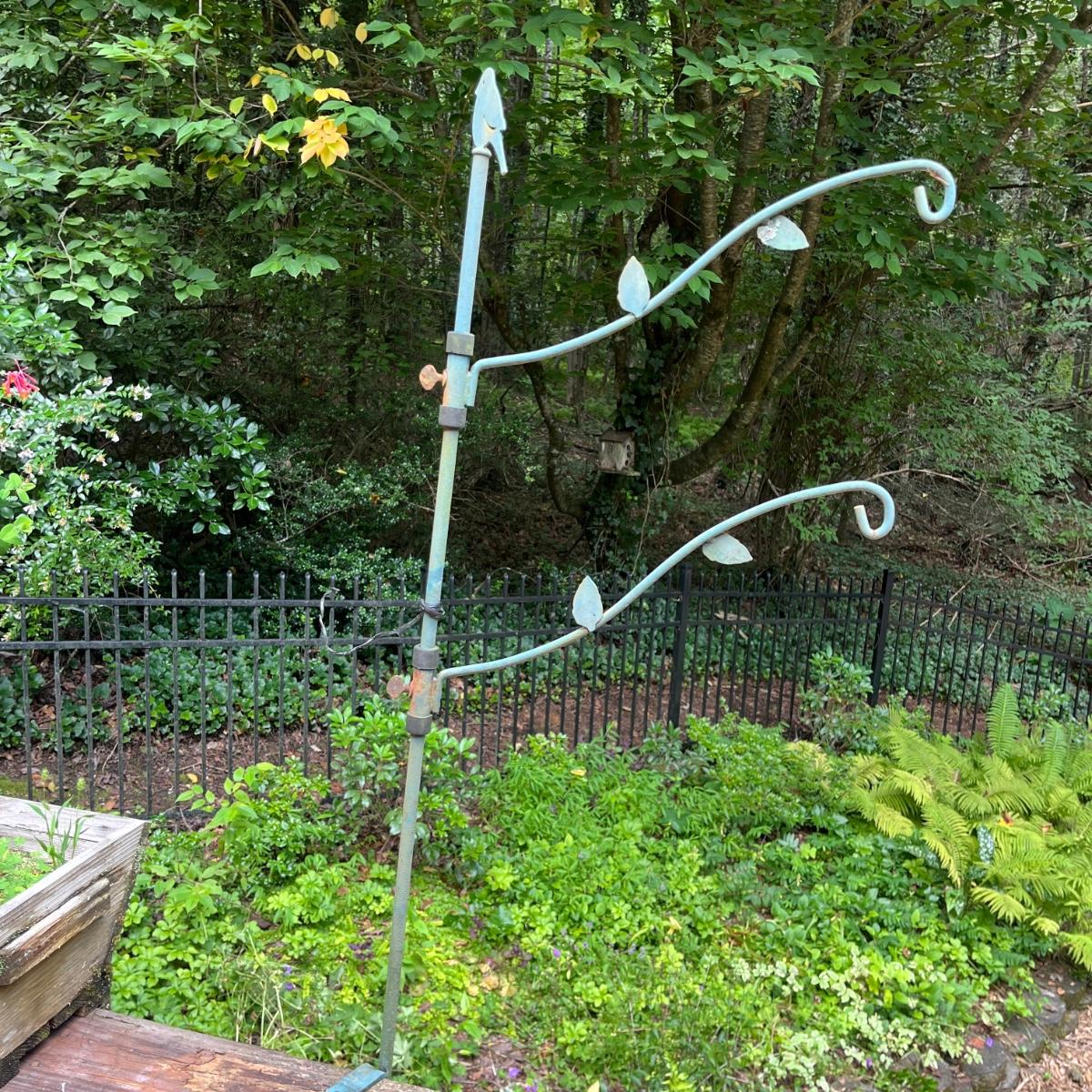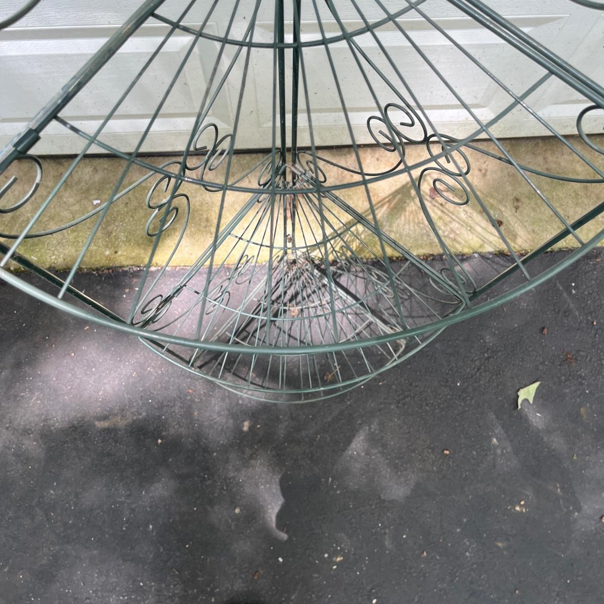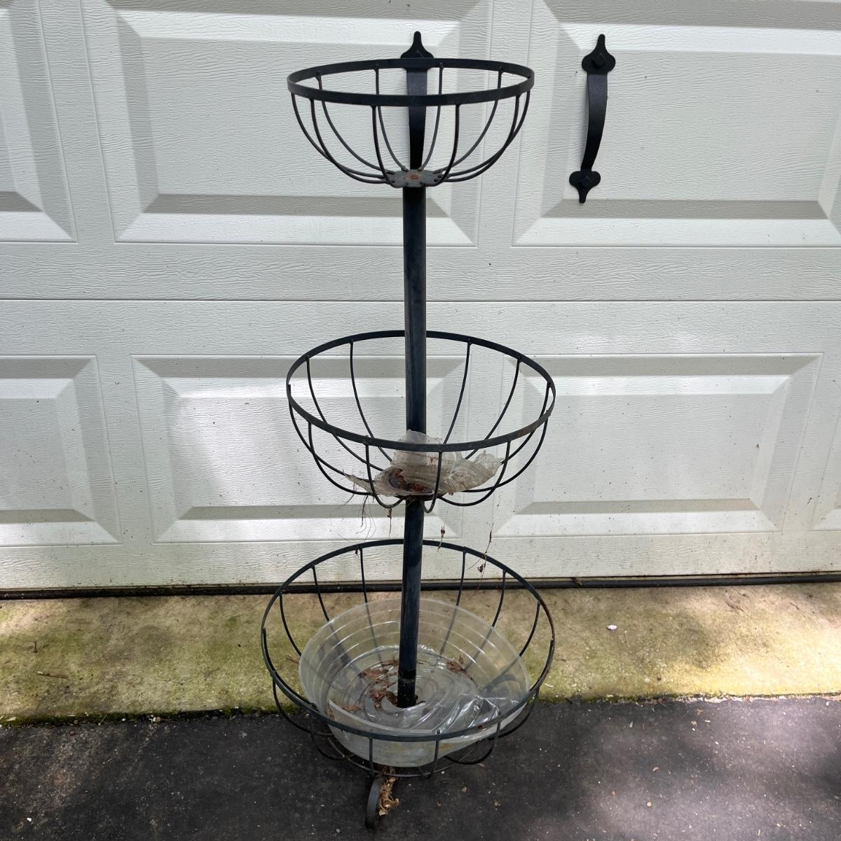 Lot includes watermelon motif metal corner folding stand, single plant stand, metal planter with pitcher and tiered metal stand. Watermelon motif stand measures 18” x 13” x 52”H. Also includes three deck mount plant hangers with the longest one measuring 40”long.