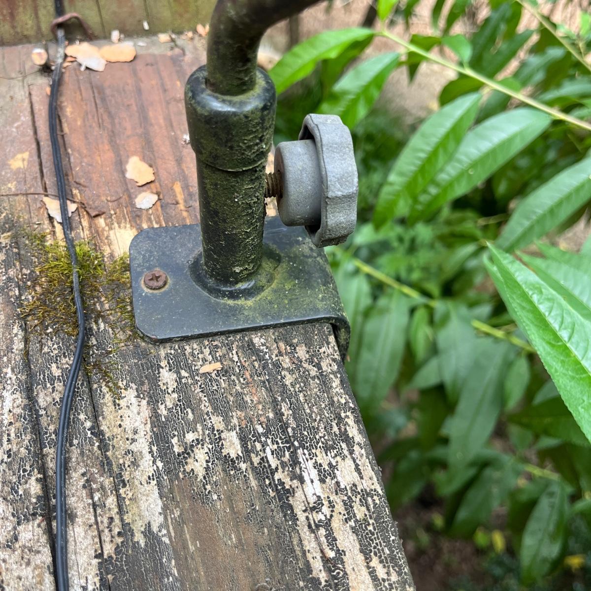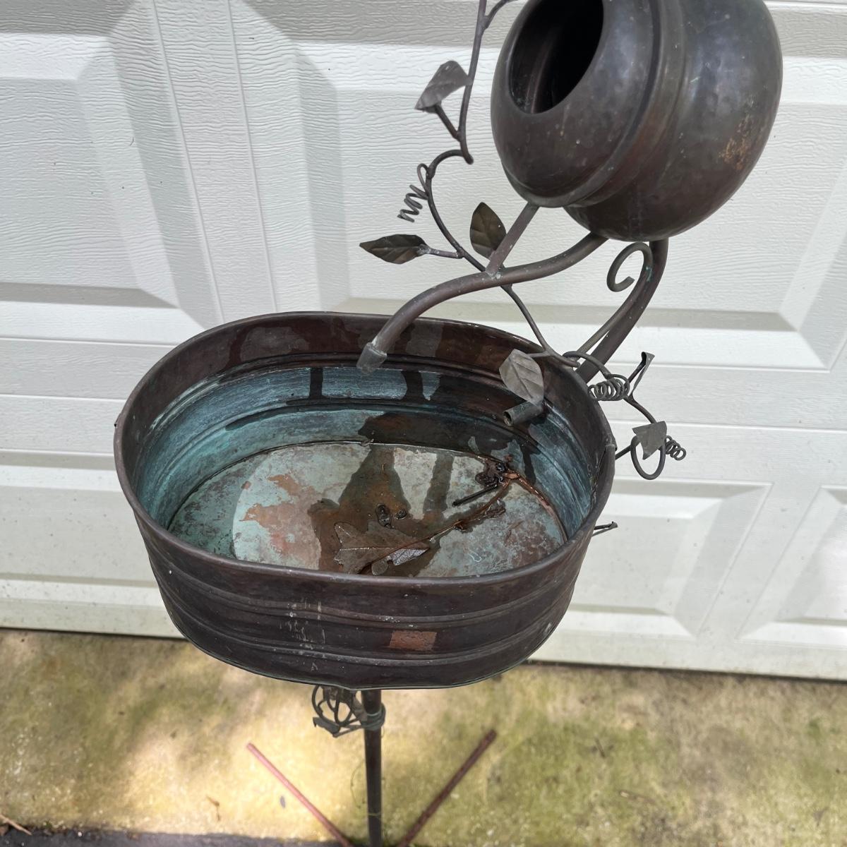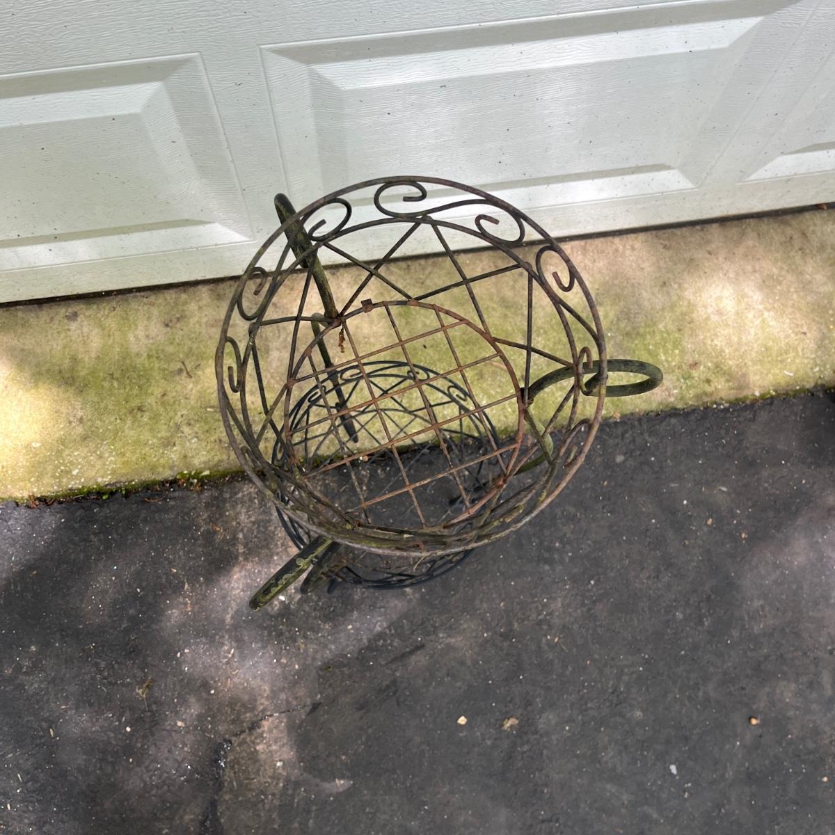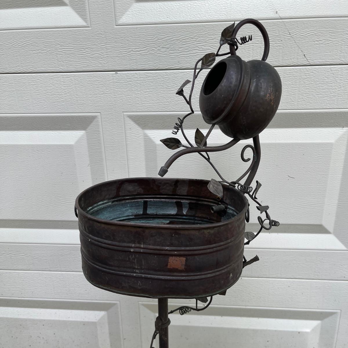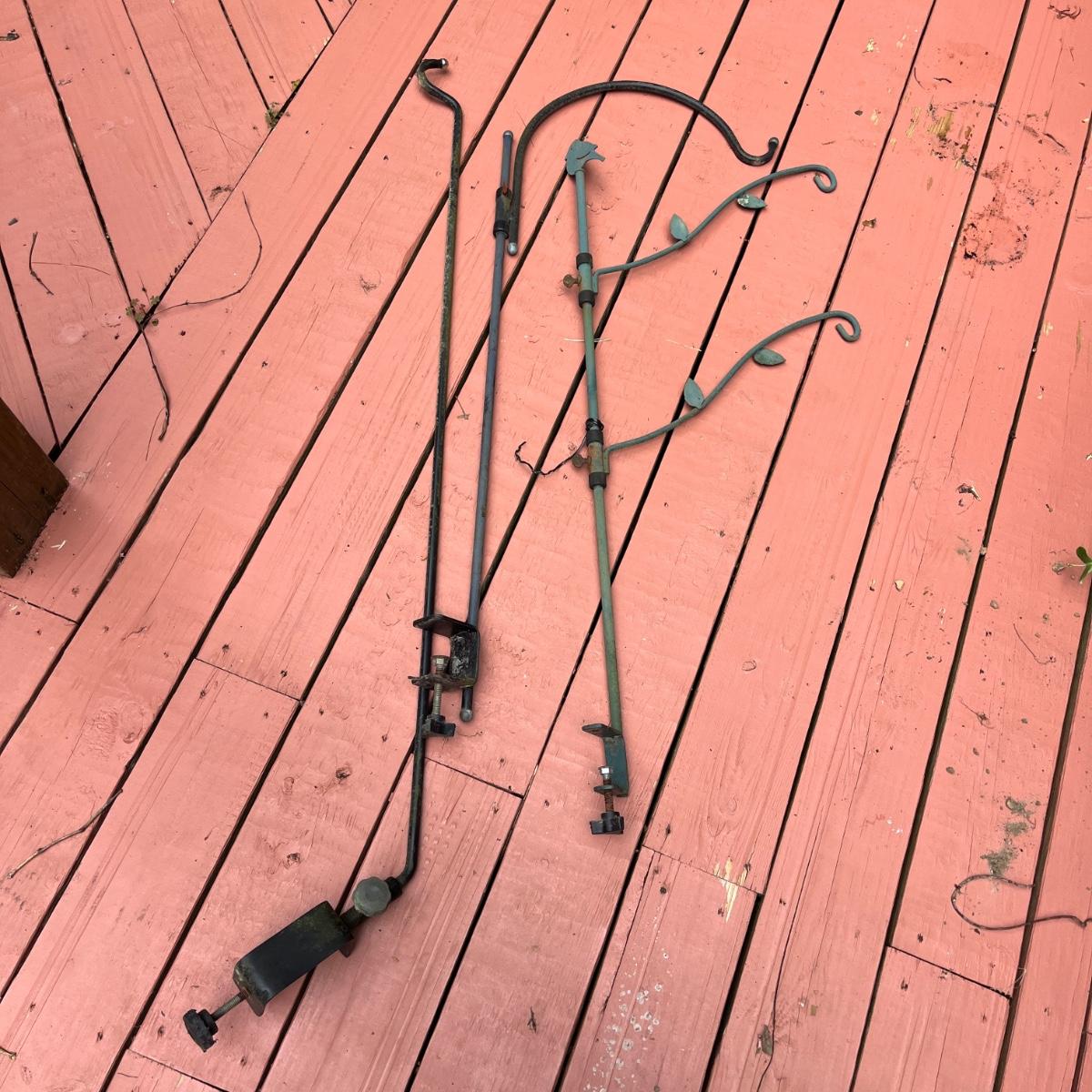 Lot includes watermelon motif metal corner folding stand, single plant stand, metal planter with pitcher and tiered metal stand. Watermelon motif stand measures 18” x 13” x 52”H. Also includes three deck mount plant hangers with the longest one measuring 40”long.