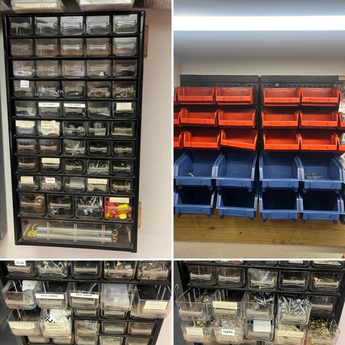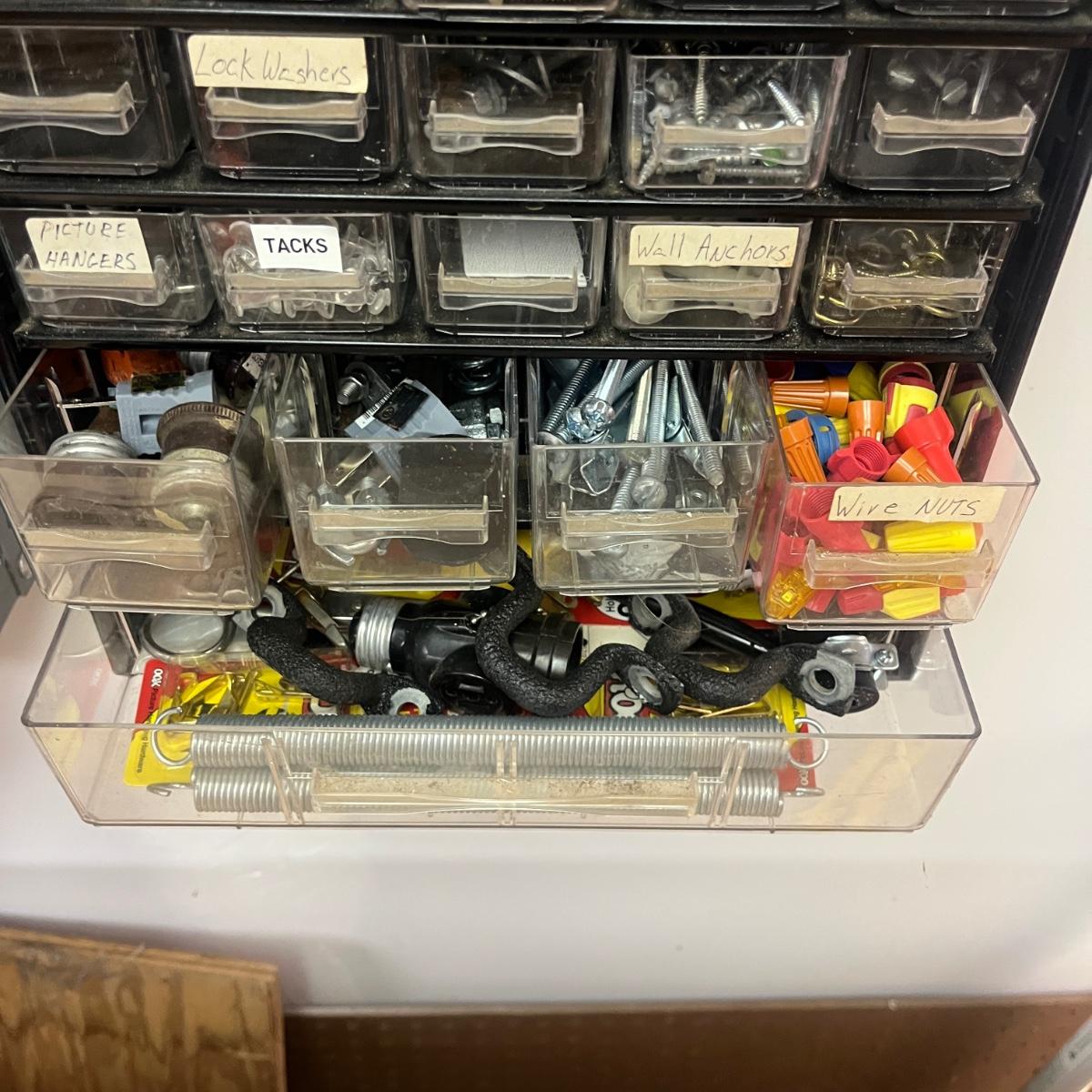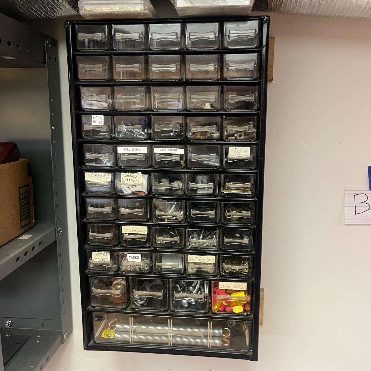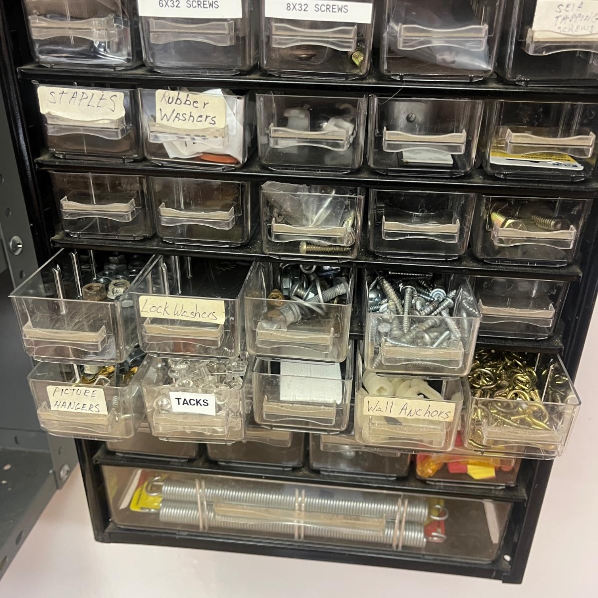 Lot contains a metal parts bin with plastic drawers and the contents that includes springs, anchors, screws, tacks, washers, picture hangers and more. Also includes a plastic parts bin with contents. Both items will need to be removed from wall by winning bidder with Phillips screwdriver. Metal and plastic bin measure 12” x 6” x 22”H and plastic bin measures 24” x 7” x 15”H.
