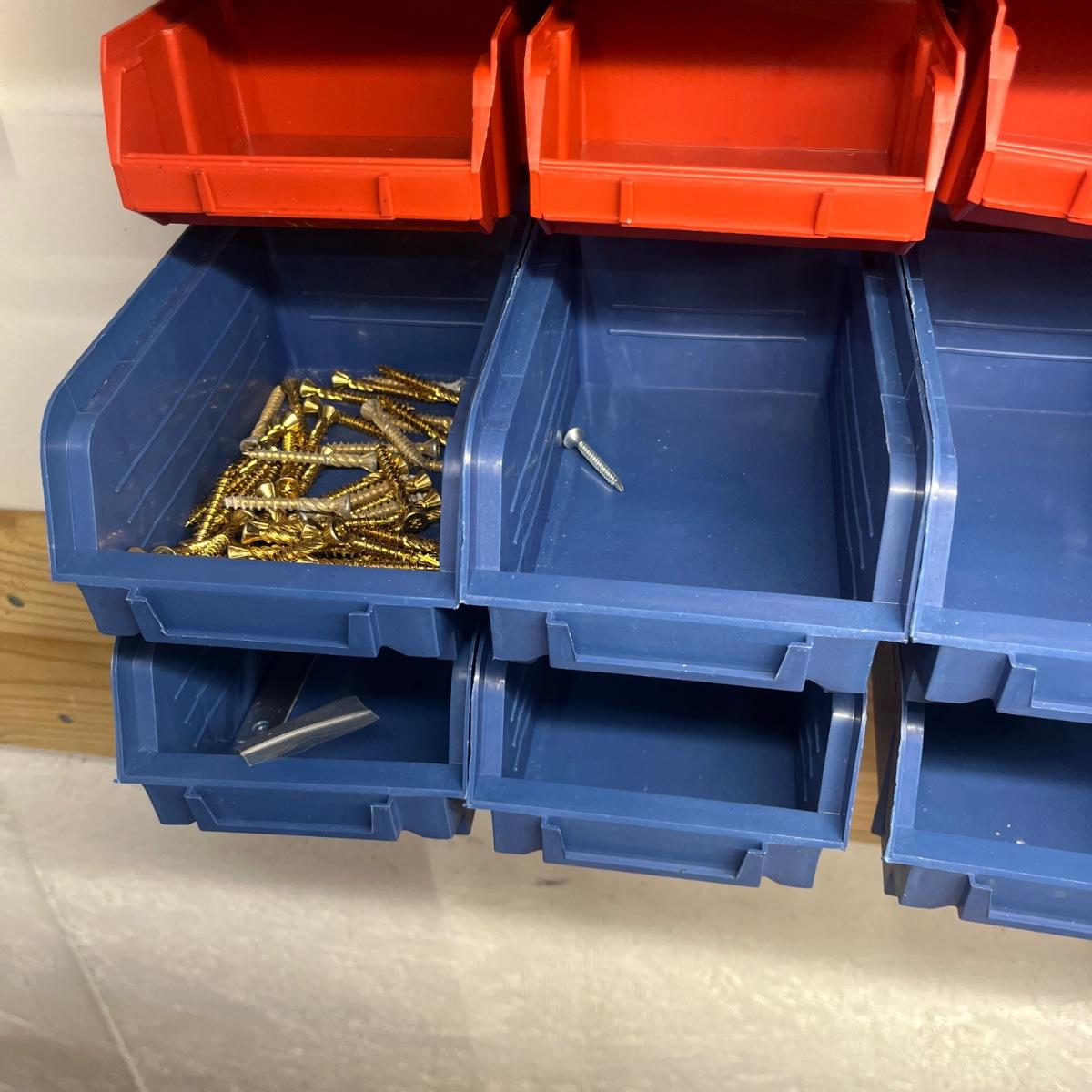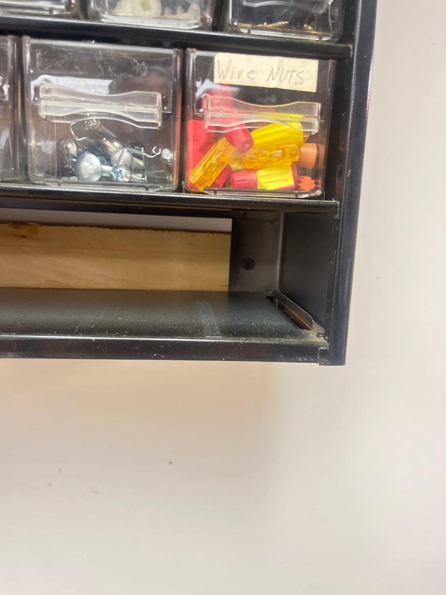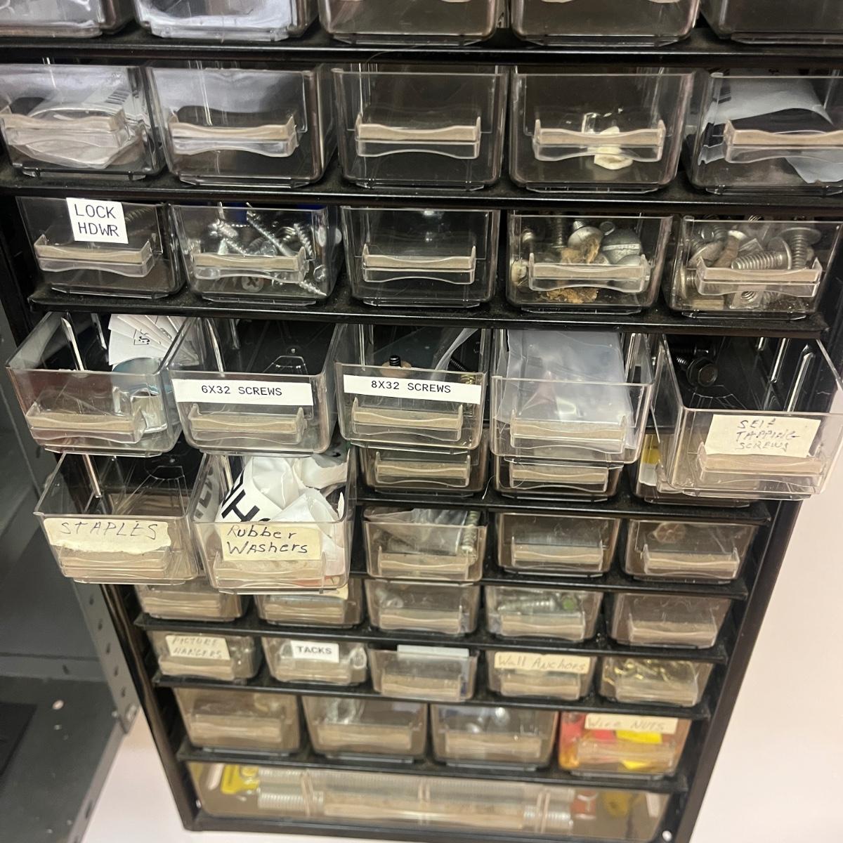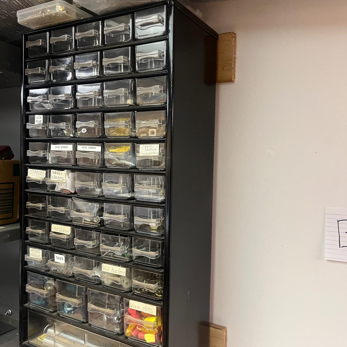 Lot contains a metal parts bin with plastic drawers and the contents that includes springs, anchors, screws, tacks, washers, picture hangers and more. Also includes a plastic parts bin with contents. Both items will need to be removed from wall by winning bidder with Phillips screwdriver. Metal and plastic bin measure 12” x 6” x 22”H and plastic bin measures 24” x 7” x 15”H.